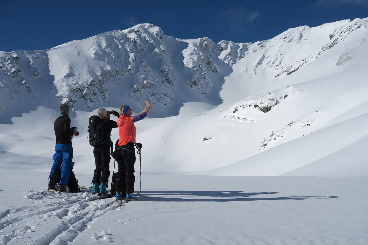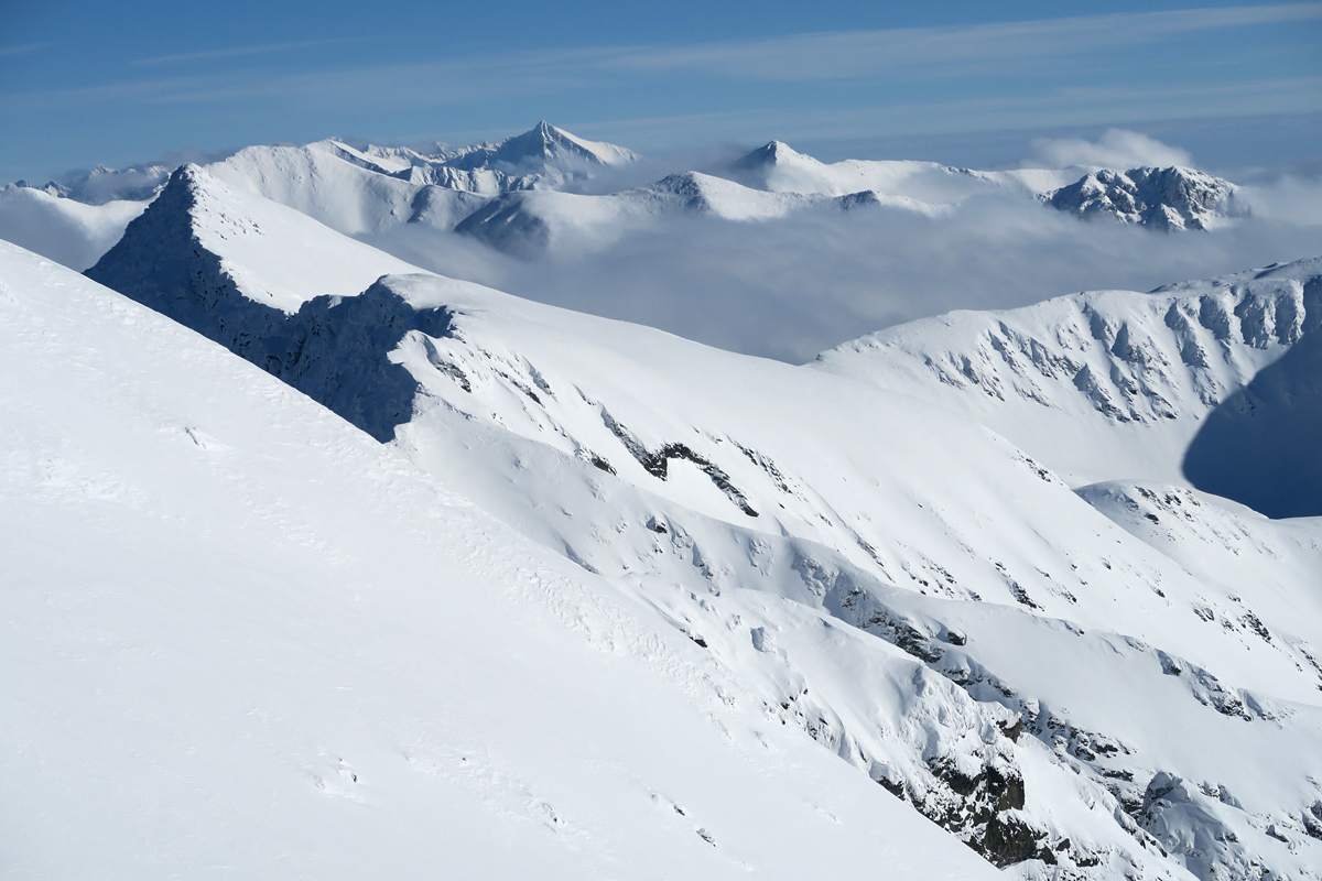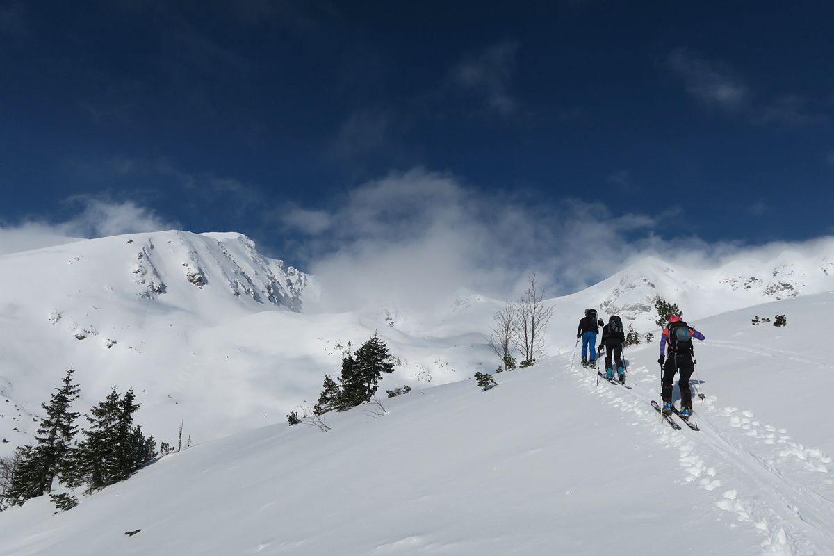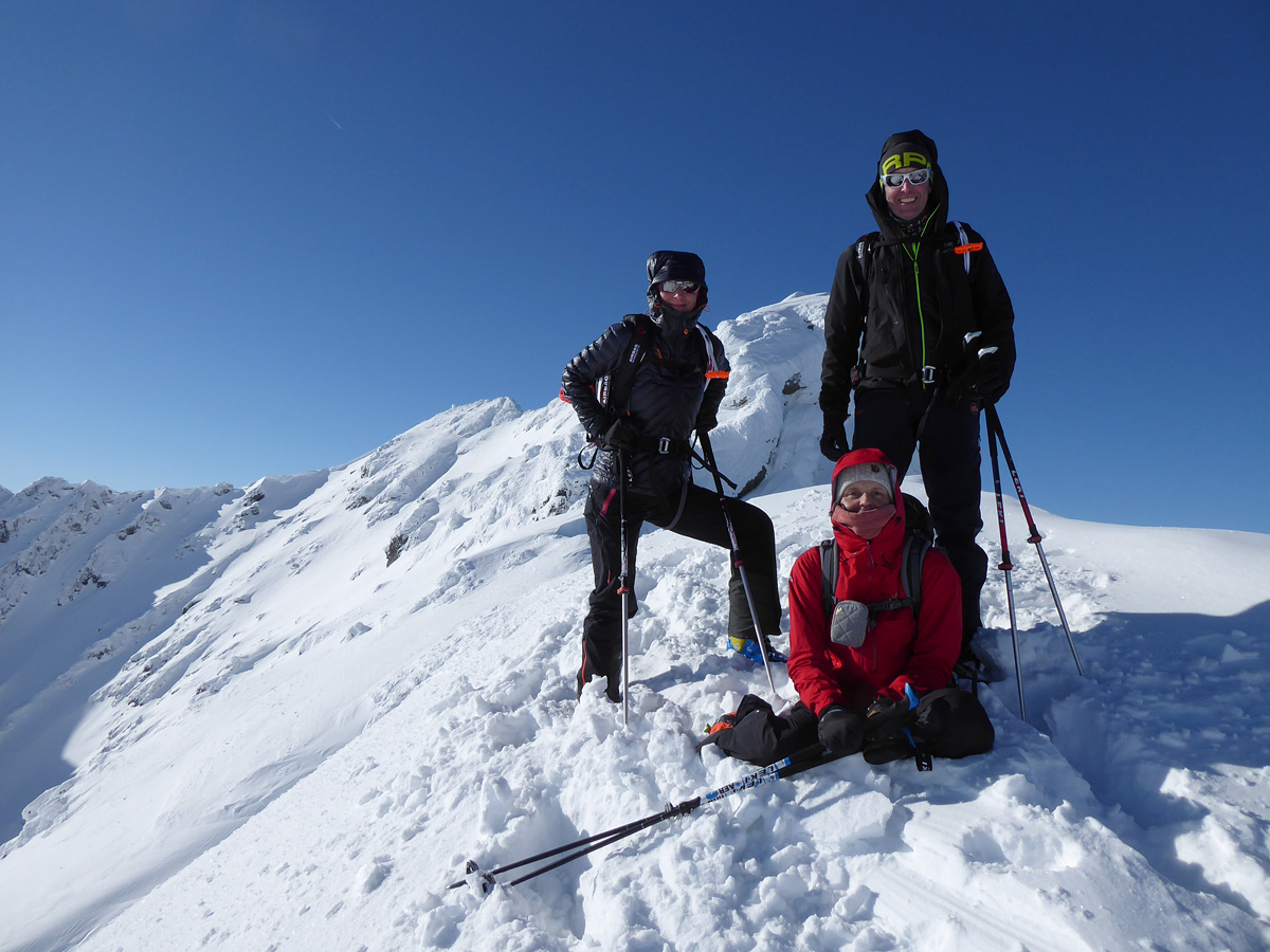 Vo výnimočných snehových podmienkach a skvelom slnečnom dni smerujeme k cieľu a užívame tento deň. Sme hore, lyže nechávame za mierneho,ale ostrého vetríka v sedle a ideme kúsok na pešo. Kocháme sa výhľadmi a za výnimočnej viditeľnosti kývame Kriváňu, Ďumbieru aj Babej hore.