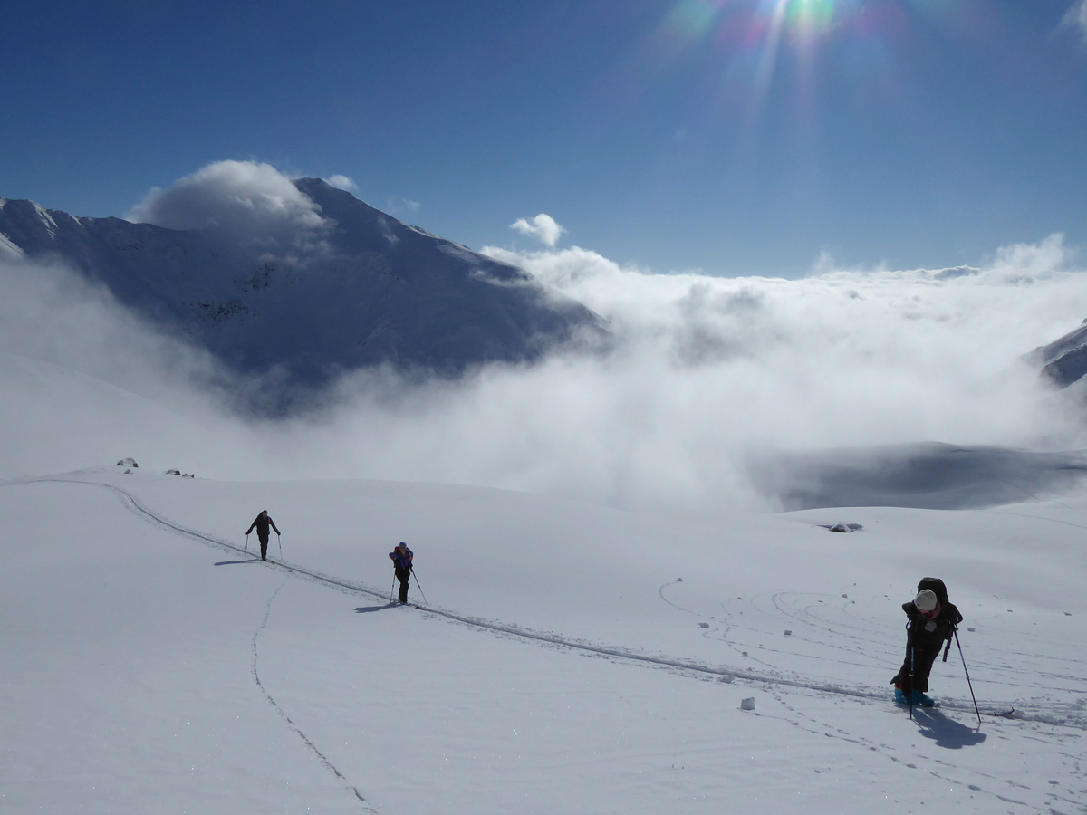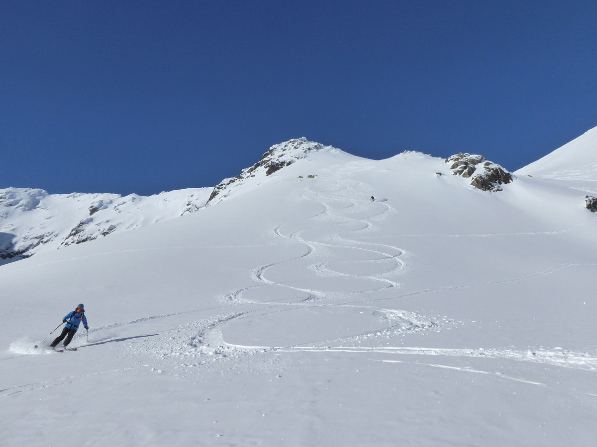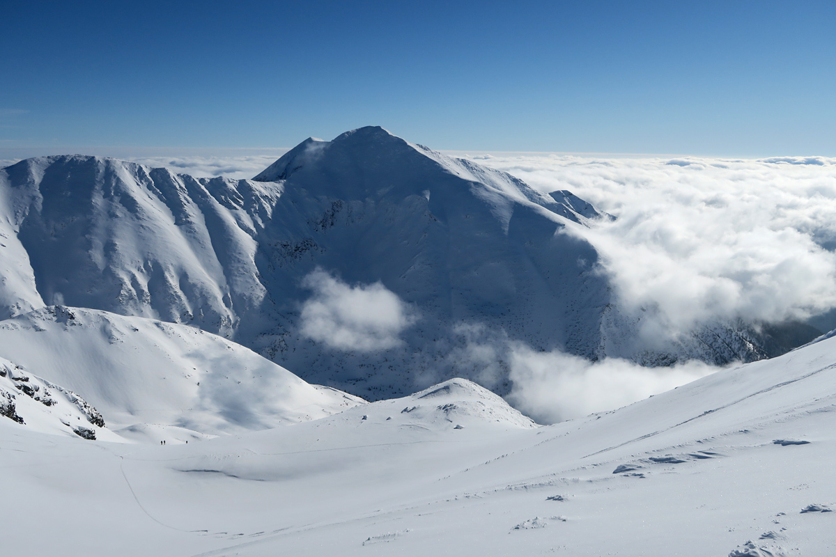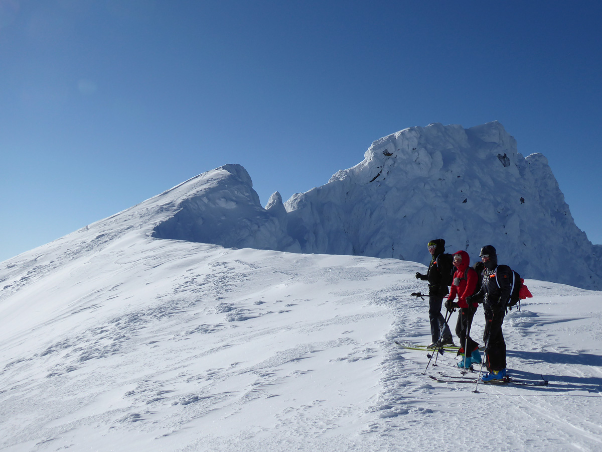 Vo výnimočných snehových podmienkach a skvelom slnečnom dni smerujeme k cieľu a užívame tento deň. Sme hore, lyže nechávame za mierneho,ale ostrého vetríka v sedle a ideme kúsok na pešo. Kocháme sa výhľadmi a za výnimočnej viditeľnosti kývame Kriváňu, Ďumbieru aj Babej hore.