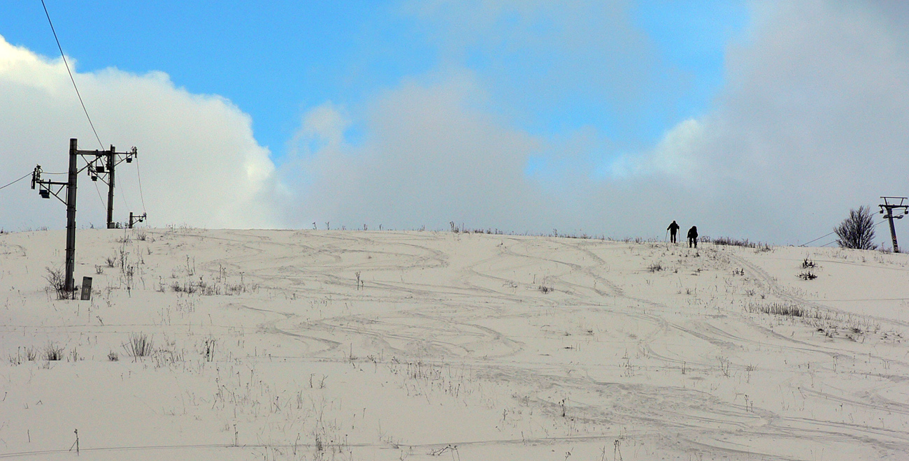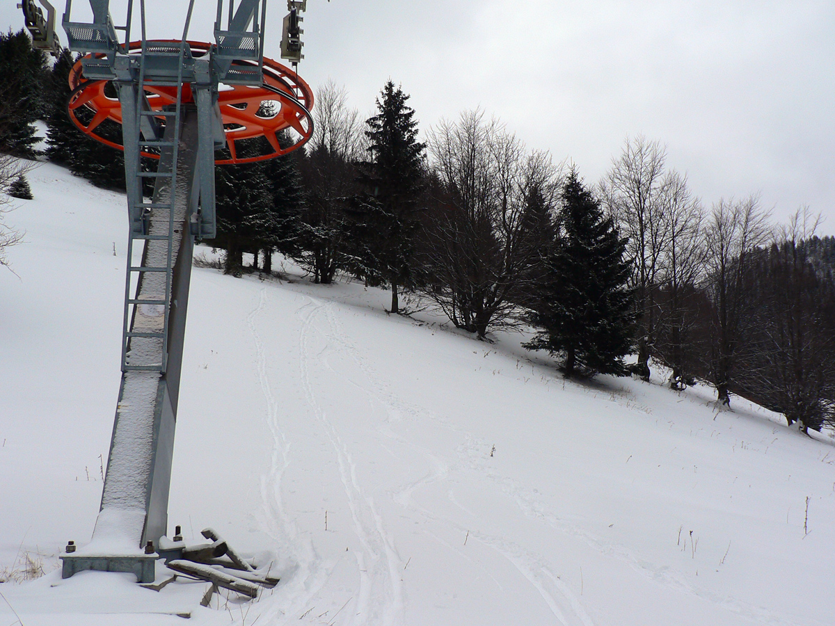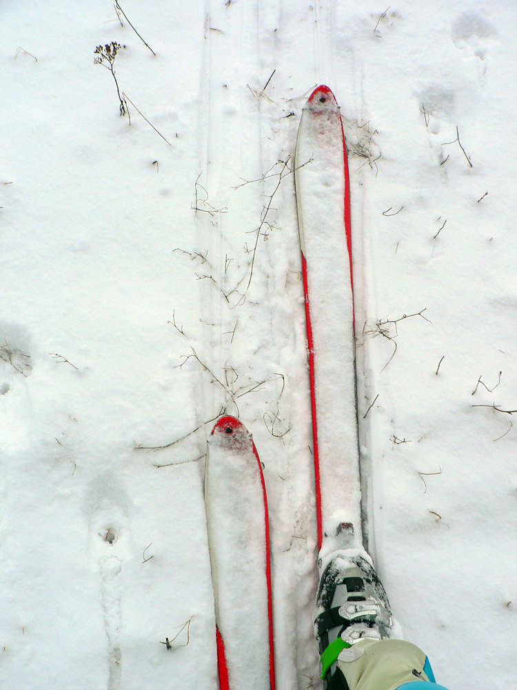 Takže: veľmi neskoré ráno, Nižné Revúce. Ignoroval som žltú značku hneď na začiatku a zamieril rovno pod vlek. Lebo tráva trčala spod snehu nahusto všade a aj na zjazdovke mi bolo hneď jasné, že cestou nazad dole to budú musieť byť veeeeľmi opatrné oblúčiky. Sneh síce prikryl nerovnosti, ale tak, že miestami 30 cm, miestami len zo päť. Zamrznuté krtince zákerne striehli!