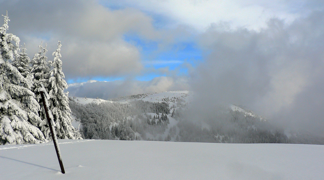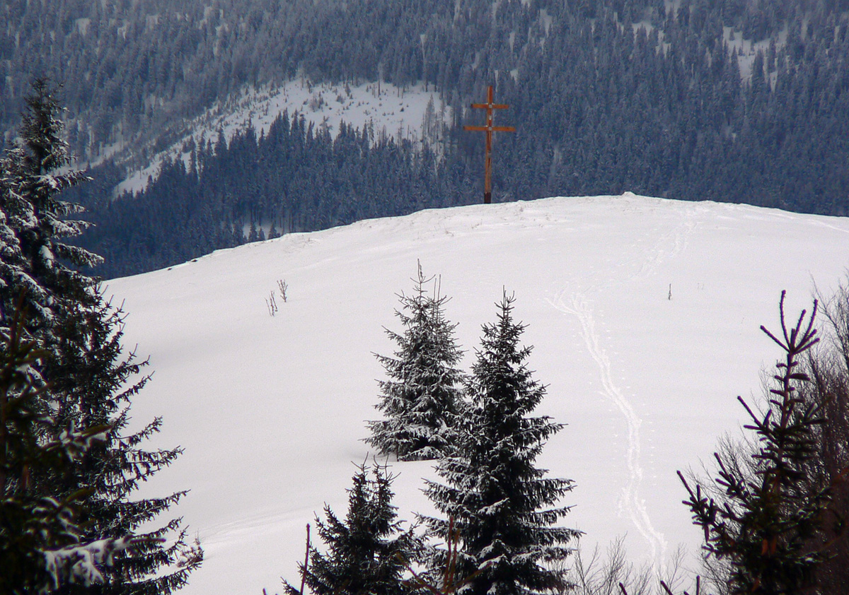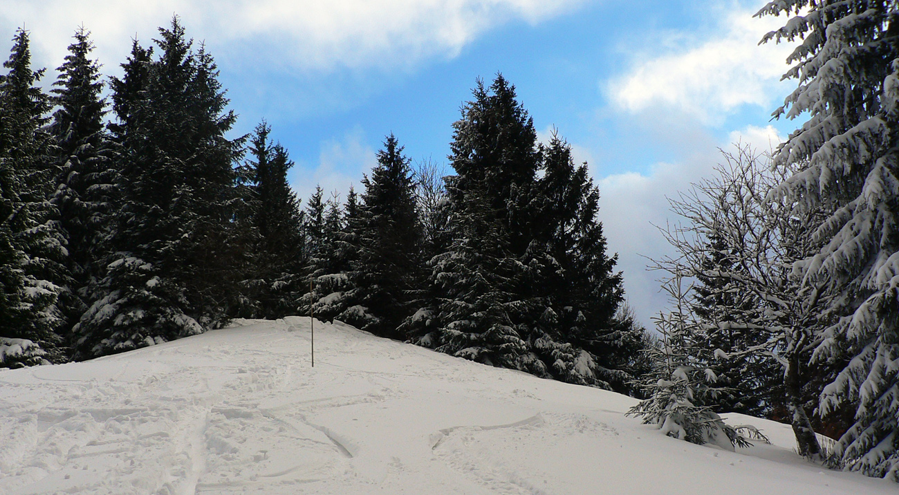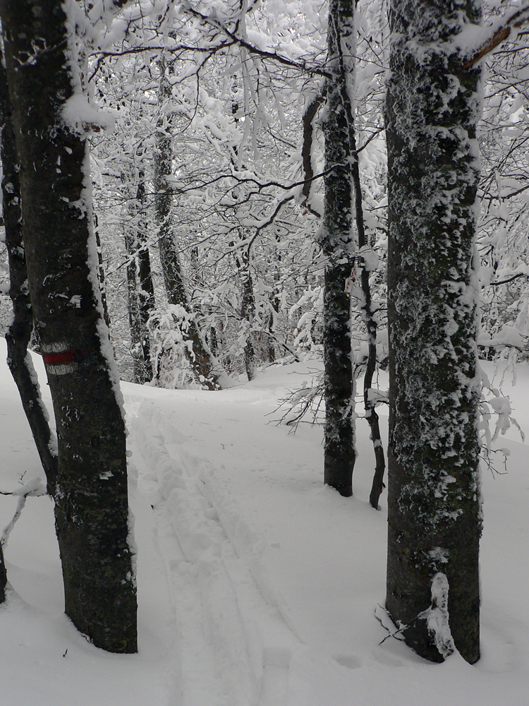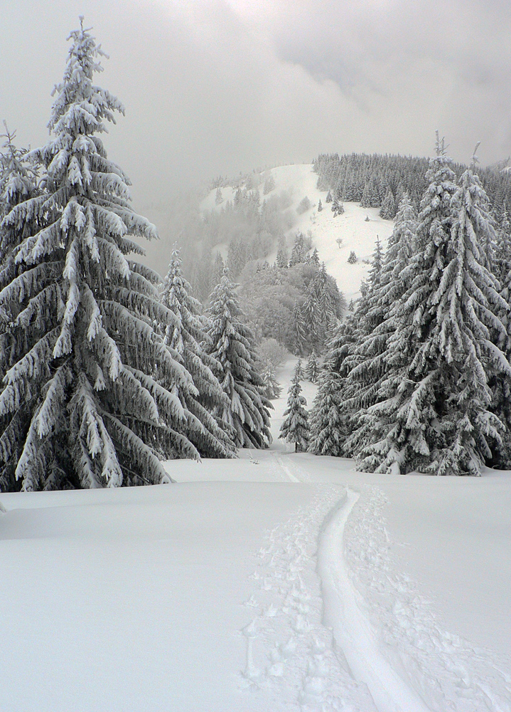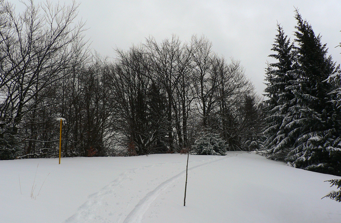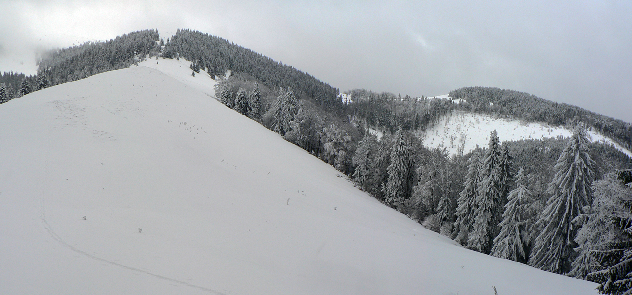 Nad vlekmi som konečne pod hrotmi palíc necítil hlinu, ale zmrznutý starý firn, v strmšom lese tesne pod Malým Zvolenom aj preveje sa vyskytli. Hore pri smerovníku už hmlisto, ale ľudsky dosť husto. Poďakoval som sa chlapom, ktorí (vraj len pre mňa) natiahli zdola čerstvú stopu (miestami aj do pol lýtok) a valil som ďalej po širokom hrebeni. Pekná tichá stopa v čerstvom, len sem tam zahrkotal ľad, kde bol sneh odfúknutý.