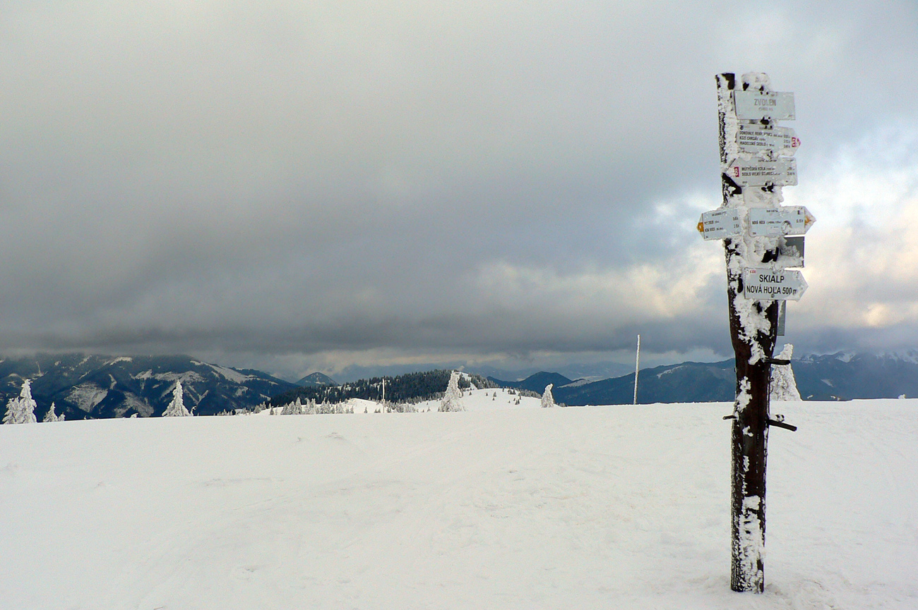 Príjemných 1403 preto, lebo mraky sedeli zakvačené na hrebeňoch Veľkej Fatry aj Nízkych Tatier, okolo Zvolena sa to ale aspoň trhalo a chvíľami bolo aj celkom do diaľok vidieť. Dokonca aj výpary ružomberskej celulózky :-) No a keďže ešte minulý víkend boli doliny suché, bolo načim vymyslieť, kade hore. Dúfal som, že po tej revúckej zjazdovke sa bude dať aj dole...
