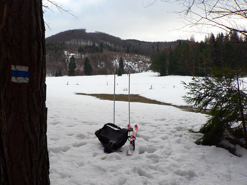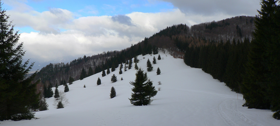 Po brutálne teplom konci februára na severe Turca poriadne ubudlo bieleho, takže po štarte z Krpelian som si veľmi rýchlo rozmyslel zachádzku cez Kopu (po žltej) a rafal som rovno do Ľubochnianskeho sedla (po modrej). Aj tak som musel chvíľu po vlastných, kým som sa dostal na sneh. Ten bol ale rýchly – zmrznutý firn, na ňom milimeter nového. Lyže robili riadny rachot :-) Ale v strmine na Nolčovské hole to výborne držalo. Na lúkach okolo Vyšného Rudna parádna, rýchla šmýkačka vpred. Sranda začala za sedlom Príslop - stúpaním na Kľak. Typická veľkofatranská kľučkovačka pomedzi mladinu do svahov, za sklon ktorých by sa ani tatranské žľaby nehanbili. Na vrchol Kľaku už som samozrejme musel s lyžami na batohu.