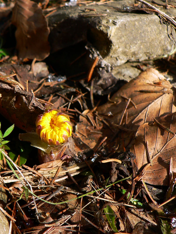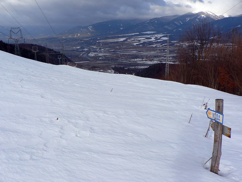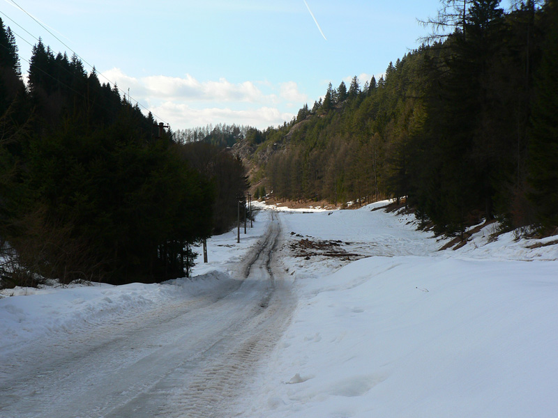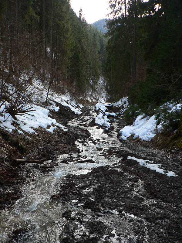 Po ľade mi síce kosti vytriaslo, ale svišťalo to statočne. O 15 minút som bol na lúkach Pod Medzijarkami. Dobrá správa: „skokanský mostík“ (cez strom, ležiaci pod Líškou cez cestu), je ešte použiteľný, aj keď už maličký :-) Zato žltá značka Slávkovou dolinou už nie :-( Južná orientácia, potok a LKT z nej spravili tankodrom. Takže zbohom autobus, ale aspoň som prvý jarný podbeľ stretol. Neostávalo nič iné, len dopešovať do Belej a dať trochu zarobiť miestnemu podniku, kým príde ďalší spoj – to bolo kofoly, do zásoby :-)