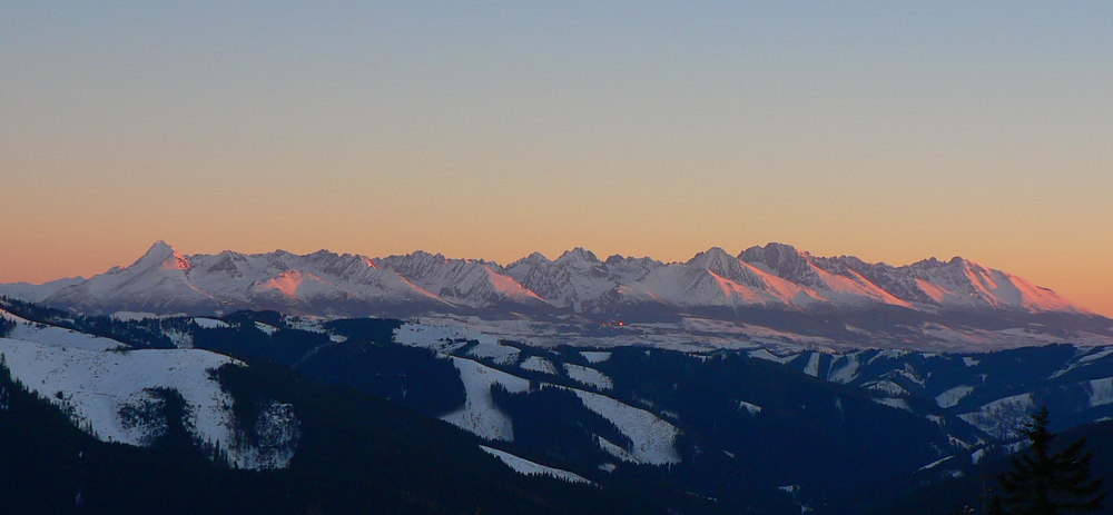 Priehyba 5:50 Po „pristátí“ v sedle zrazu začujem spod stromu zlostné mrmľanie. Žiadny medveď! Len som škrabotom lyží po kruste zobudil partiu, ktorá si užíva hrebeň na snežniciach. Ospravedlňujem sa a odtiahnem kus nabok, naliepam a „teším sa“ na strmák za cestou. Na rozdiel od Stíhačky dnes mi dajako nechutí. Že by to bolo tým, že sa tu teraz nedá najesť? :-) Vyššie nad lesom ma zastihuje svitanie, nádherné, žlto – oranžové. O kus ďalej, v stúpaní riedkym lesom na Kolesárovú, otvára sa pohľad na ranné Tatry.