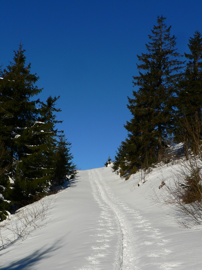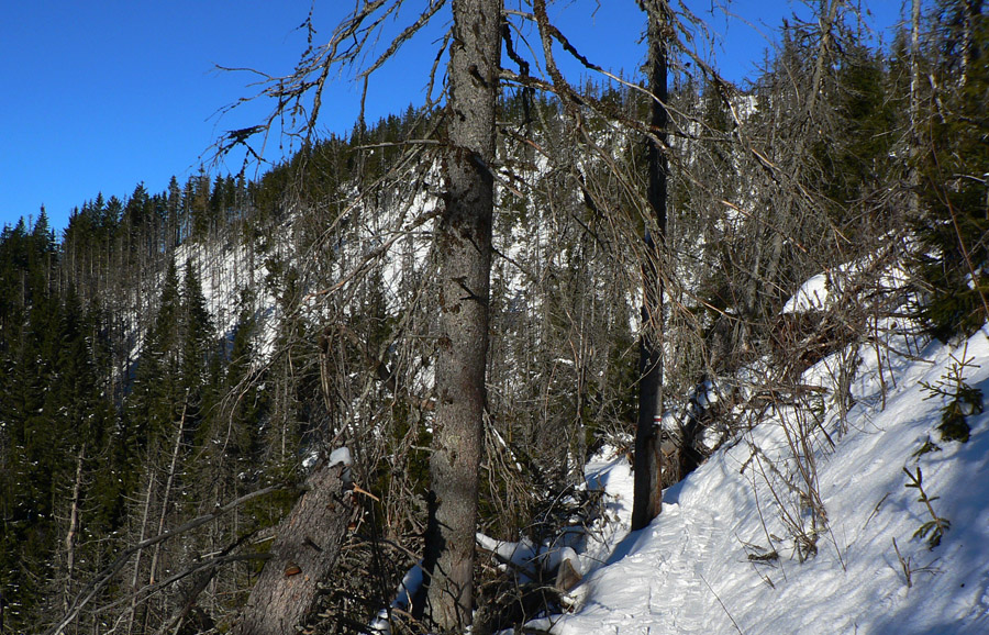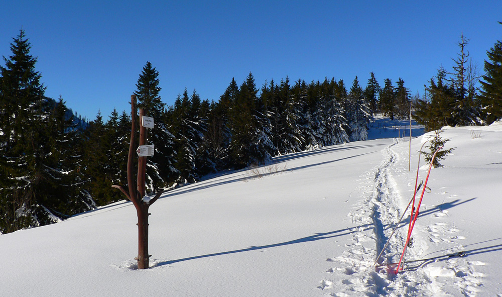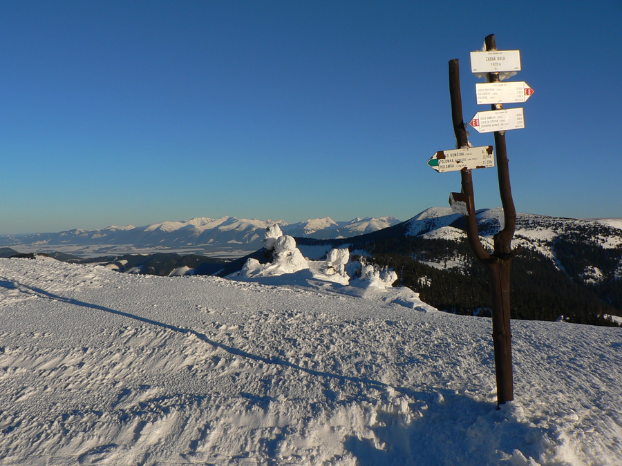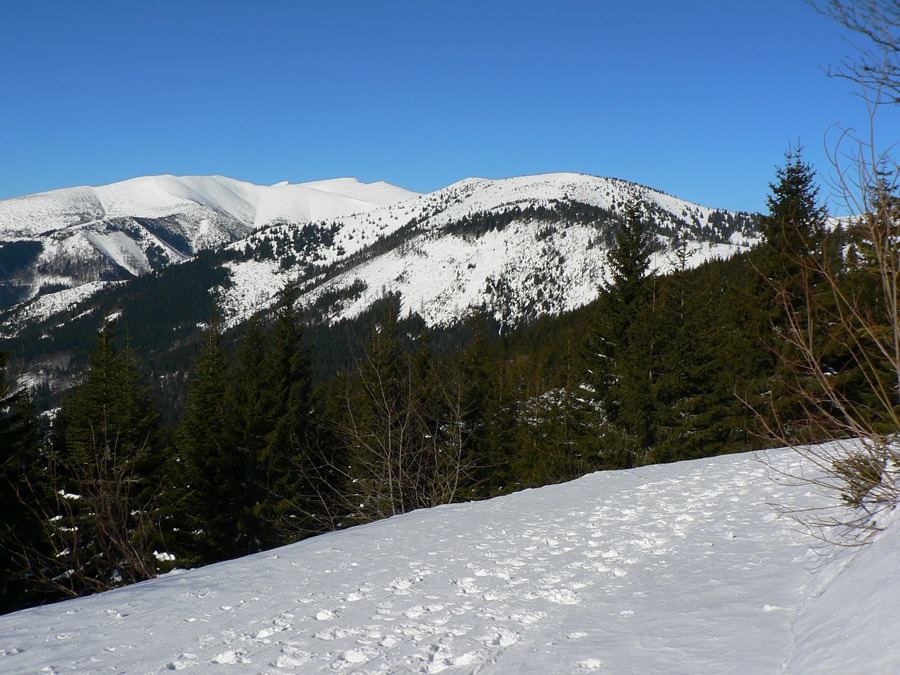 Ramža 9:30 Je čas na desiatu. Využívam slnko, ktoré hreje akurát tak, že mu môžem nastaviť chrbát, ale sneh pod pásmi ešte nie je mokrý. O chvíľu ďalej: z Jánovho grúňa sa otvára výhľad na panorámu „mesačnej krajiny“, ktorá je v bielo-čiernej zimnej kombinácii oveľa výraznejšia ako v lete. Na rúbaniskách, vystavených slnku, už sneh trocha namoká. Prvých ľudí od rána (ak nerátam spáčov v Priehybe) stretám až v Sedle za Lenivou, čo sa dosť divím, keď je tak pekne.