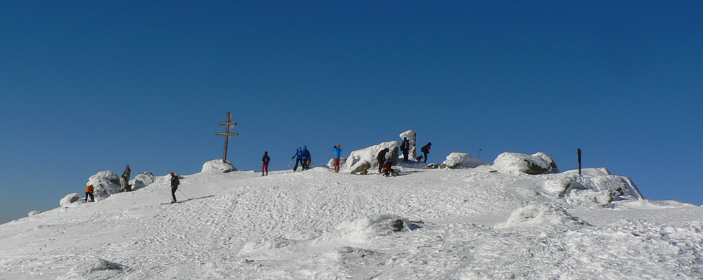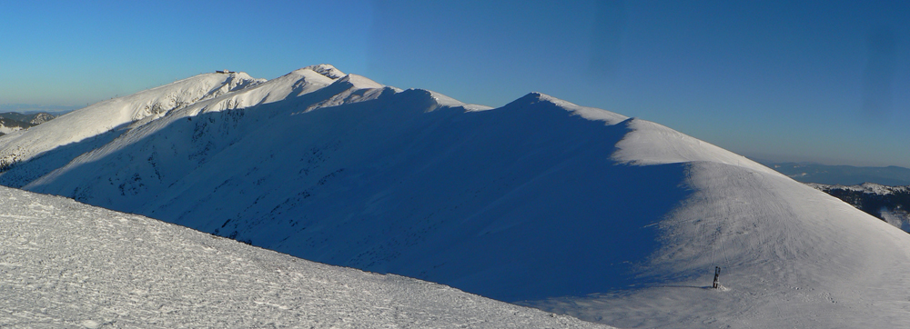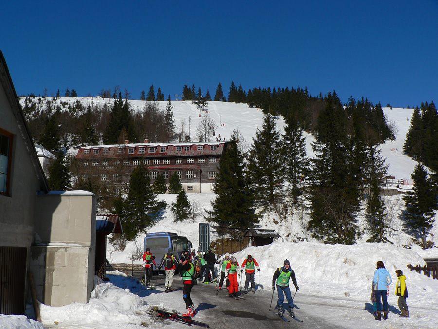 Čertovica 11:00 No myslel som si, že sem prídem skôr. Blúdenie a „koberce“ za to môžu len čiastočne. Je tu na môj vkus príliš živo, tak ani nestojím - len lyže do rúk, cez cestu a ide sa ďalej. Vlek pod Lajštrochom neťahá, tak môžem využiť tvrdú a rovnú zjazdovku – trocha pomoc na tej úvodnej strmine. Dáko sa mi zle stúpa, žeby už únava? Ani Králička do kopca mi nejako nechutí, žeby to bolo tým vetrom, čo dajako silnie? To už nie sú predpovedané nárazy do 10m/s, to už je slušný víchor. A just z JZ, čiastočne oproti a začína ma to fest brzdiť. Už viem, že celá sranda bude dlhšie trvať, ako som plánoval, treba šetriť jedlo. Ale aj dáku vzpruhu treba. Takže na Štefáničke velím: veľkú kofolu a dve horalky prosím, na stojáka :-) Pomáha a na Ďumbier (aj s podporou vetra) to už celkom ide.