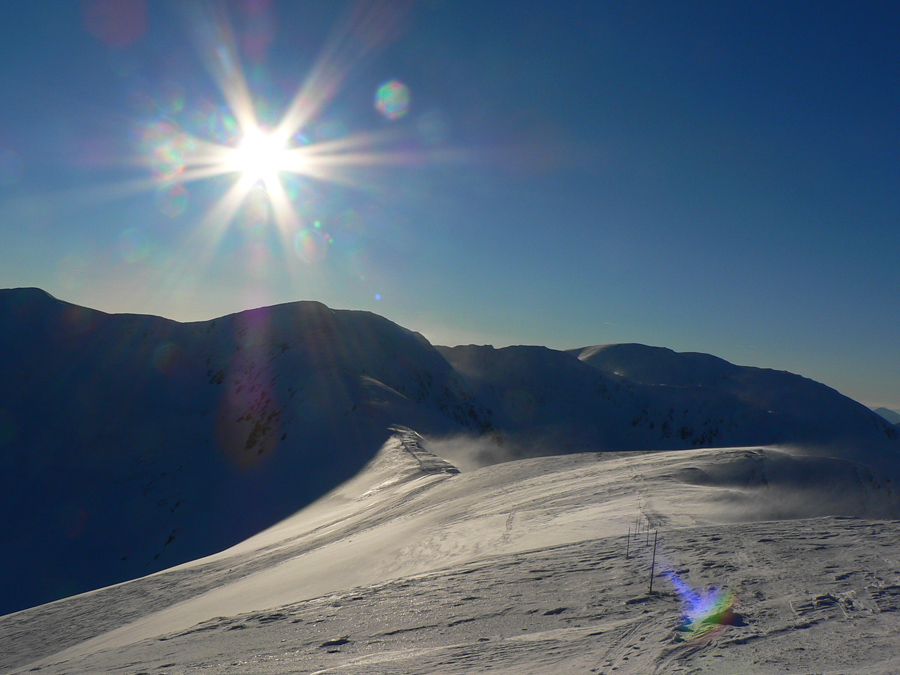 Chabenec 17:00 Zlatá hodinka v plnom prúde, slnko zapadá, ale ja fičím čo to dá, nech využijem zvyšky svetla na čo najrýchlejší presun. Vyťahovať foťák mám čoraz menšiu chuť, napriek neskutočným scenériám, podfarbeným západom slnka. Chvíľu sa pohrávam s myšlienkou prenocovať na Ďurkovej. Ale moje nádeje sa plnia, v nižších výškach fučí menej. Stále je to však morda, akú som na pásoch ešte nezažil. Začínam premýšľať, ako budú na hlave spolupracovať lyžiarske okuliare s čelovkou. O chvíľu zisťujem, že im to celkom ide. Zo Sedla pod Skalkou nevolám ako som sľúbil, aj plne nabitý telefón od zimy skapal. Tiež som ho nemusel nechávať vo vonkajšom vrecku na batohu...