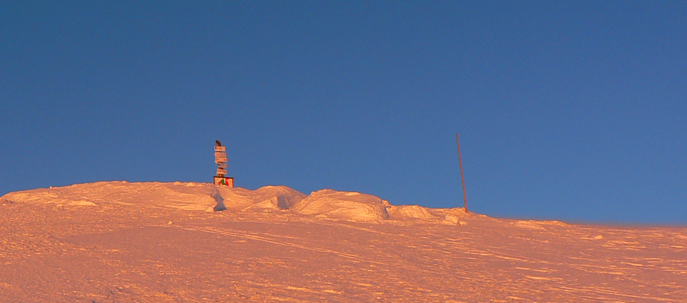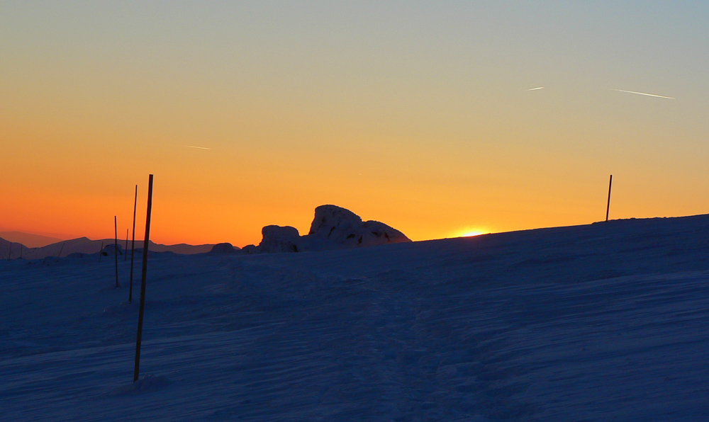 Chopok 15:00 Zaliezam do rotundy obliecť všetko čo mám, lebo keď slnko zájde, bude riadna Arktída. Už viem, že posledný bus z Donovalov nestihnem ani zázrakom (ide o ôsmej), ostáva mi len „príbuzný na telefóne“. S tým, že presný čas dohodneme neskôr. Plánujem volať zo Sedla pod Skalkou, tam je trocha závetria medzi stromami. Inak kvôli vetru nepočujem na hrebeni ani svoj hlas, v Krížskom sedle ma aj o zem šmarí. Na Kotliská sa bez haršajzní na lyžiach nedá, lyže idú na chrbát, ale tam sú zas dobrou hračkou pre vietor :-) Miestami mám problém vôbec udržať rovnováhu, už to nie je ani víchor, ale seriózny uragán. Bojujú tu so mnou aj dvaja chalani, na ťažko naložení, musia sa dostať na Ďurkovú. Hádam to dobojovali v pohode, lebo keď sa neskôr obzerám spod Chabenca, nejako ich niet. Aspoň medzi Kotliskami a Chabencom je to pod hrebeňom trochu lepšie a ľadový povrch je rýchly. Pásy dostávajú zabrať.
