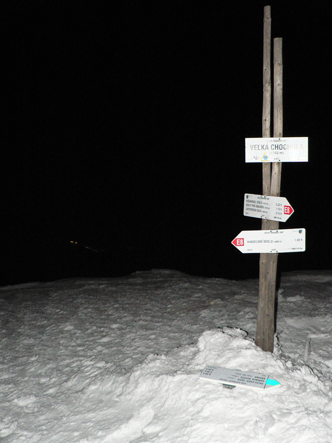 Veľká Chochuľa 20:00 S tmou dosahuje úroveň tohto masochizmu zase vyšší level :-) Táto noc už zďaleka nie je tichá, víchor hučí ako rýchlik v tuneli - ale to ma už neodradí ani náhodou. Aj keď som zvedavý, ako prežijem na Prašivej, kde mi bude duť priamo oproti. Že mám toho už dosť, o tom svedčí pocitovo nekonečné stúpanie na Košarisko. Na priamu stopu už sily nemám a tá časť serpentín, ktorá je oproti vetru, to sú dva kroky vzad a jeden vpred. Aspoň že hore je to lepšie, ako som si myslel – predsa len, pri sile vetra hrá úlohu aj reliéf. Preto asi práve hrebene a sedlá nad závermi severo-južne orientovaných dolín boli na tom dnes najhoršie. Začínam sa pre zmenu obávať lyžovačky z Prašivej, na jej južných svahoch isto „čarovalo“ so snehom slnko a za tmy a s unavenými nohami to bude chuťovka. V závetrí konečne štartujem telefón a dohadujem si „poslednú pomoc“.
