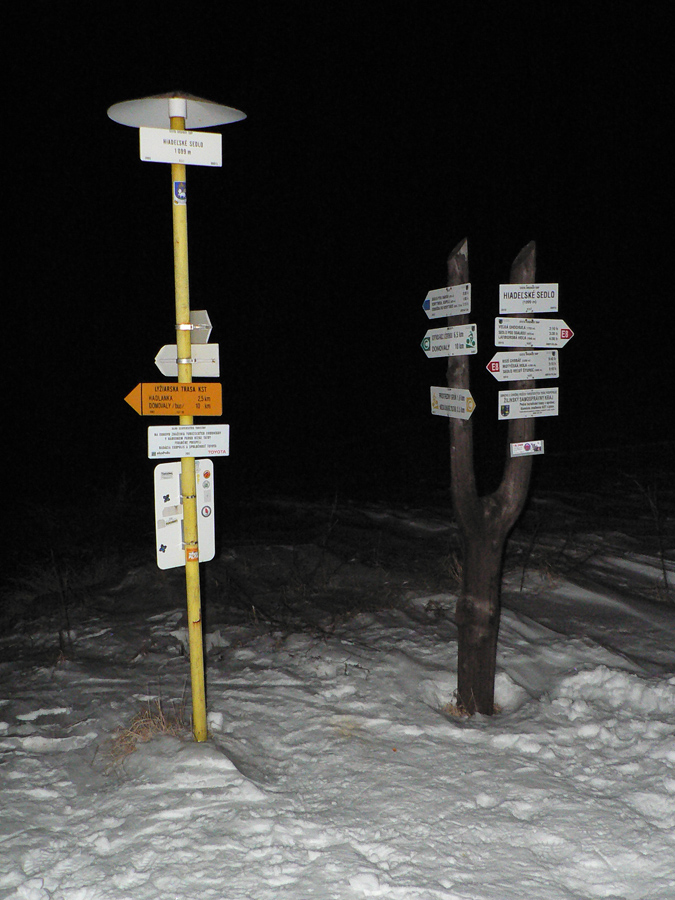 Hiadeľské sedlo 21:30 Nakoniec som akosi prežil aj ten posledný zjazd. Nad lesom to nakoniec bolo celkom pohodlné - po zmrznutej síce, ale nie ľadovo klzkej kôre. V lese už o dosť horšie, striedanie závejov sypkého snehu, tenkej odpornej krusty a ľadu, napadaného zo stromov. Aj som na chvíľu špekuloval, či to radšej nezbehnúť s lyžami na chrbte, ale otlačené chodidlá v značnom štádiu rozpadu ma odradili. Dole v sedle som s vďakou odmietol lákanie odrazky pod lesom, ktorá ma vyzývala pokračovať po červenej cez Kozí chrbát. Mal som dojem, že ani chodník nie je prešliapaný, ale aj tu pri predstave pešovania hore kopcom s lyžami na batohu posledné slovo mali otlaky. Traverzom po žltej to bolo o dosť príjemnejšie, stopa prechodená. O tom, že meliem z predposledných síl, svedčili zas pocity - o nekonečnosti a strmosti lúk medzi Hadľankou a Kečkou, ktoré inak považujem za príjemnú prechádzku. Takéto pocity som mal naposledy pri prvej Stíhačke. Ale potom už len zošup na Špongu, posledné malé stúpania lesom a už sa veziem po lyžiarskej ceste v ústrety cieľu.