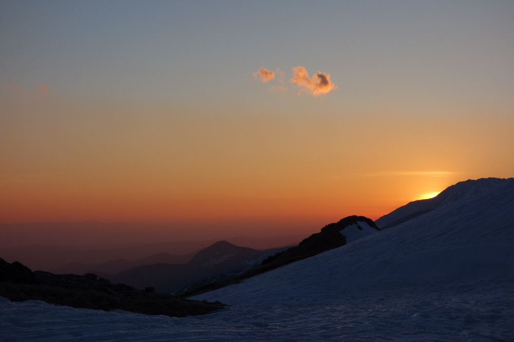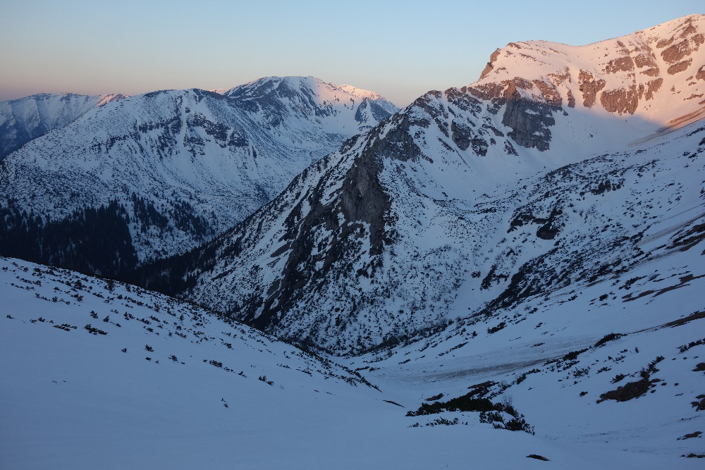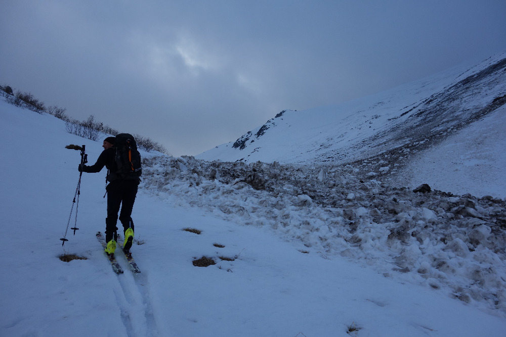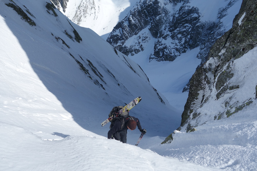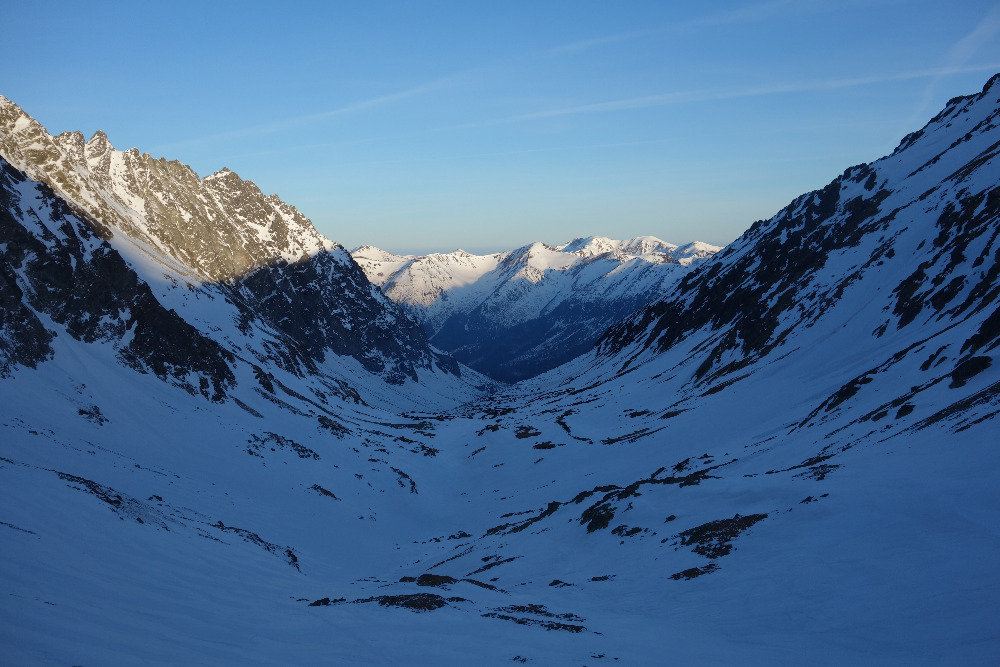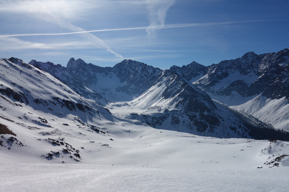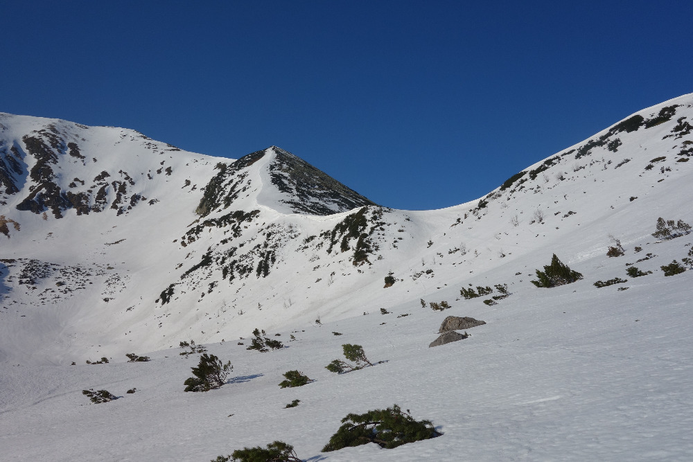 Lavínovo sme sa vybáli na Ornaku, kde sme trochu nechcene improvizovali a netrafili ideálnu líniu. Nakoniec sme z priestoru vycúvali a zobrali to cez už vytopenú Iwaniacku Przelecz, pomedzi poľské nedeľné páriky v teniskách a šortkách. Až na túto"skratku" a vytopené západné úbočie Rákoňa bola celá trasa na snehu s výnimkou drobných prenášačiek, ktoré sa pritrafia aj v strede zimy.