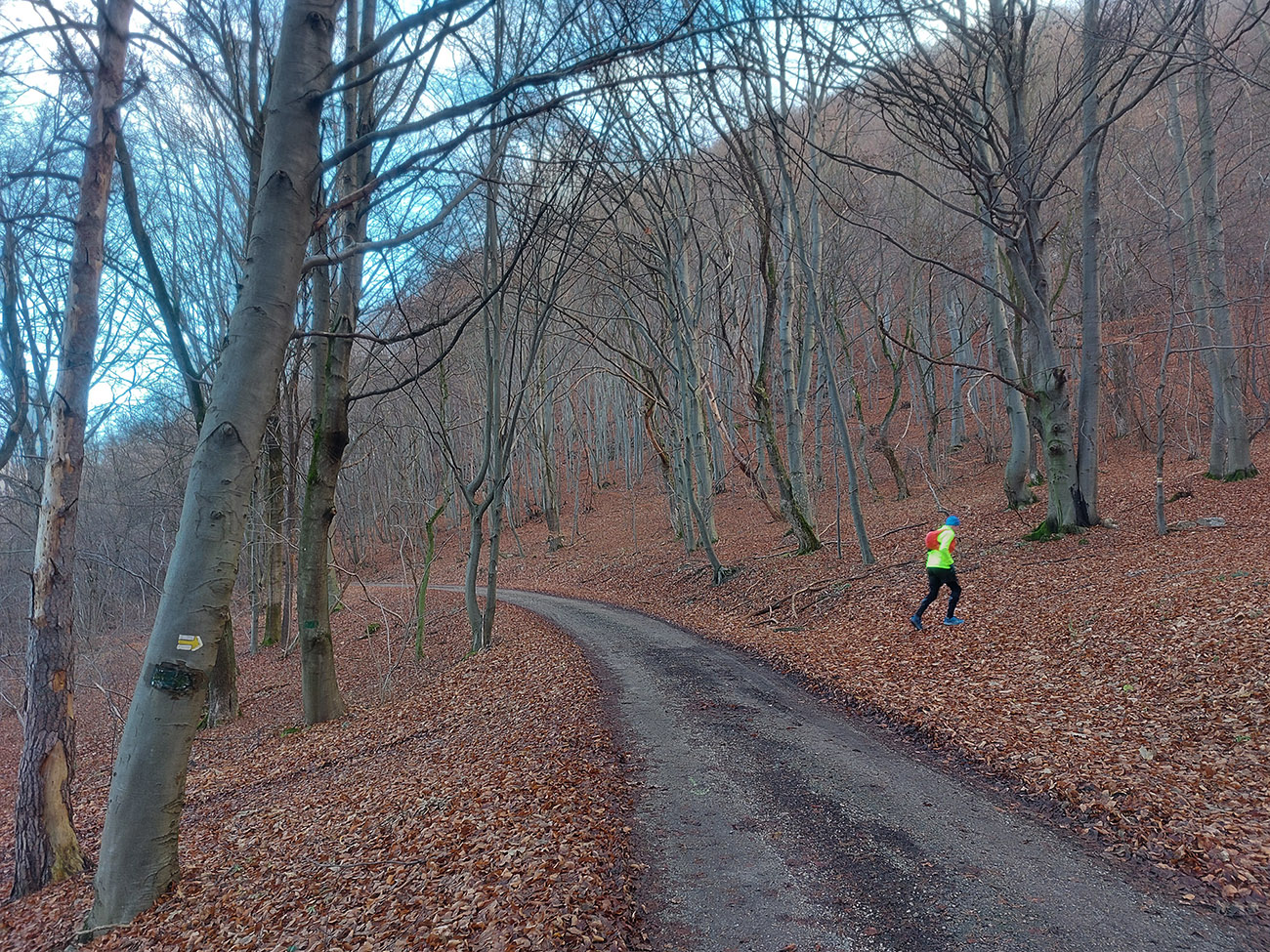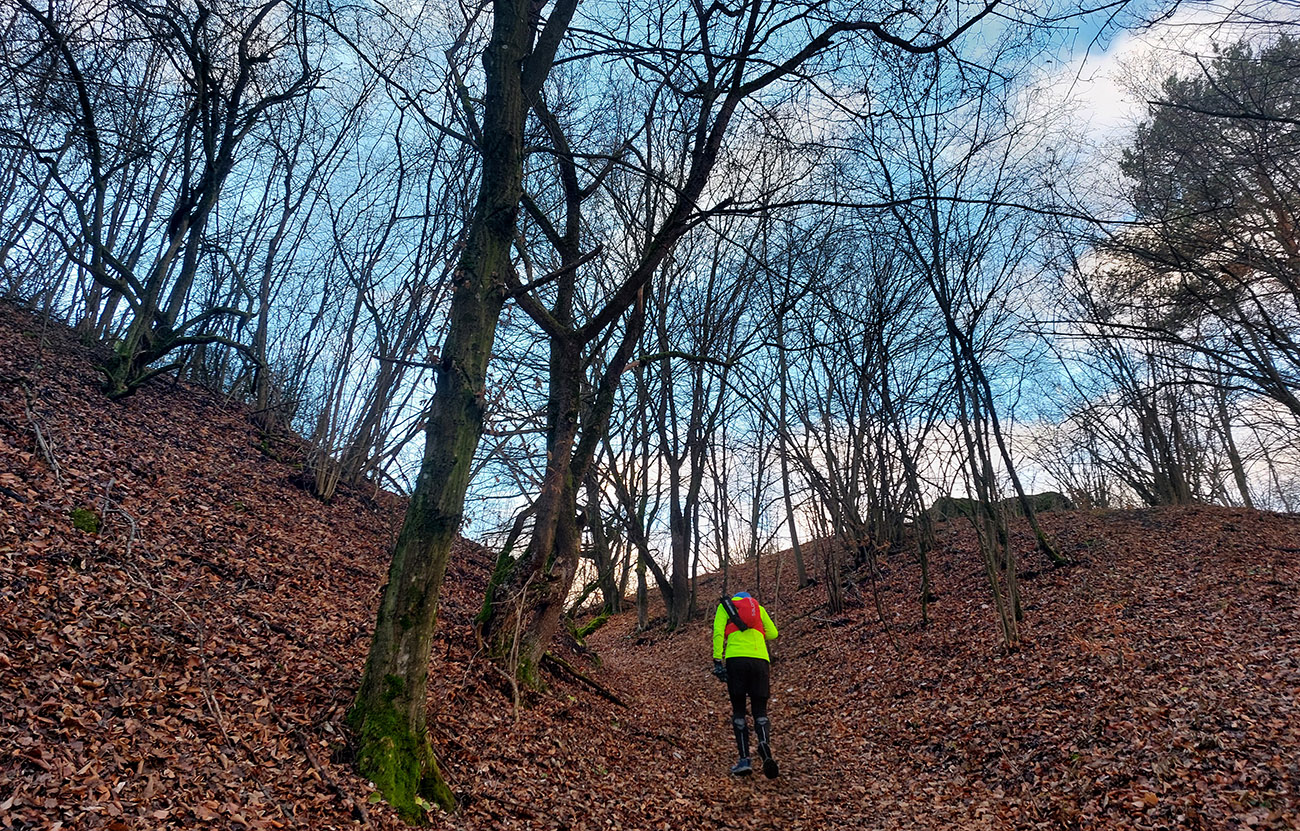 Takže z Ilavy plynulé stúpanie až pod Sokol po veľmi príjemnej lesnej ceste až chodníku (odkedy sme sa oslobodili od asfaltu) – len nie po žltej značke, ale vyššie nad ňou po takej paralelnej lesnačke. Na Sokol potom strmo po vlhkej hline a lístí. Odmenou bol výhľad na slnko vyliezajúce spoza Vápča rovno do mrakov.