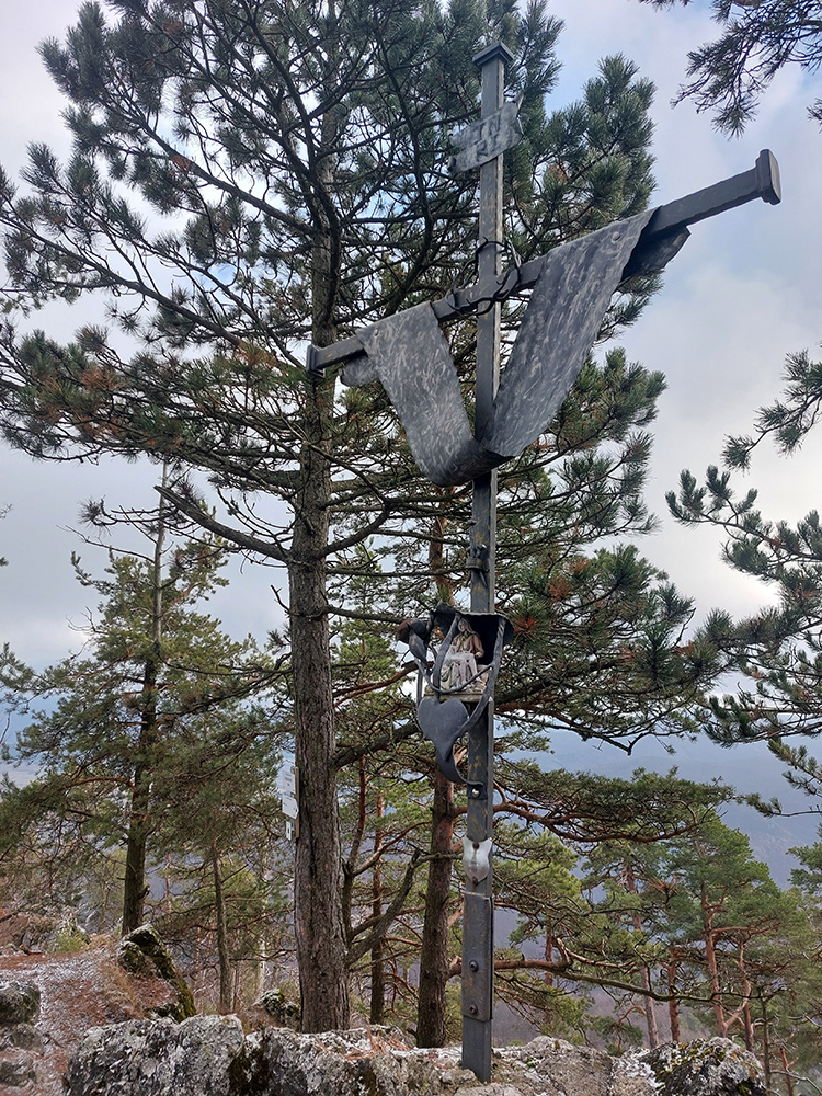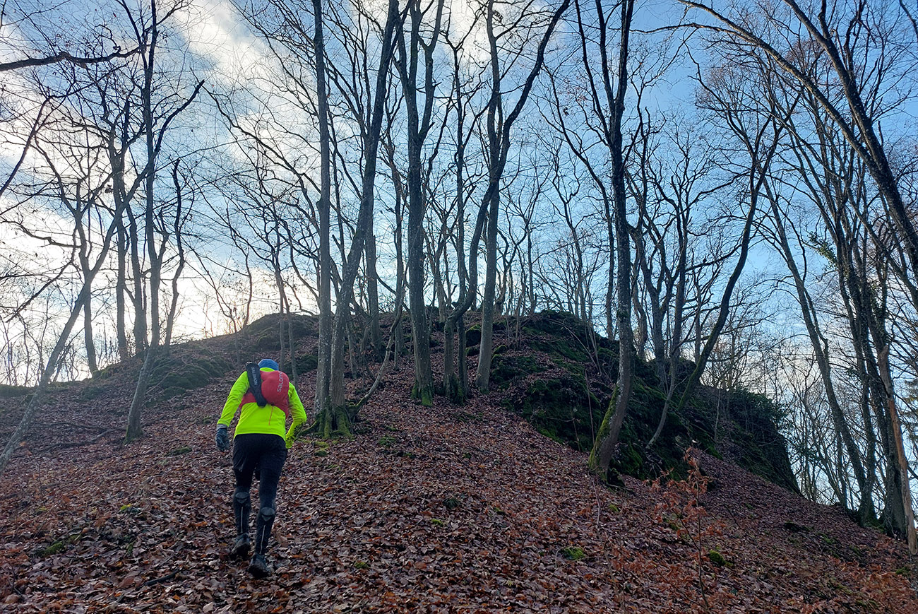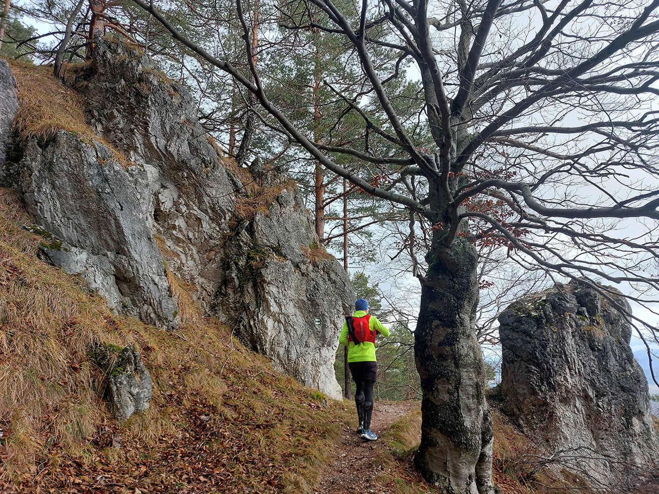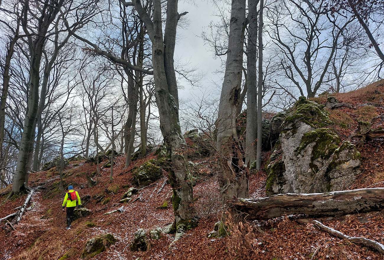 Zo spomínanej lesnej asfaltky pod Rohatou skalou zrazu žltá zavelila vpravo vbok a už sme sa plazili hore strminou, navyše v závejoch lístia alebo po klzkom blate, no rozkoš. Potom výhľadová skalka na predýchanie, ešte na záver „rohatá ferata“ (alebo teda pomocné reťaze na vrcholových bralách) a odmenou boli znovu rovnaké výhľady na Považie ako z tej skalky, akurát že „z vyššieho poschodia“.