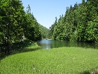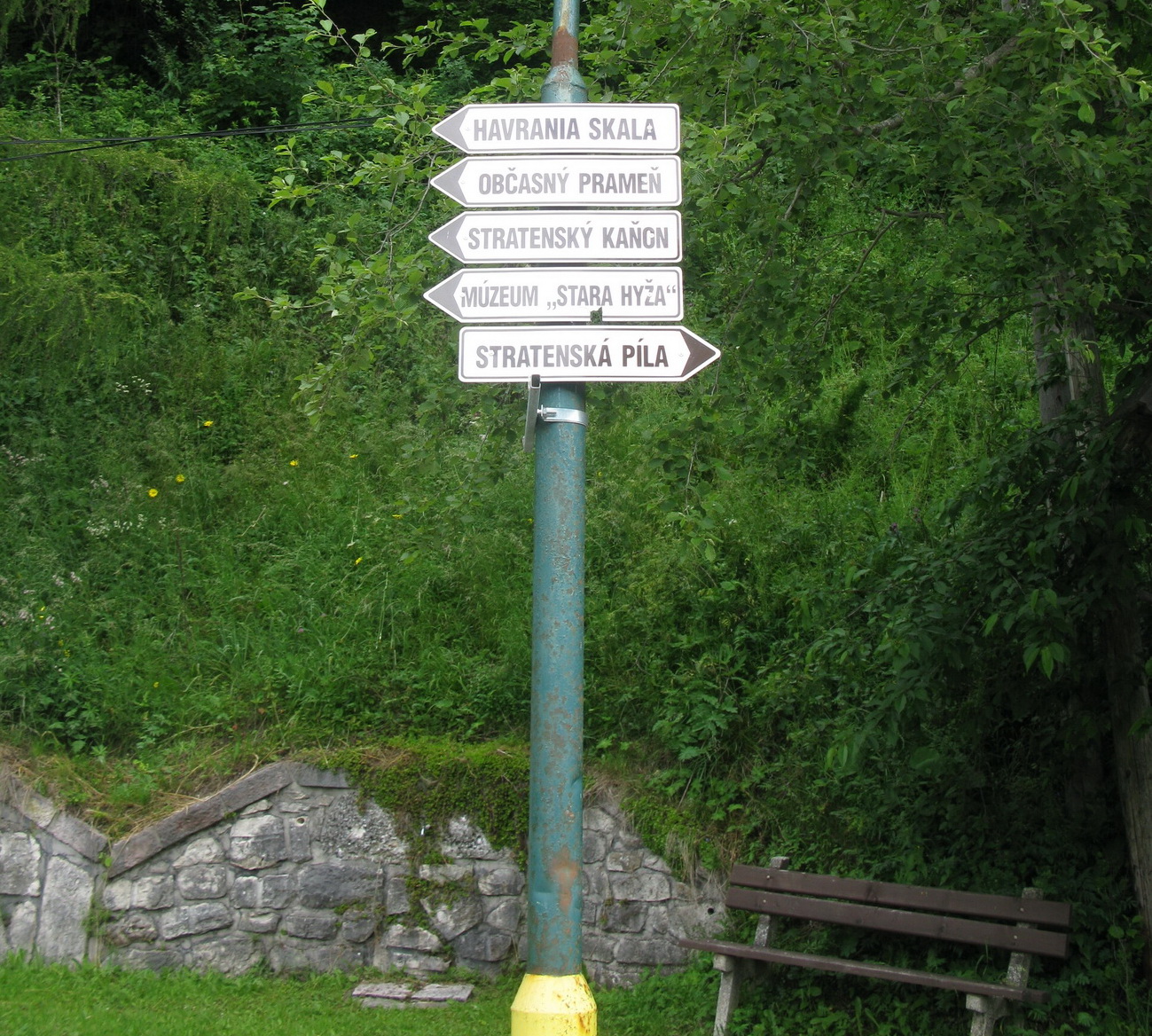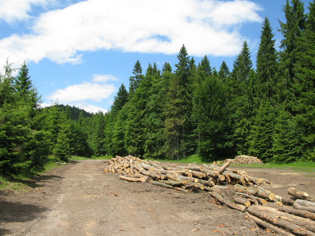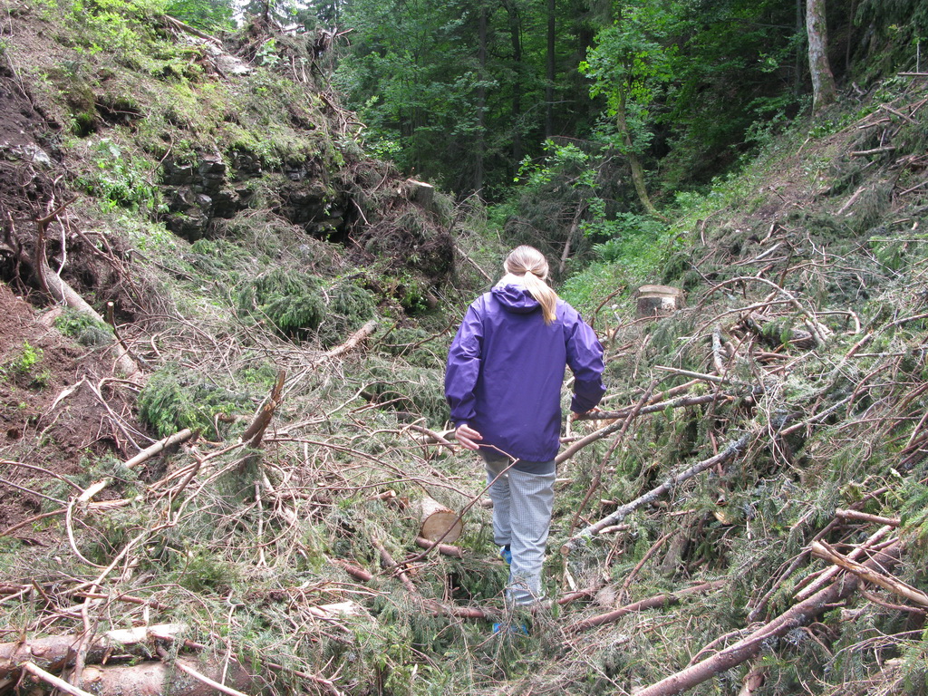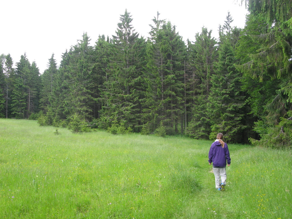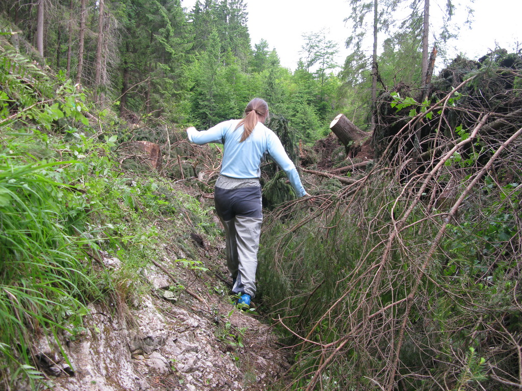 Naspäť sa vraciame po žltej značke. Zostup je miernejší a pohodlnejší, ako keby sme mali ísť naspäť tou istou trasou. Na lúke, ktorá momentálne slúži ako skládka dreva, sa žltá so zelenou len tesne míňajú. Rozhodujeme sa neísť do Stratenského kaňonu, ktorý jazdíme často na bajku, ale po lúke sa dostaneme naspäť na zelenú, po ktorej sme prišli.