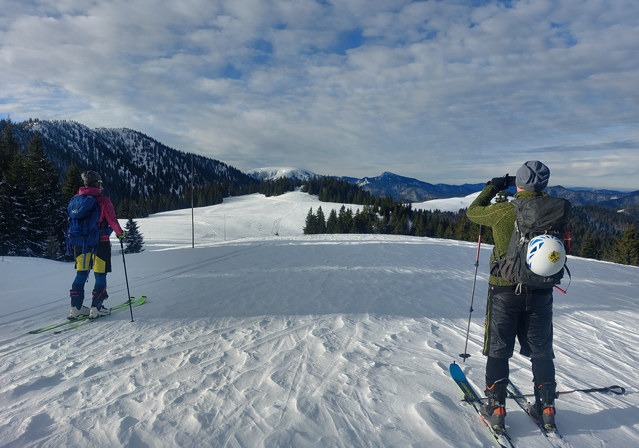Lyžovačka od kríža po východnom rebre smerom k Limbe prekvapivo dobrá – na drsnom a tvrdom, ale takmer rovnom podklade. Občas snehová doska, nižšie už to na slnku vlhlo. Tak sme len zatočili doľava, na žltú značku, nalepili a davaj nazad do sedla. Tam je chodník pešiakmi z Limby predupaný poriadne.