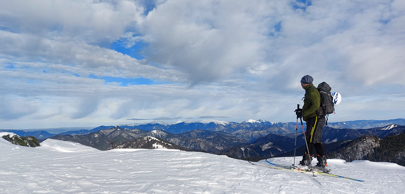 Prvý cieľ, že smer juh. Na tvrdom, starom ľade jemný poprašok od skoro nuly po dákych 10 cm, niekde vietor aj viac navial. Pásy išli tichúčko a mäkkúčko. Front v nedohľadne, teplota málo pod nulou, slnko takmer na plný výkon, dohľadnosť ďaleká, paráda! Rozhodli sme sa skúsiť Rakytov, aj keď najprv bola v hľadáčiku Ploská: