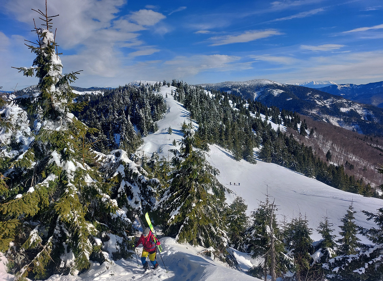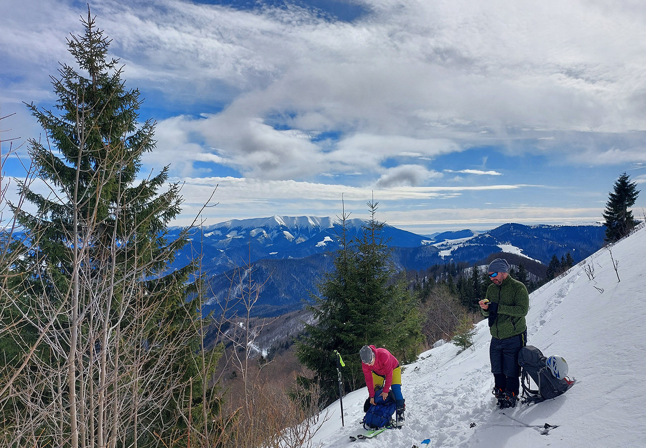 Traverz pod Rakytov komfortný (až na pár spartanských prekážočiek) – nový poprašok pomohol. Aj v strmších cikcakoch do Severného rakytovského sedla. Potom hore na vrchol radšej komfortnejšie s lyžami na hrboch – strmé je to, úzke a miestami ľadové. Machri to ale dávali na pásoch celé.