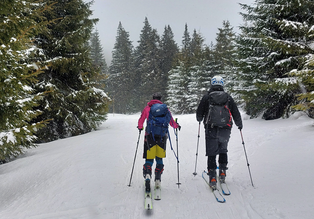 Na vyhliadke na Skalnej Alpe už viditeľnosť skoro nijaká, tak sme len odlepili a skľučkovali muldou cez záveje k zákrute na Močidle. V pláne bola síce ešte aj samotná Smrekovica, lebo jej lúka na severne orientovanom svahu vyzerala z diaľky chrumkavo, ale vraj síl už nebolo. Tak koniec, zamierili sme po ceste a po bežkárskych tratiach nazad k autu a potom do Granitu ten parkovací biznis spraviť. A končili sme v pravej vianočnej metelici :-)