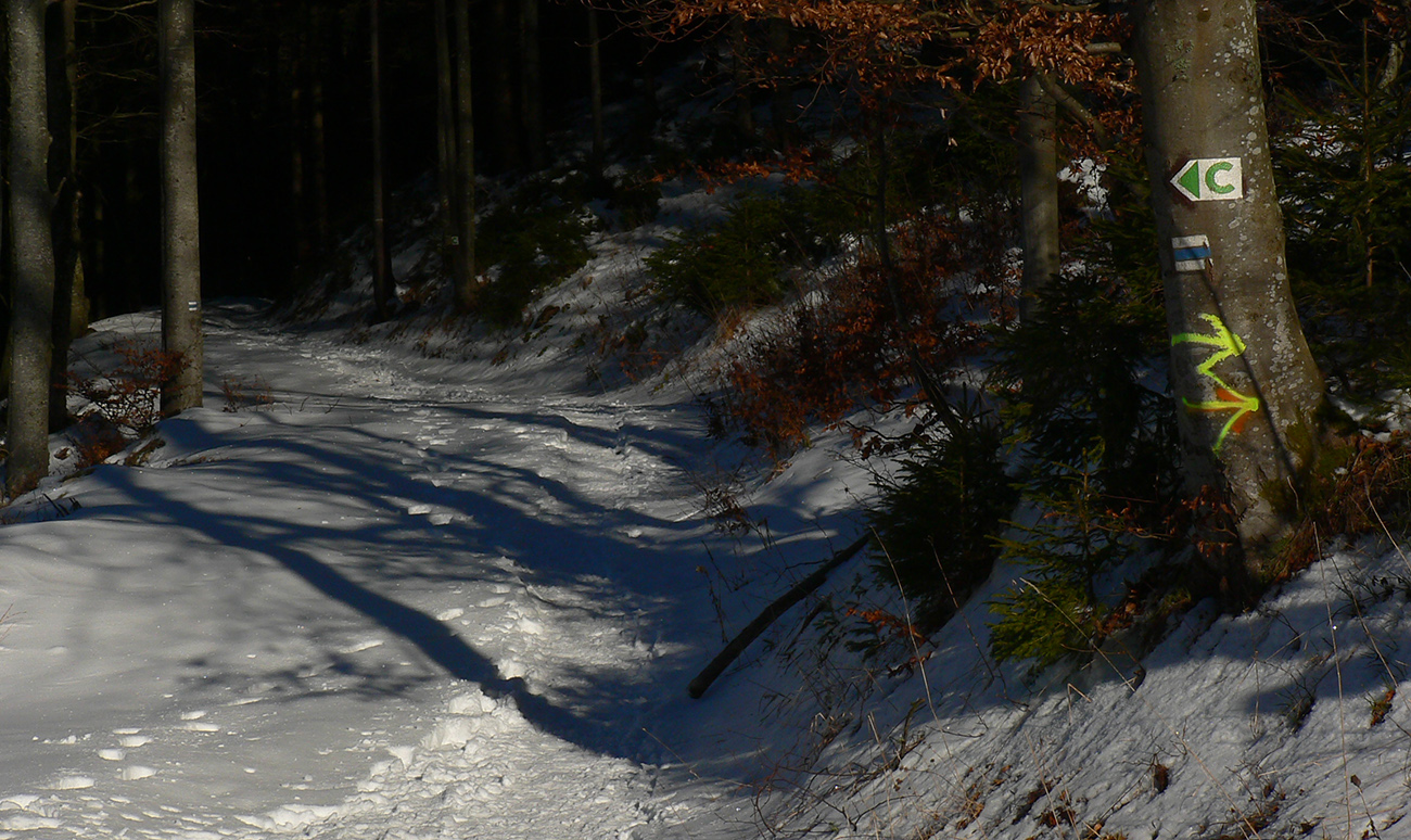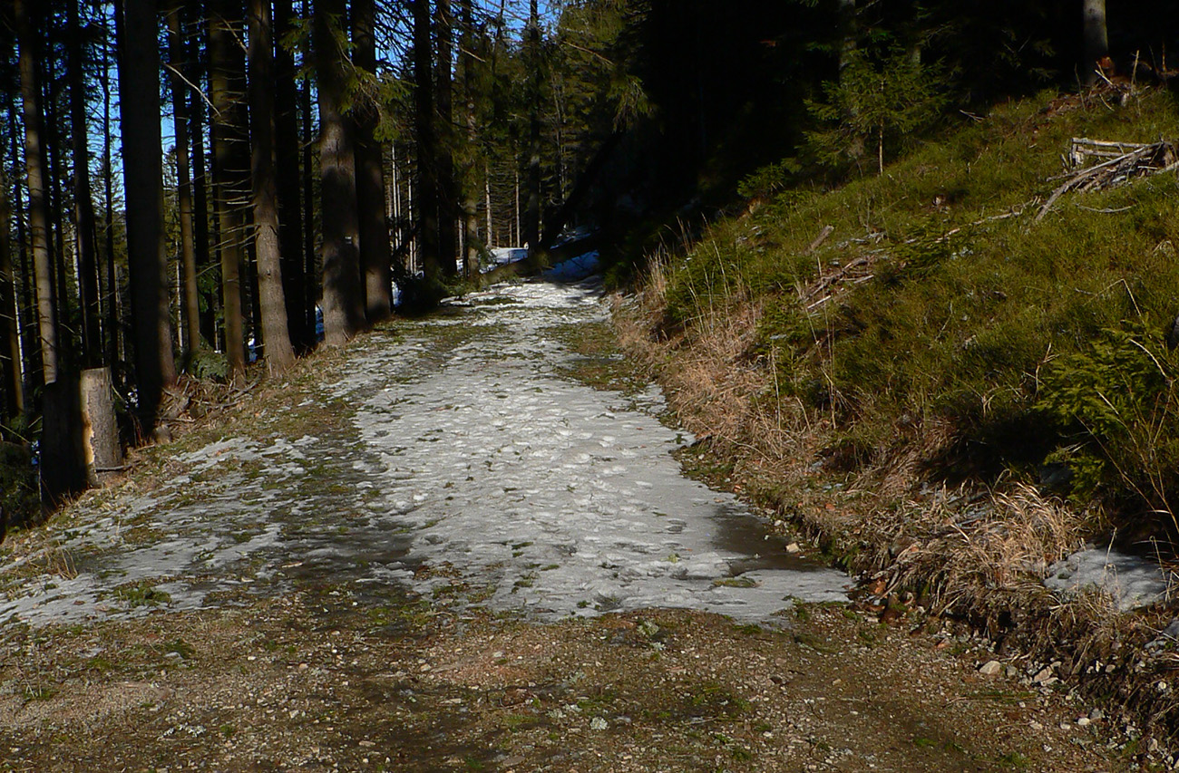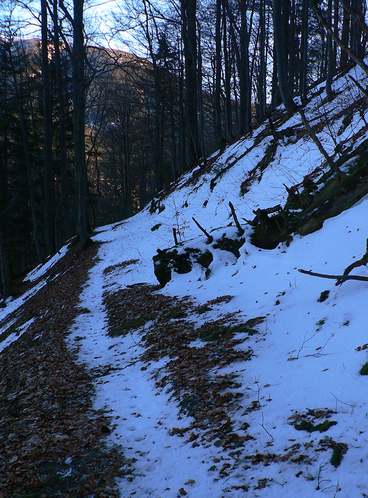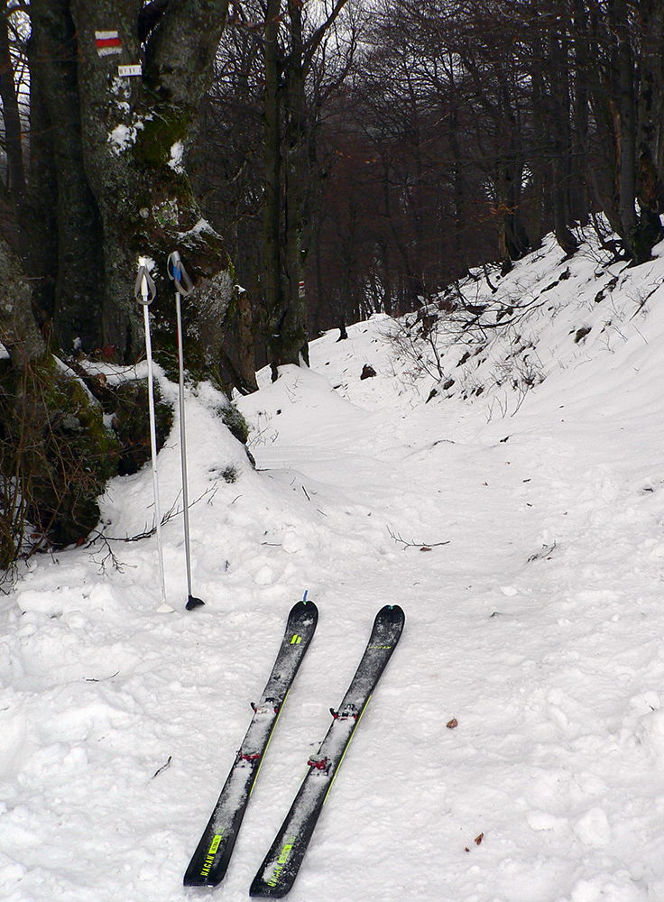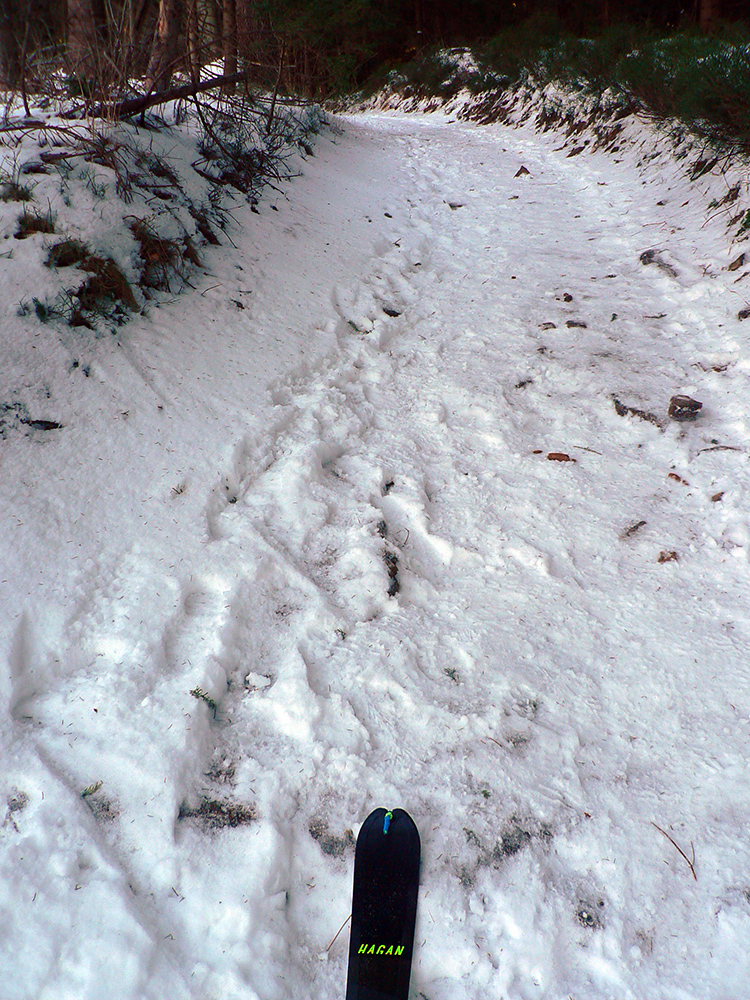Najtragickejšie na pohľad to vyzeralo z Kečky smerom ku Koziemu chrbtu, ale žliabok s chodníkom pekne snehom vyrovnaný a udupaný, miestami aj povedľa sa dalo, tak celkom pohoda. Kozí chrbát samozrejme nula, ale jeho traverz po žltej až na výnimky dobrý – lebo na svahoch pod stromami síce snehu málo, ale vietor ten zárez chodníka snehom pekne zarovnal. Len raz som prenášal – tam kde prameň cez cestu tečie.