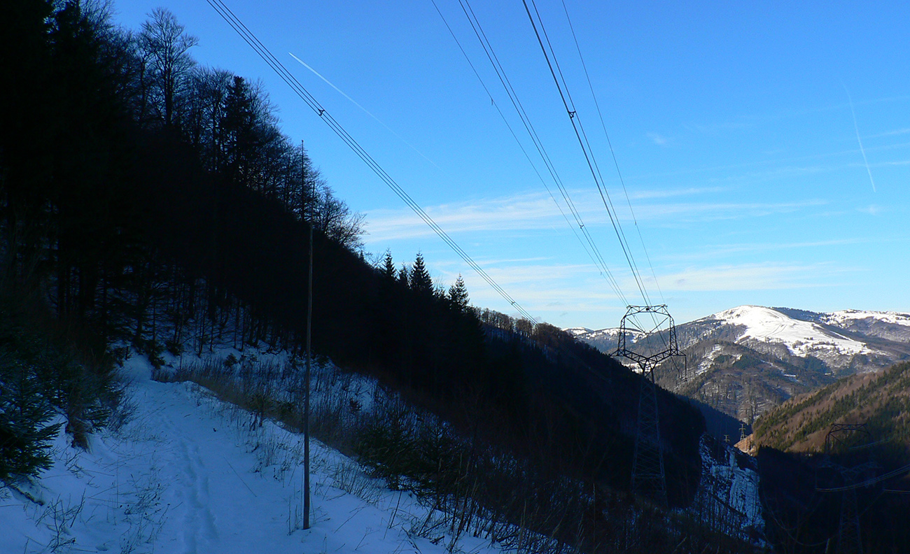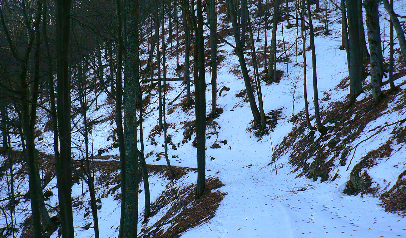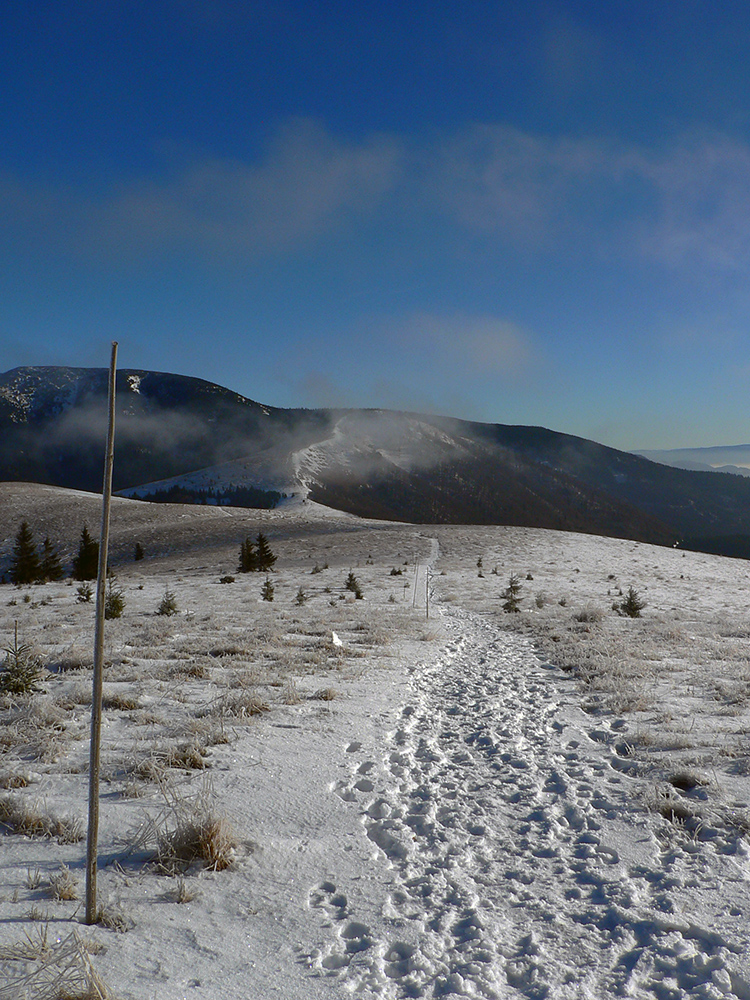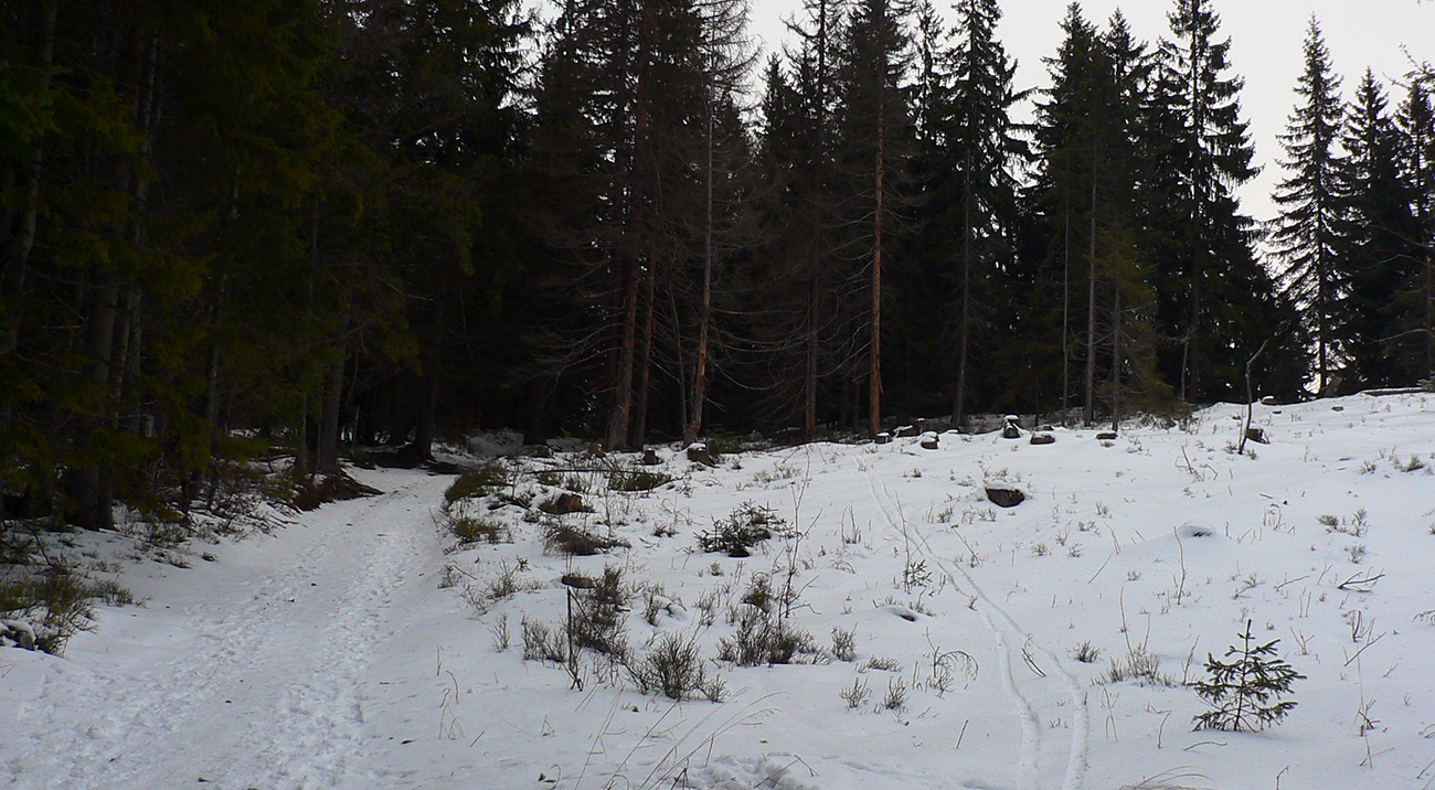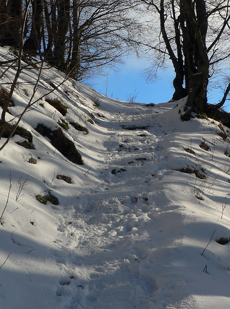 Najtragickejšie na pohľad to vyzeralo z Kečky smerom ku Koziemu chrbtu, ale žliabok s chodníkom pekne snehom vyrovnaný a udupaný, miestami aj povedľa sa dalo, tak celkom pohoda. Kozí chrbát samozrejme nula, ale jeho traverz po žltej až na výnimky dobrý – lebo na svahoch pod stromami síce snehu málo, ale vietor ten zárez chodníka snehom pekne zarovnal. Len raz som prenášal – tam kde prameň cez cestu tečie.