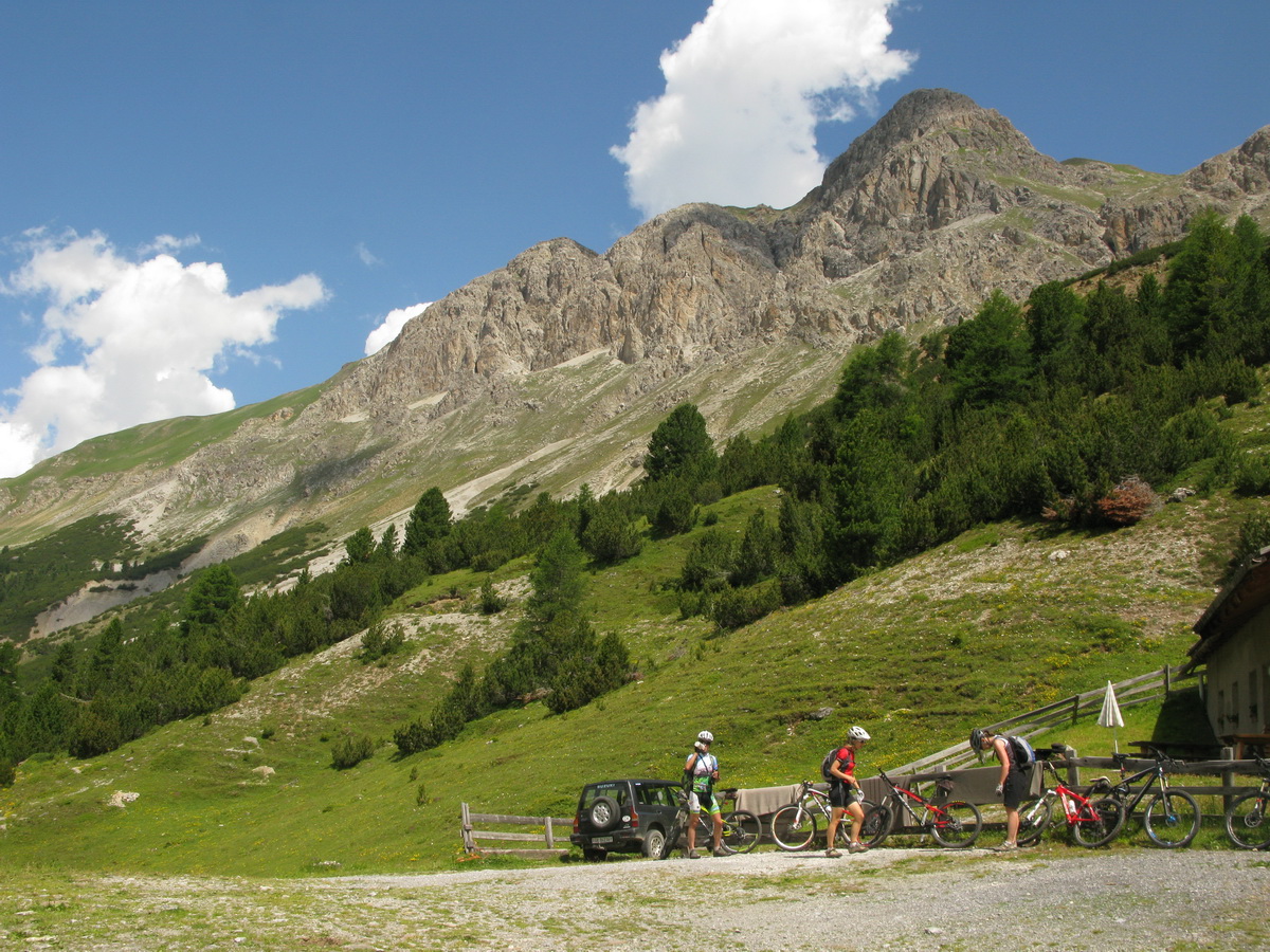 Zjazdujem dole Val Roseg. Ranné lúče už hrejú. Cez voľný deň v žiadnom prípade nehrozí skoré ranné vstávanie. Napájam sa na cyklotrasu, vedúcu údolím Engadin, a pohodlne sa po rovine približujem k môjmu cieľu: doline Chaschauna. Toto dlhé údolie, hraničiace so švajčiarskym národným parkom, by ma malo doviesť až na hrebeň, za ktorým sa už rozprestiera Talianske Livigno.