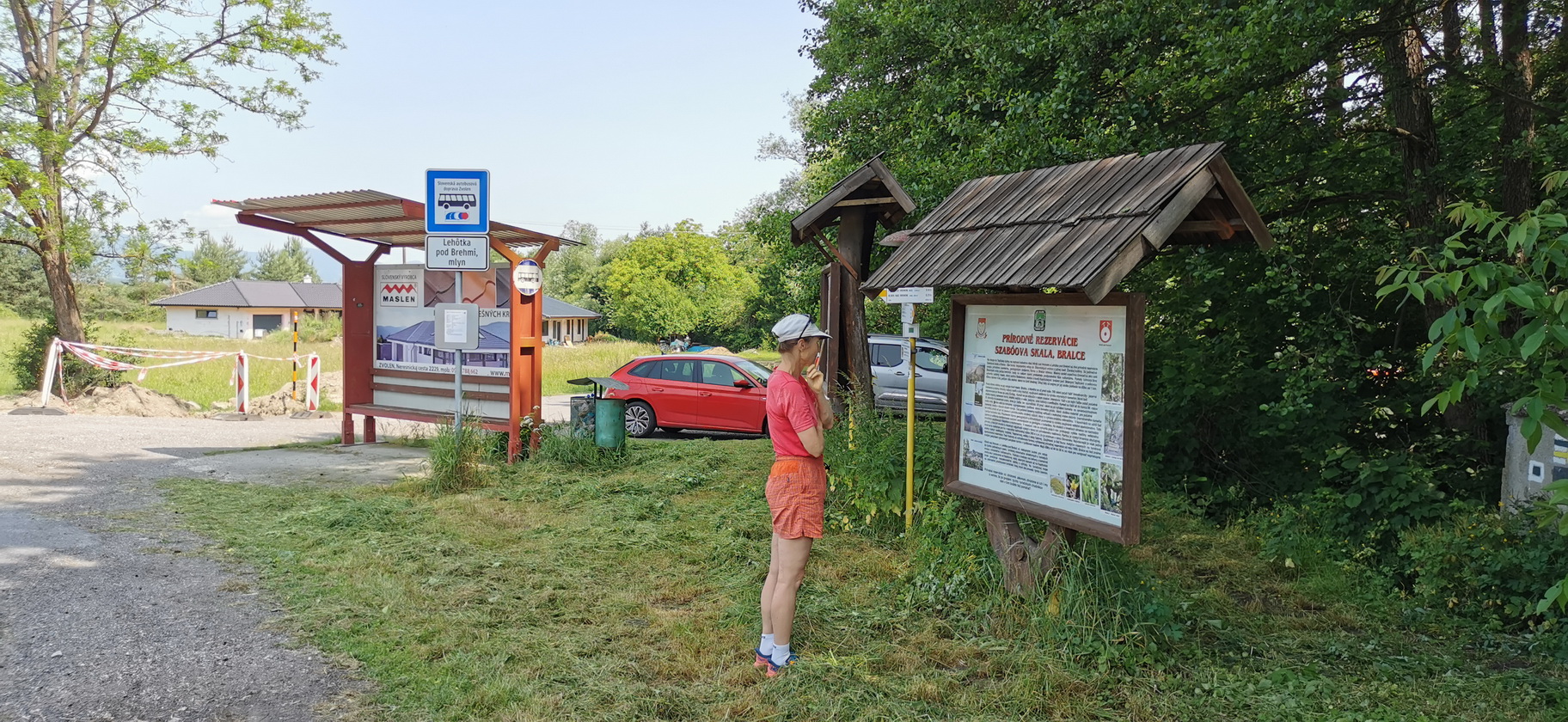 V ústí Teplickej doliny, na pomedí katastrov obcí Hliník nad Hronom a Lehôtka pod Brehmi, sú dve prírodné rezervácie. Szaboova skala a Bralce. Dnes sa pozrieme na Bralce, odporúčania od kamarátov sme mali pozitívne. Zo Sklených Teplíc, kde sme pár dní bývali, je to na skok, a tak vyrážame. Parkujeme pri ceste (foto) pri autobusovej zastávke, je tu tabuľa s kvalitnými informáciami (foto). Najprv ideme kúsok po hlavnej ceste a z nej odbočujeme na zelenú značku vpravo.