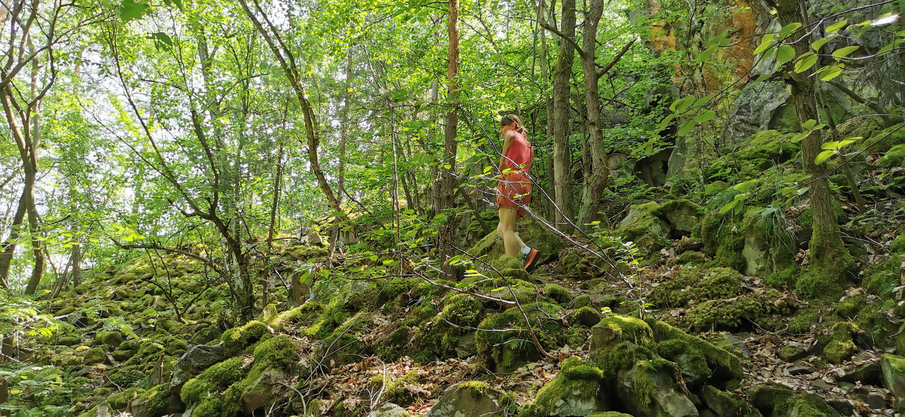Na začiatku túry sme mali obavy z horúčavy. Hustý les, ale hlavne špecialita tejto lokality: prúdenie chladného vzduchu z jaskýň a skalných trhlín nás ale kvalitne osviežila a pomohla nám prežiť. Nebola to ale jediná zaujímavosť tejto oblasti, ktorou nás previedol okruh po zelenom náučnom chodníku.