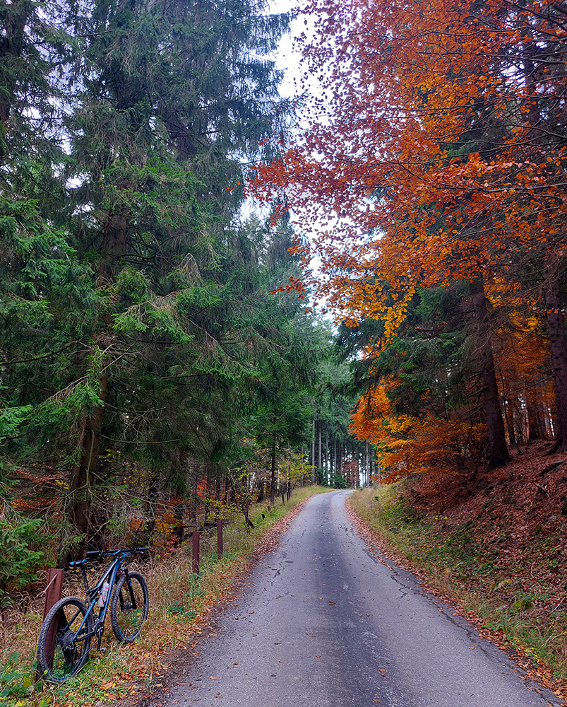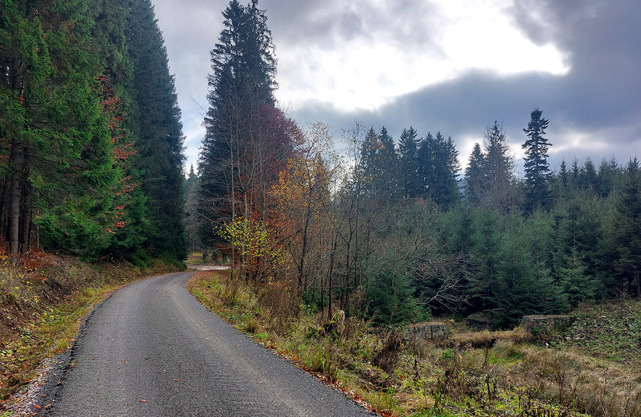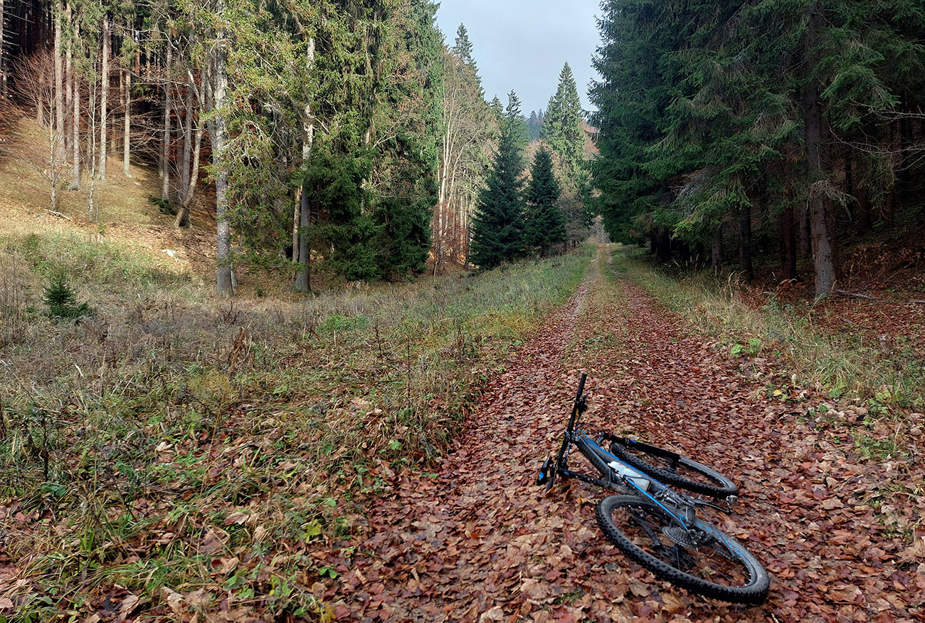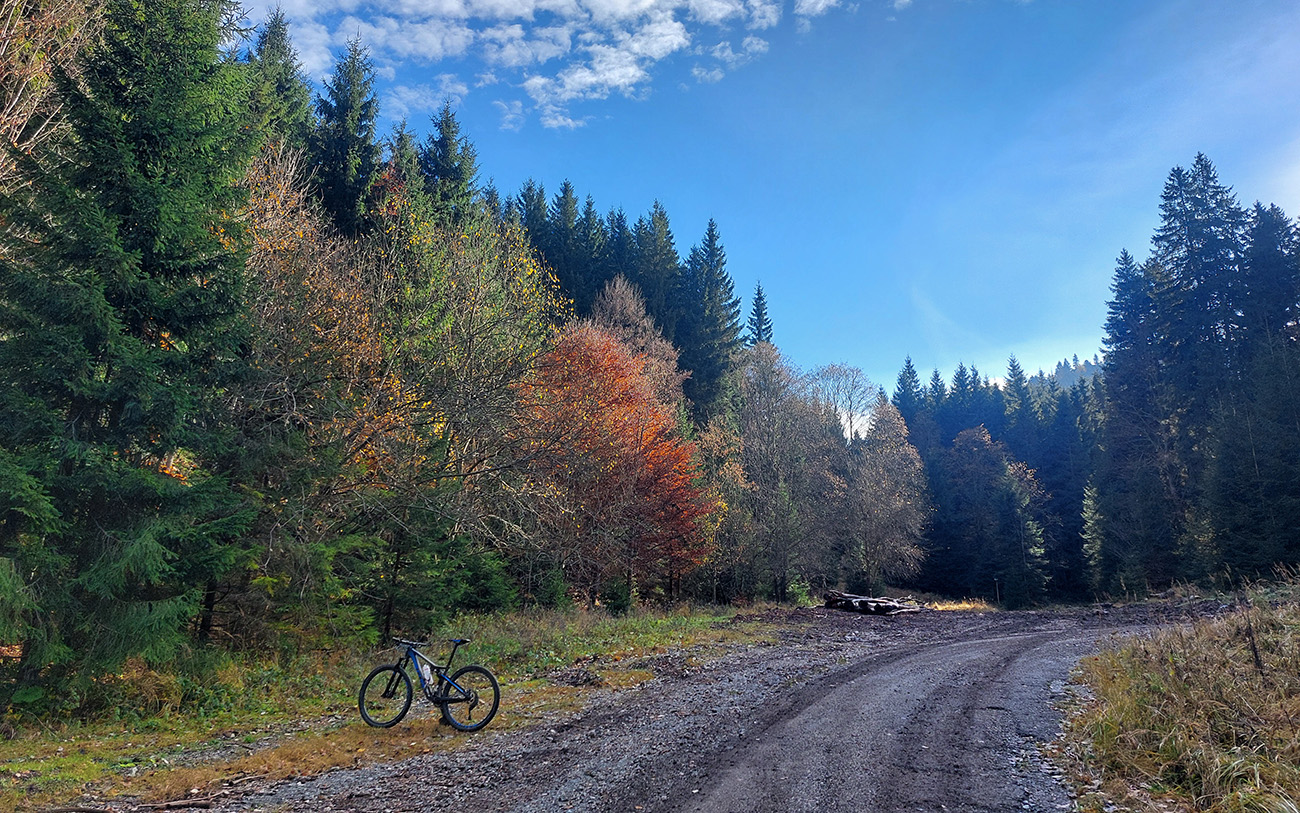 Hneď po vjazde do lesa prvá strada bianca, až po napojenie na asfaltku hore Dolinou Čiernej vody. Pohodofka v miernych sklonoch, blata skoro nič, a ešte občas aj slnko začarovalo farbami. Pomaly som sa posúval na východ za prašťania šotoliny a občasného šuchotu lístia.