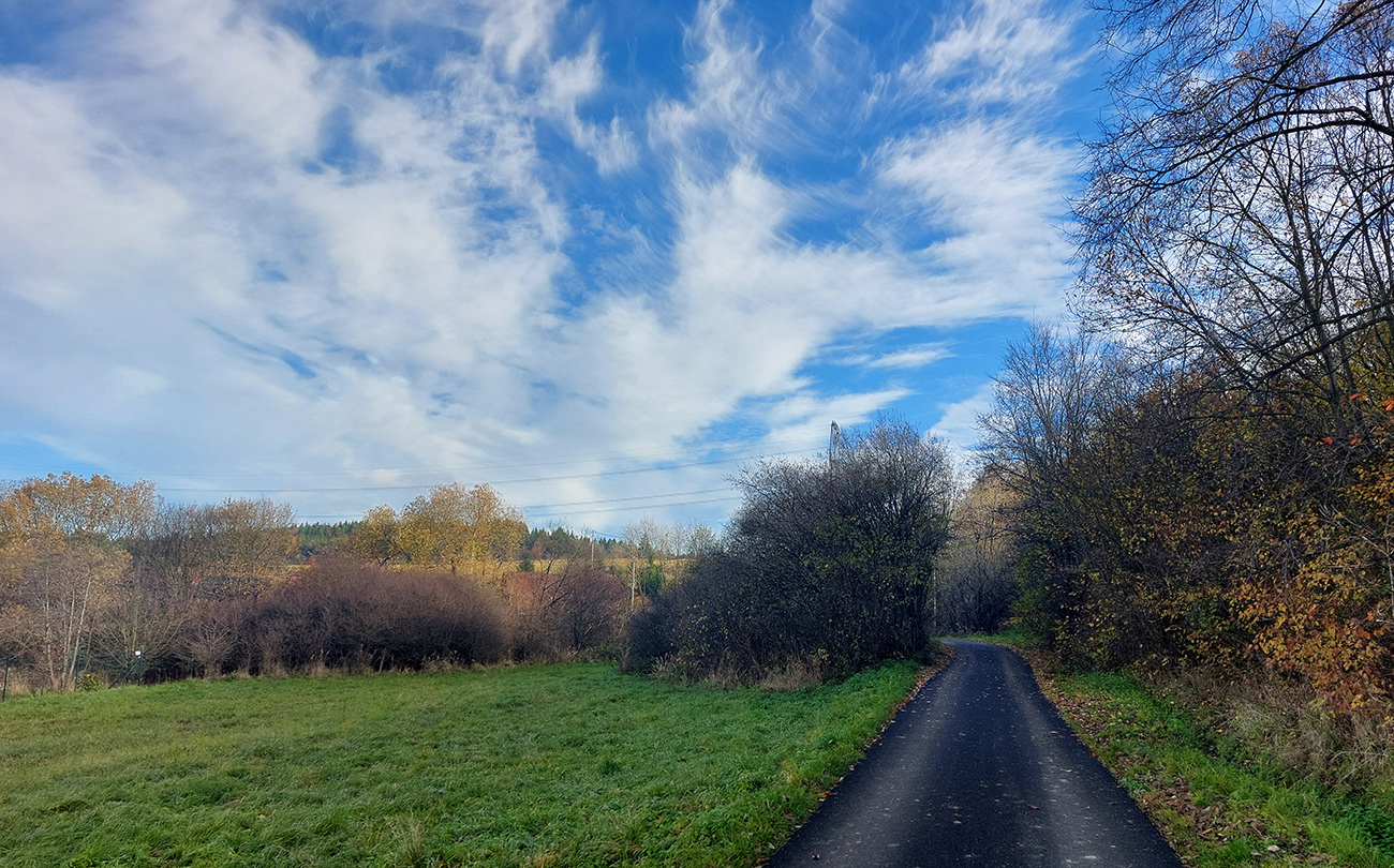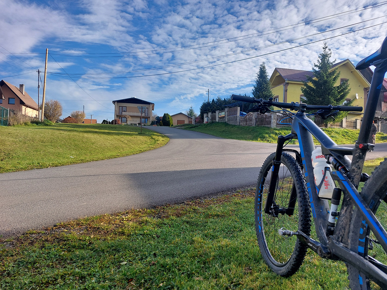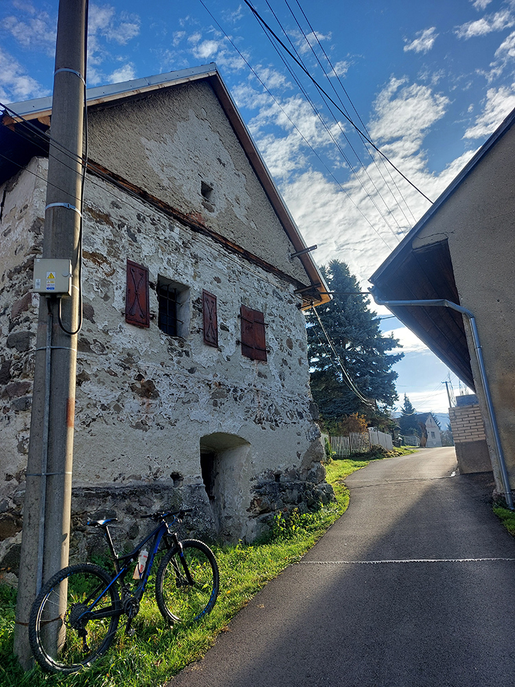 Až do konca to potom boli už len pevné cesty s dominanciou asfaltov, ale kadejakej hrboľatej kvality. Niekde až „bianche“, aký je tam asfalt od staroby vyblednutý. Takže bacha, aspoň gravel je tam treba. Ale ozajstné, pod kolesami praskajúce strade bianche sa aj tu našli. V podstate modrá a potom červená cyklotrasa až do Štubne, so skúpymi výhľadmi cez rúbaniská doľava – najskôr na vodárenskú nádrž, potom na kotlinu okolo Skleného a štubnianskej železničnej stanice. Taká pohodová cykloturistika.