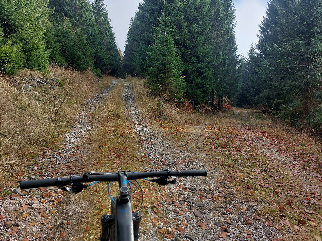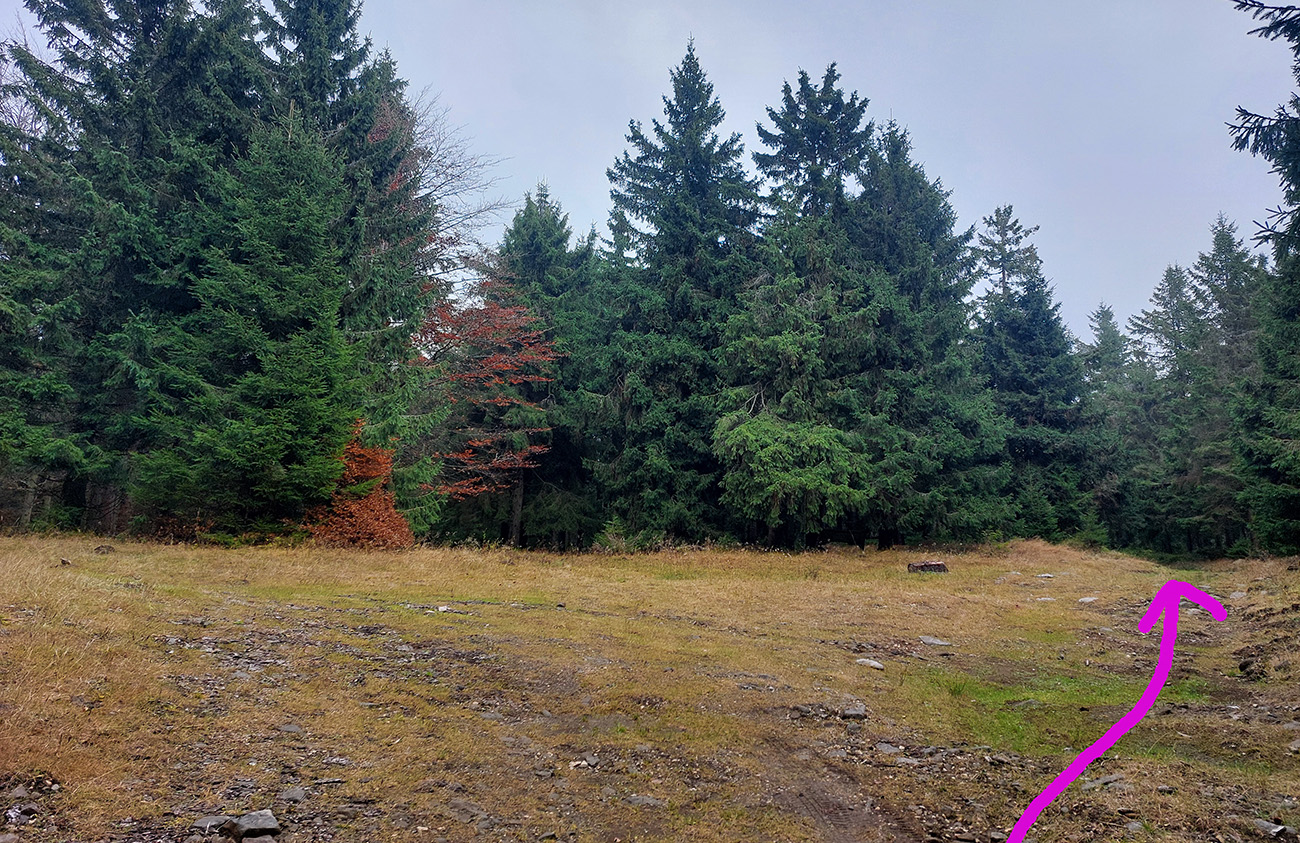 Tak nazad dole a z križovatky do ešte miernejších sklonov po príjemne praskajúcej šotoline, smer sedlo (alebo skôr križovatka) Široký peň. Cestou jedna poriadna zákruta, okolo prehľadné lesy a šírka aj pre kamión. Vynoril som sa na tej križovatke prvý raz, ešte dva razy som to mal v pláne, chystal som sa to tam poriadne zauzliť.