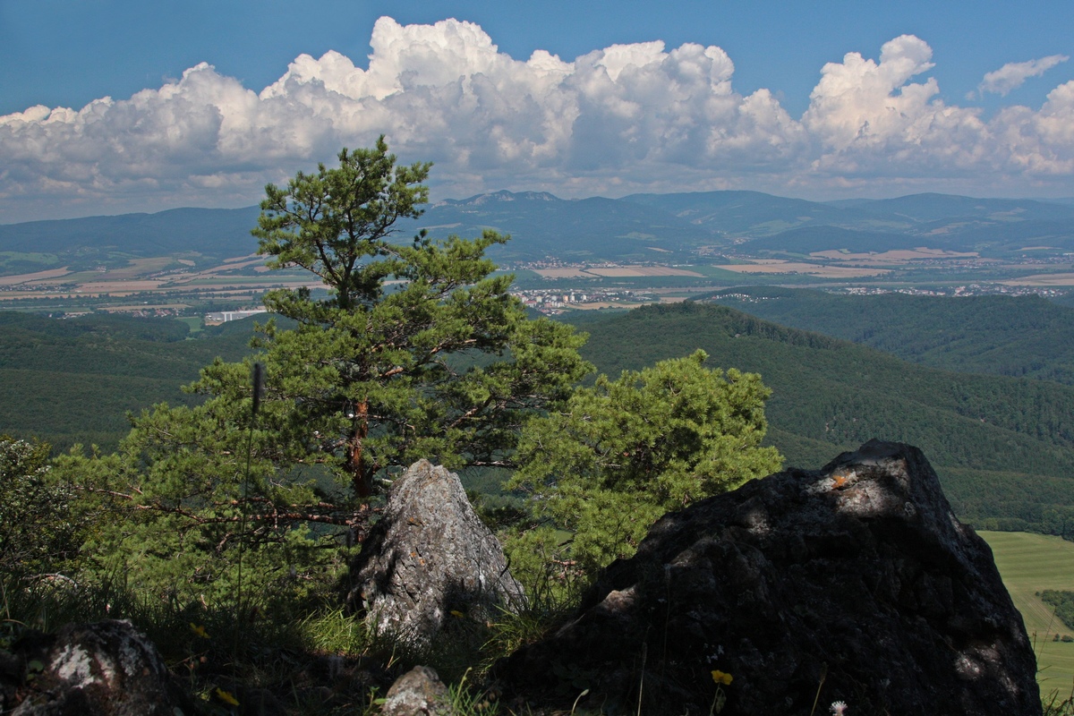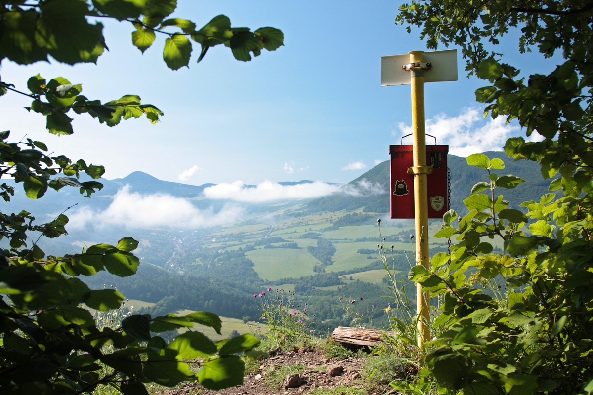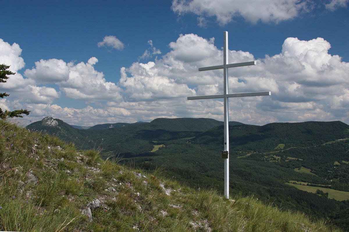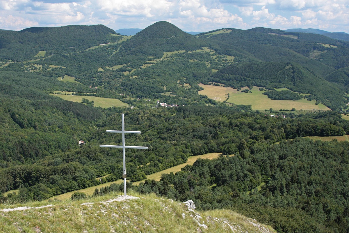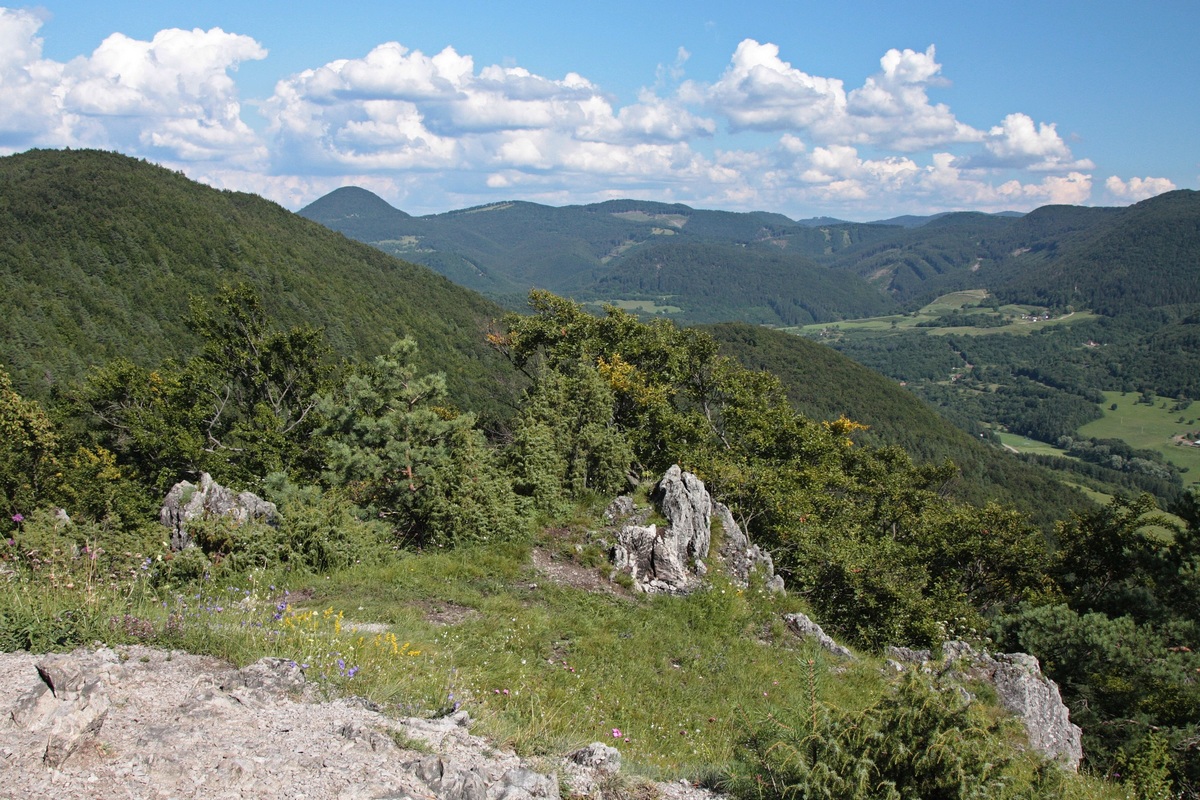 Západným hrebeňom pokračuje výrazný chodník. Chvíľu sa vinie okrajom vrcholovej lúky, potom vhupne do lesa a po pár nenáročných stúpaniach a klesaniach skončí vo výraznom sedielku. Odtiaľto to mám na značku naľavo už len kúsok. Po červenej však aj tak nejdem dlho a čoskoro sa odpájam na poslednú vyhliadku na trase, Omšenskú babu (668 mnm). Jej skalnatý vrchol je ozdobený dvojkrížom a pestrofarebným kobercom z kvetov. Výhľad je veľmi podobný tomu zo Slopského vrchu, a predsa úplne iný. Škoda by bola ho obísť.