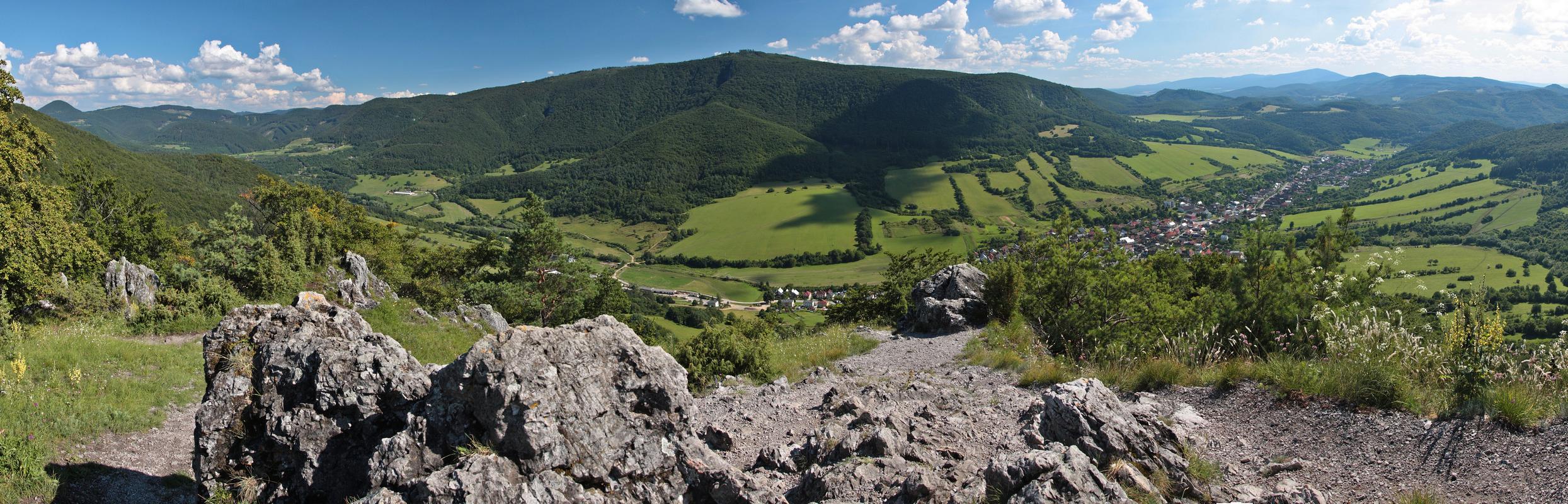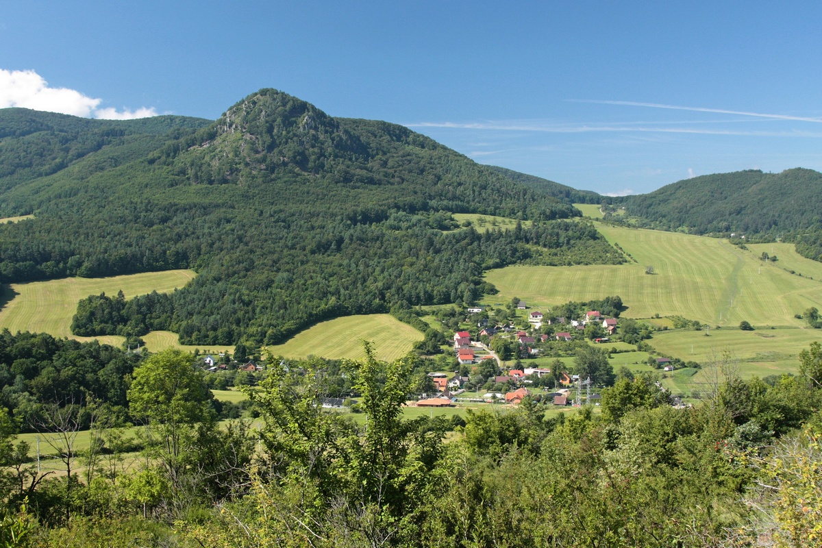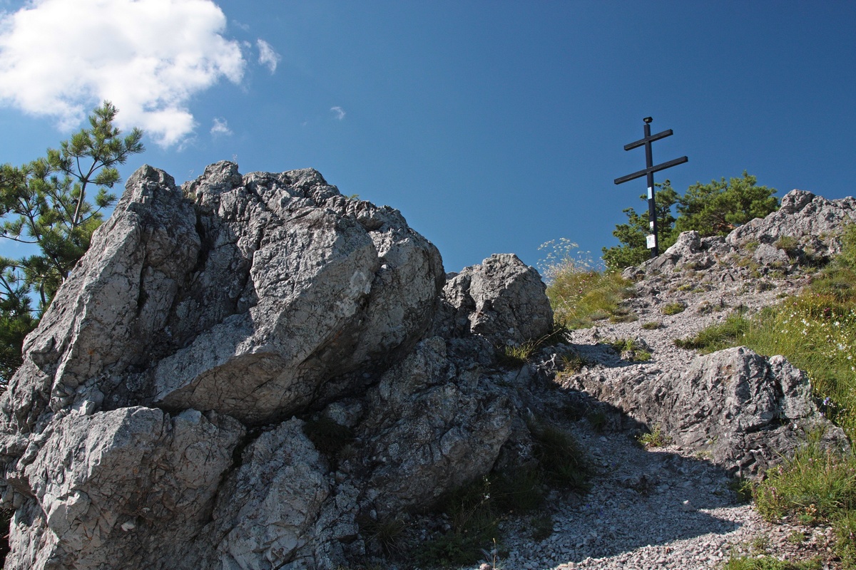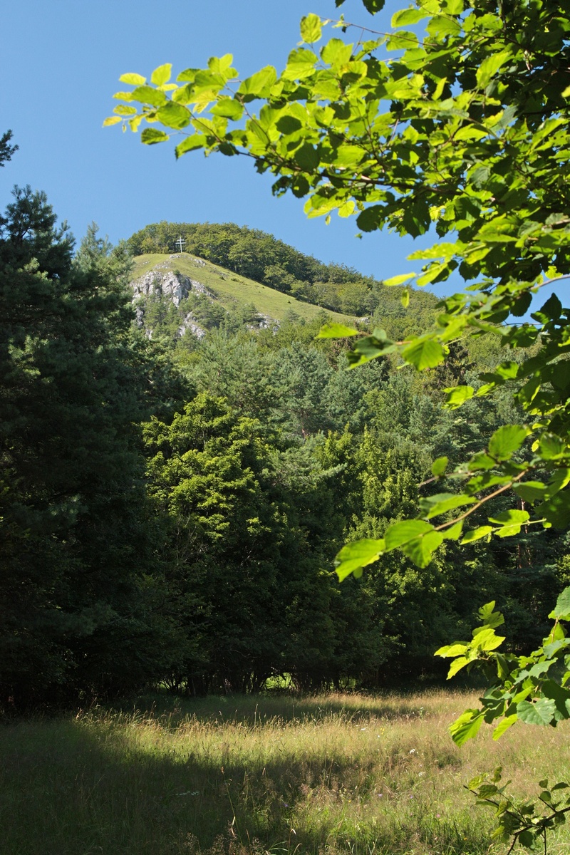 Západným hrebeňom pokračuje výrazný chodník. Chvíľu sa vinie okrajom vrcholovej lúky, potom vhupne do lesa a po pár nenáročných stúpaniach a klesaniach skončí vo výraznom sedielku. Odtiaľto to mám na značku naľavo už len kúsok. Po červenej však aj tak nejdem dlho a čoskoro sa odpájam na poslednú vyhliadku na trase, Omšenskú babu (668 mnm). Jej skalnatý vrchol je ozdobený dvojkrížom a pestrofarebným kobercom z kvetov. Výhľad je veľmi podobný tomu zo Slopského vrchu, a predsa úplne iný. Škoda by bola ho obísť.