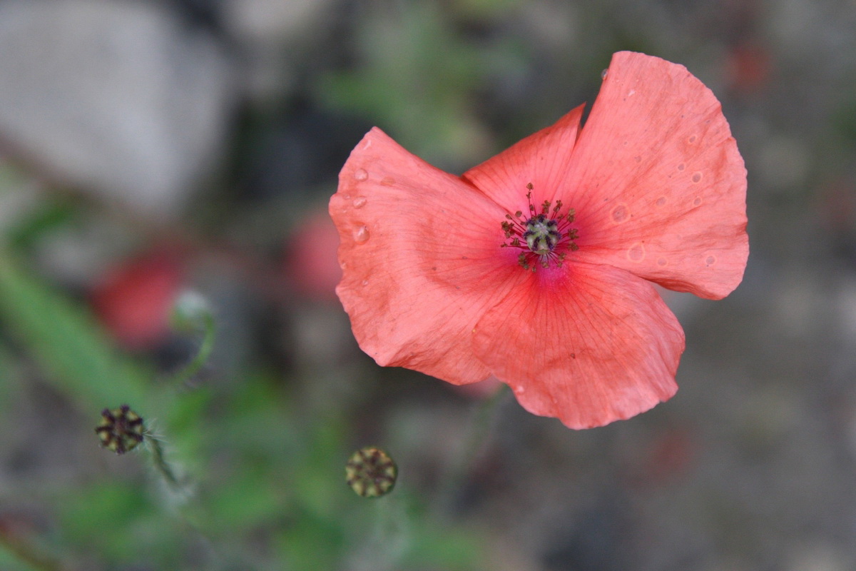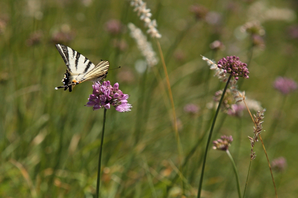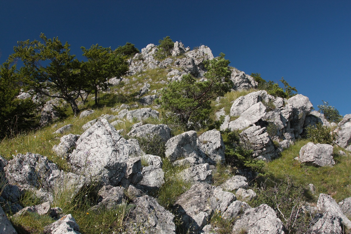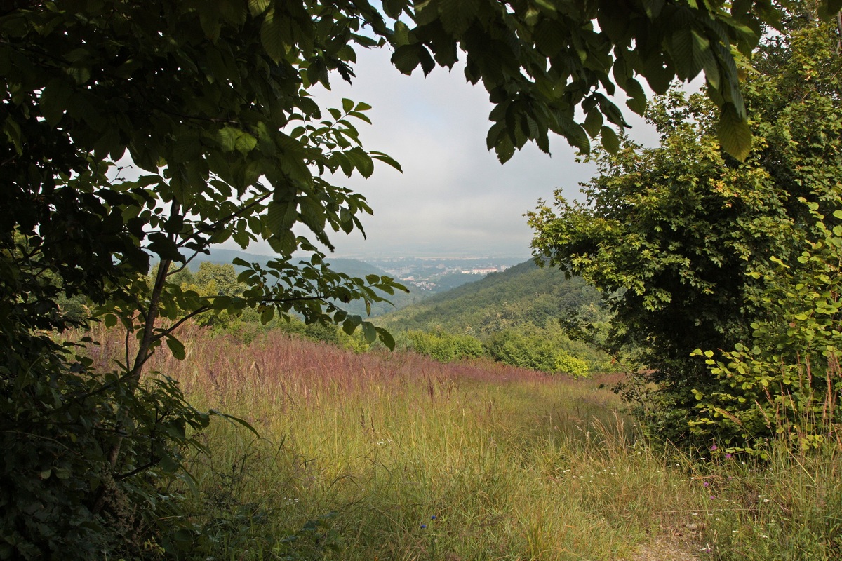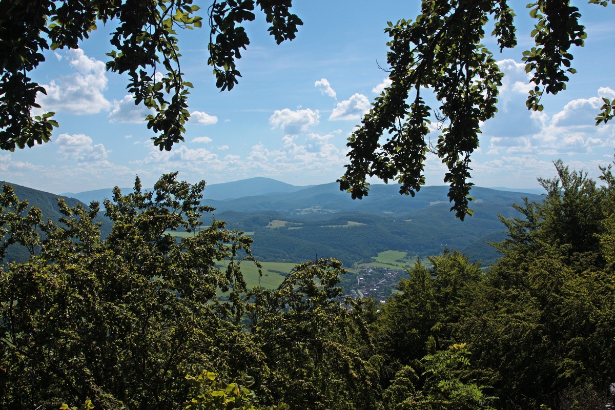 Západným hrebeňom pokračuje výrazný chodník. Chvíľu sa vinie okrajom vrcholovej lúky, potom vhupne do lesa a po pár nenáročných stúpaniach a klesaniach skončí vo výraznom sedielku. Odtiaľto to mám na značku naľavo už len kúsok. Po červenej však aj tak nejdem dlho a čoskoro sa odpájam na poslednú vyhliadku na trase, Omšenskú babu (668 mnm). Jej skalnatý vrchol je ozdobený dvojkrížom a pestrofarebným kobercom z kvetov. Výhľad je veľmi podobný tomu zo Slopského vrchu, a predsa úplne iný. Škoda by bola ho obísť.
