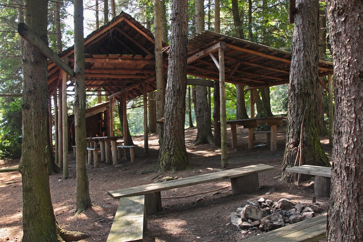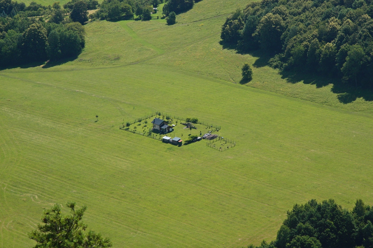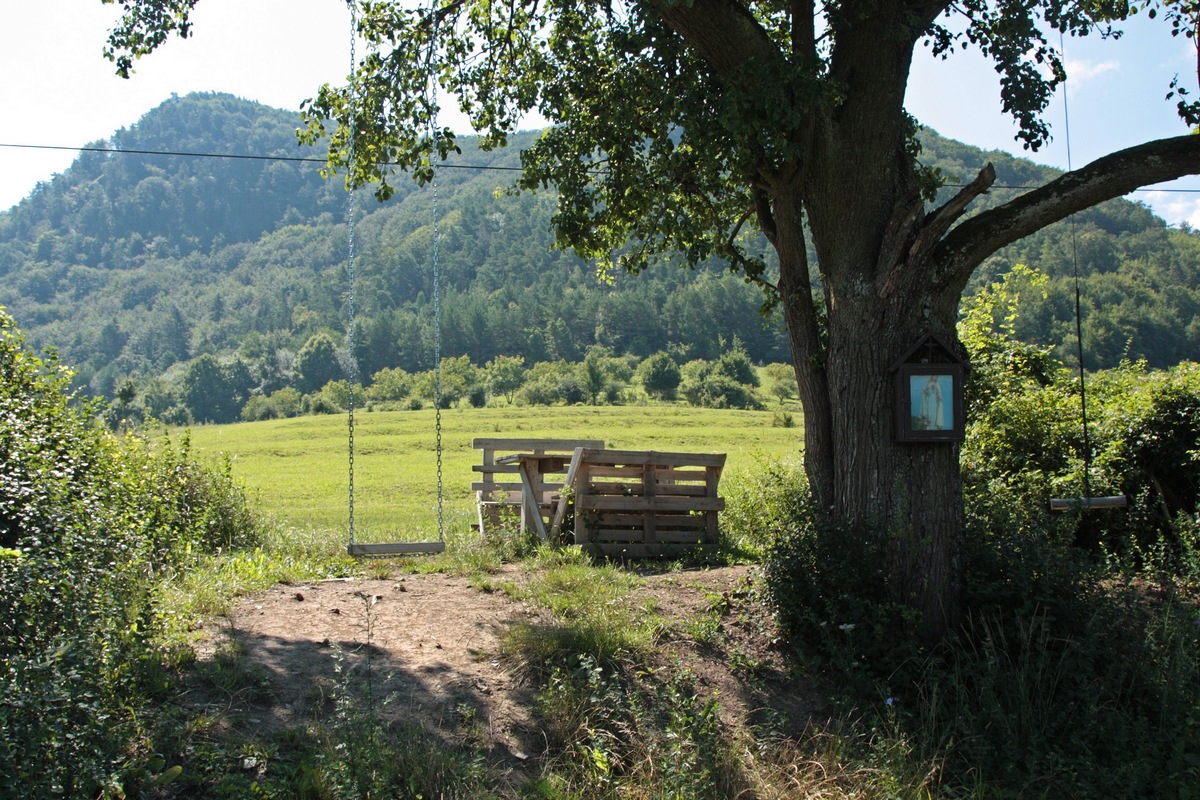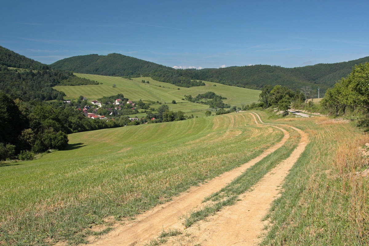 Po krátkej pauze zbieham druhou stranou do osady Smrčkovci, kde ma vítajú miestne zúrivé štekavce. Slnko neúprosne prikuruje, nuž nepohrdnem ponukou znamenitej čerstvej vody z prameňa hneď vedľa cesty. Po osviežení pokračujem smerom do Hornej Poruby. Ešte pred dedinou sa na križovatke s hlavnou cestou odpájam a improvizujem po asfalte. Komu by sa môj dnešný okruh zdal málo, môže si to v tomto bode okoreniť zachádzkou na Vápeč. Ja však volím skratku. Po chvíli sa stretám s červenou značkou z dediny a ňou už pokračujem prevažne okrajom lesa ďalej. Za chrbtom nechávam Vápečské bralá a ponad lúky na ľavoboku sa objavuje zalesnený chrbát Baske. Z tône lesa sa po chvíli vynára odpočinkový komplex drevených prístreškov s názvom Santa Fé. Dáva tušiť o mnohých spoločenských akciách.