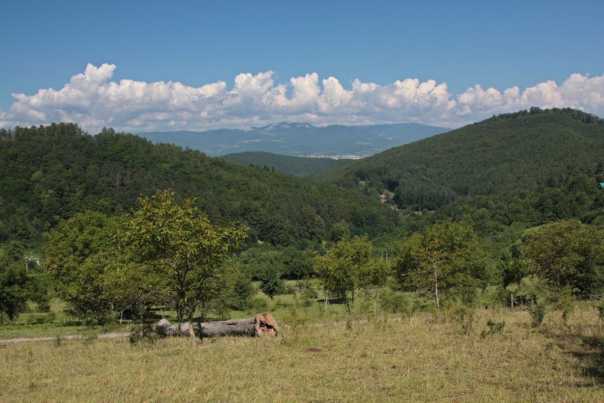 Z vrcholu zbieham naspäť na zvážnicu a ňou poľahky do osady Háj. Z dvorov sa šíria omamné vône letného víkendu. So sebazaprením im odolávam a napájam sa na miestne značenie do Iliavky. Cez Štyri Lipy prebehnem bez zastavenia a popri elektrickom vedení stúpam lúkami hore. V sedle pri chatách nad Iliavkou je v tieni stromu posedenie s hojdačkami. Dávam si krátku pauzu a kochám sa výhľadmi. Potom je dôležité už len správne odbočiť na modrú značku vedúcu na Vlčinec (682 mnm). Vrcholové stúpanie je opäť výživné a opäť 20-minútové, hore rozhádzané viaceré skalné solitéry a výhľady schované v riedkom lese. Najvýraznejší priezor smeruje opäť na Vápeč a hrebeň Hoľazne.