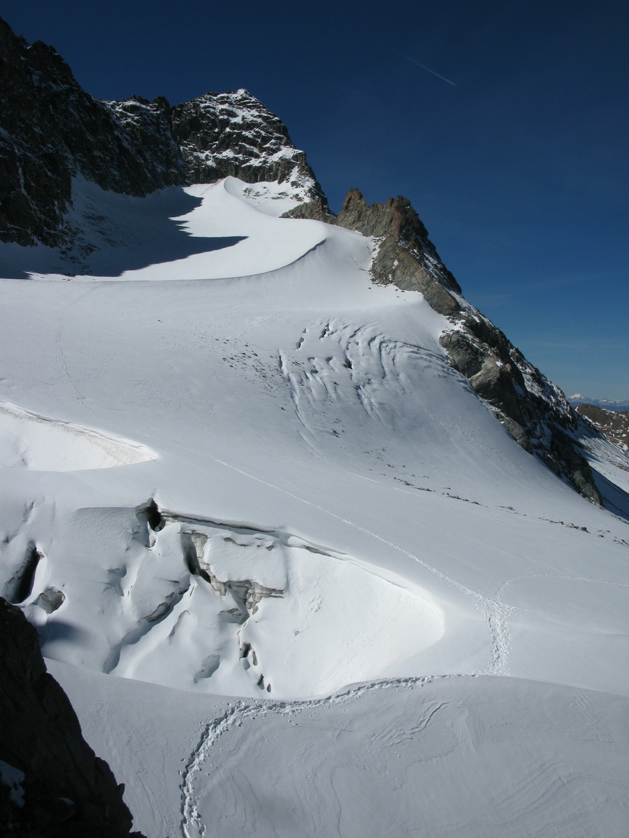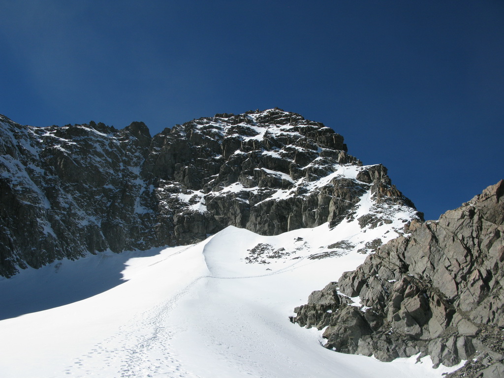 Normálka na tento vrchol vedie severne orientovaným skalným rebrom. Prístup k nemu je po ľadovci na ktorom nehrozí veľké nebezpečenstvo pádu do trhliny. Obtiažnosť skalného hrebeňa by som ohodnotil 3-. Samozrejme veľkú úlohu hrajú podmienky a preto mačky a čakan by vo výstroji nemali chýbať. Lano som nemal, pre tých, ktorí by si ho chceli zobrať odporúčam max 30metrov. V hornej časti je na skalnom hrebeni zopár osadených istení, ktoré sa môžu hodiť hlavne ak je ľadovo.