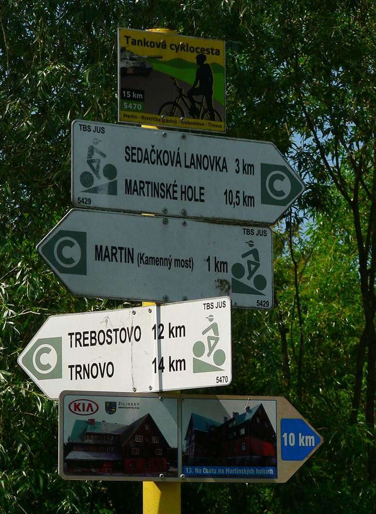 Tá vedie podhorím Martinských holí od MT na juh, sú na nej výživnučké stúpania aj pekné výhľady do kotliny, na cesťáku by strašne vytriasla, ale moc tučné gumy tiež netreba. Najvhodnejšia je pre kros alebo gravel. Teda ak sa človek nechce rýchlejšie pustiť dole kopcom – vtedy je aj full dobrý :-) Betónovo-asfaltová je a širokáááá – no pre tanky, ako inak. Tie sa samozrejme v MT kedysi vyrábali a testované boli na tankodróme hneď nad fabrikou a s ňou susediacimi kasárňami na Podháji.