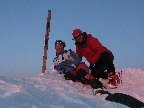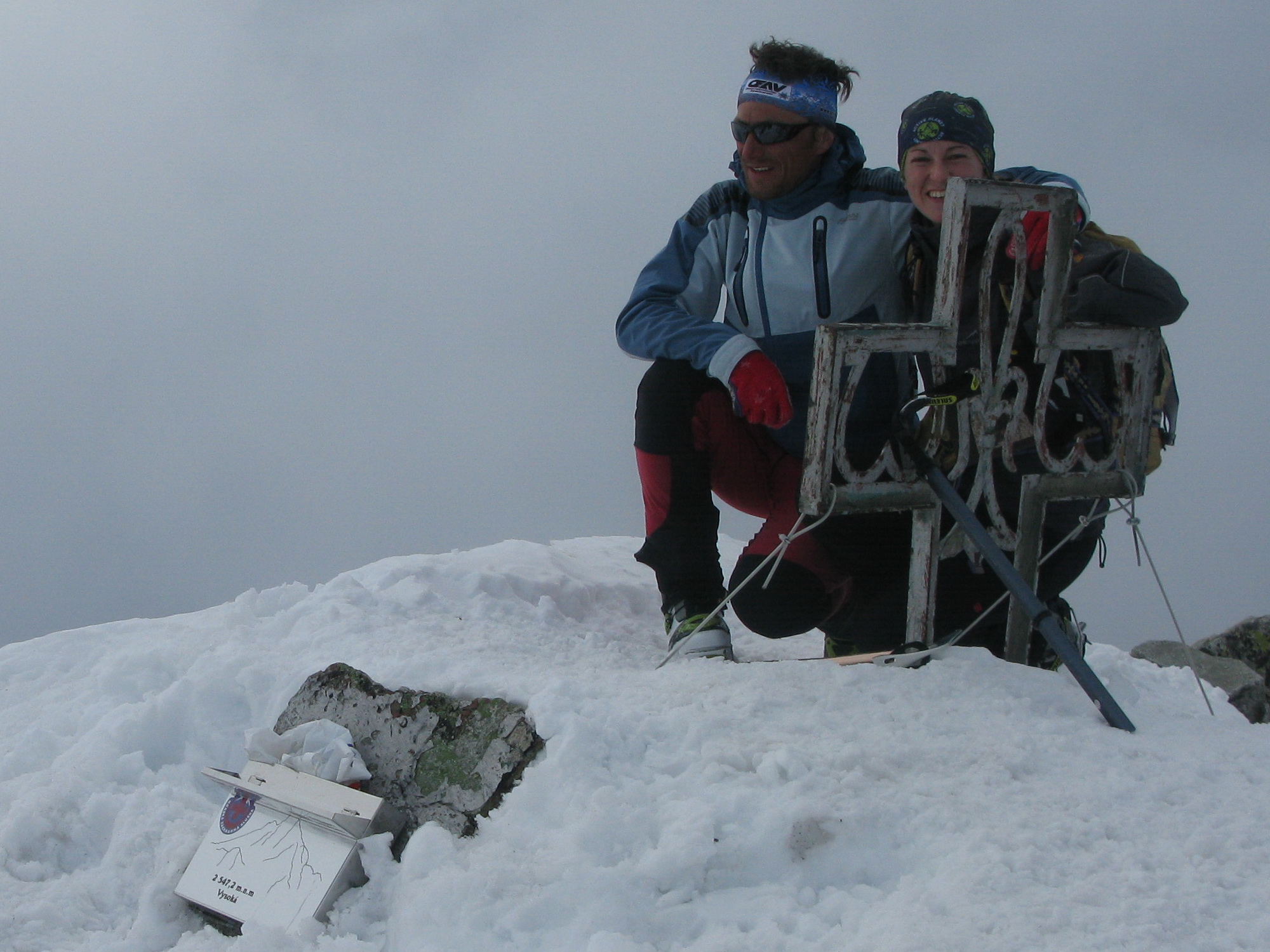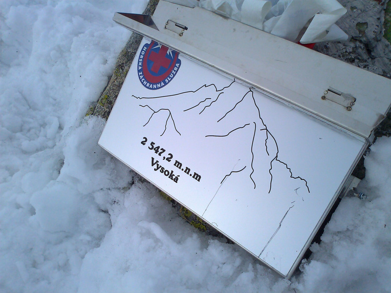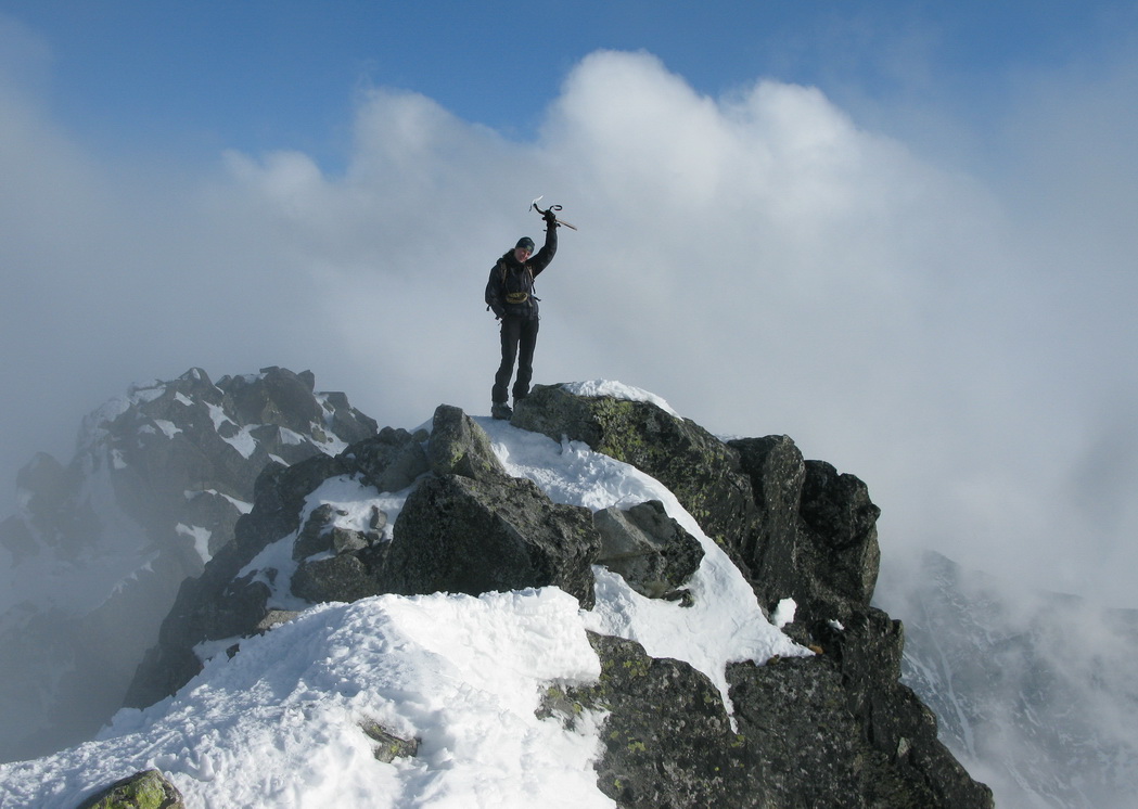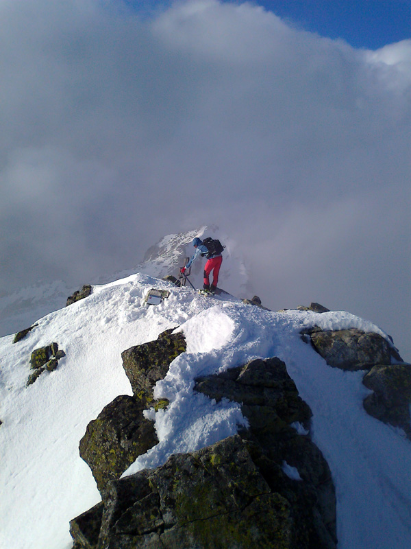To že práve stúpam na vrchol Vysokej, že teda stúpam takpovediac po vlastnom sne, sa dozvedám v polovici cesty k nemu a tak stúpam opatrne :-) Tu niekde nechávame lyže a pokračujeme na mačkách. Hmlu sem-tam odfúkne, vidno modrú oblohu a výhľady okolo. Lyže sa vzďaľujú. Keď sa občas rozplynie hmla, vidím ich v diaľke ako zapichnuté malé paličky.
