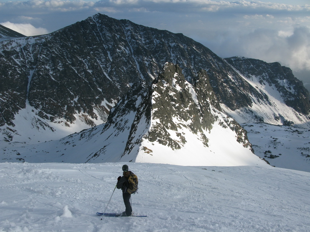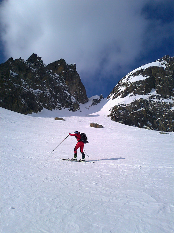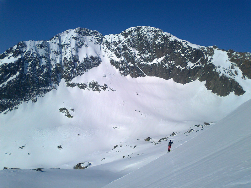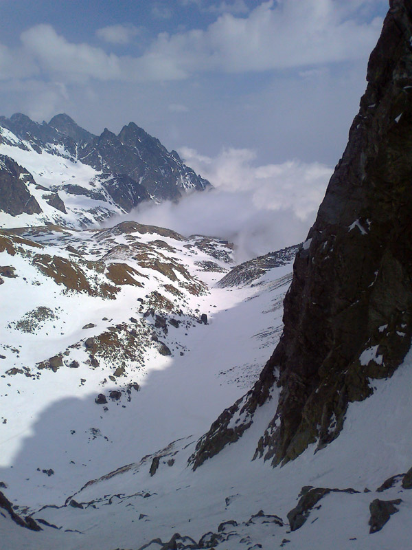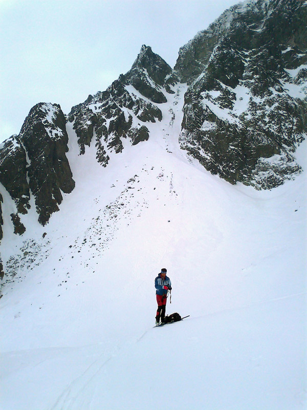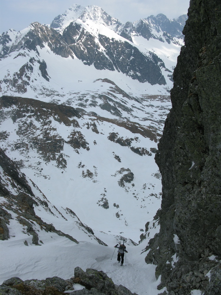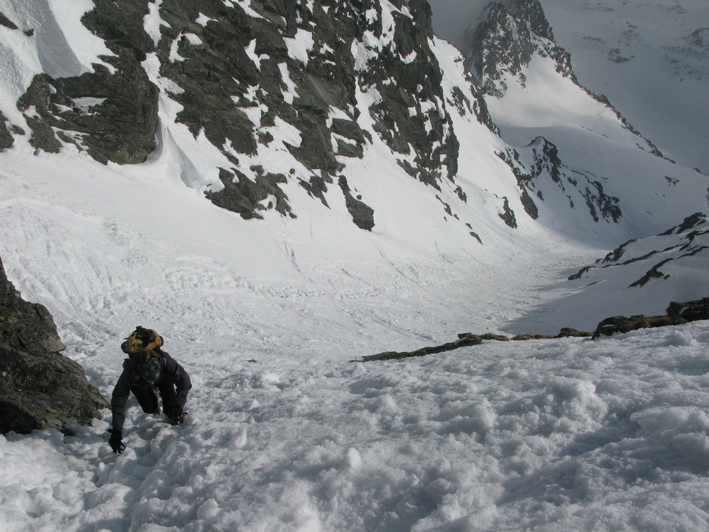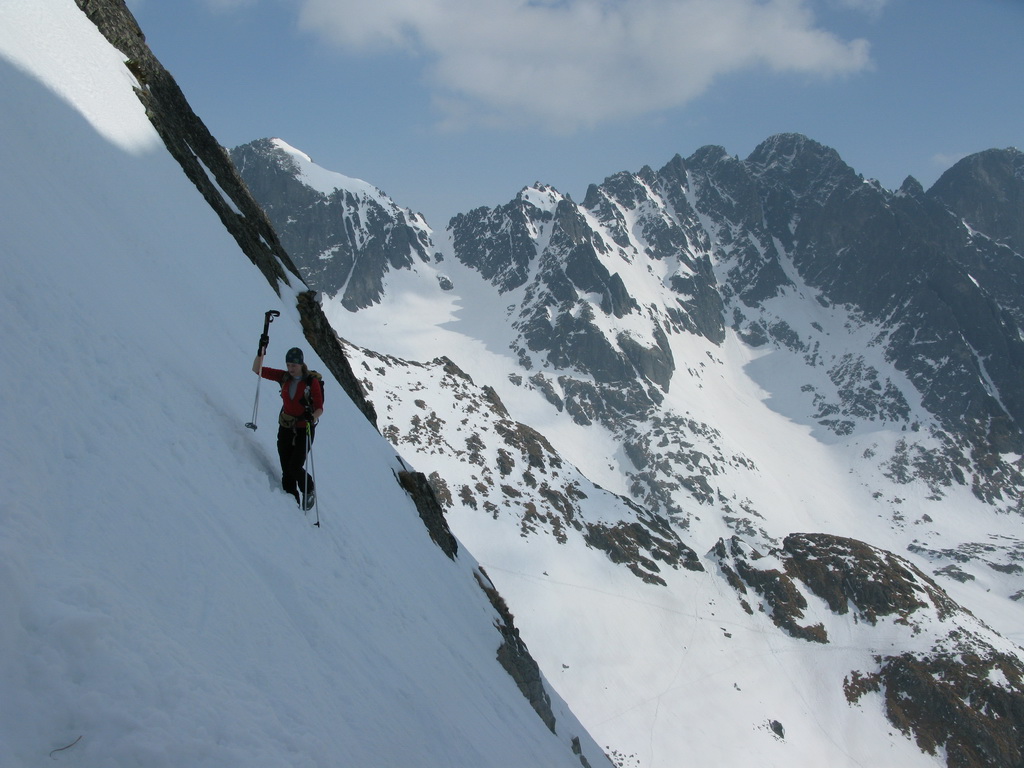Na mačkách sme vystúpali až sem. S ešte stále nejasným plánom a cieľom pokračujeme ďalej. Zjazd a traverz poza Téryho chatu a popod Ľadové štíty. Podmienky aj počasie sú čoraz lepšie. Dostávame sa až pod stopu, vedúcu do Priečneho sedla.