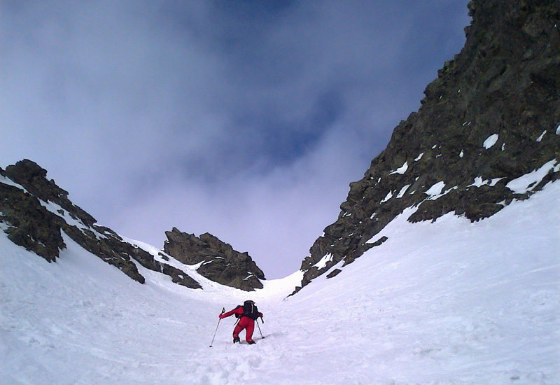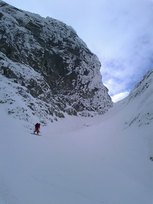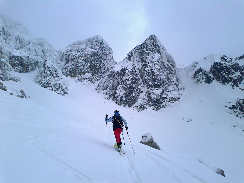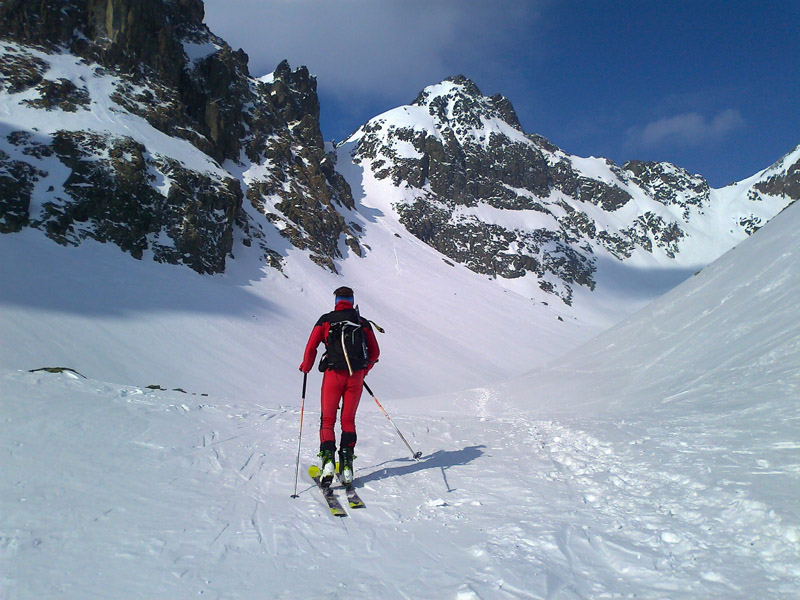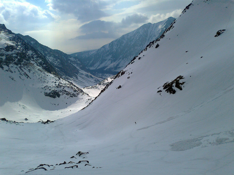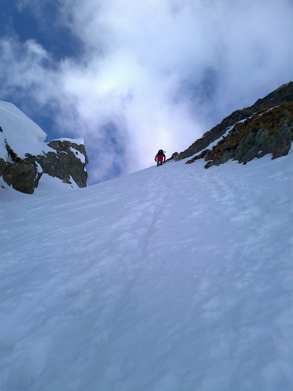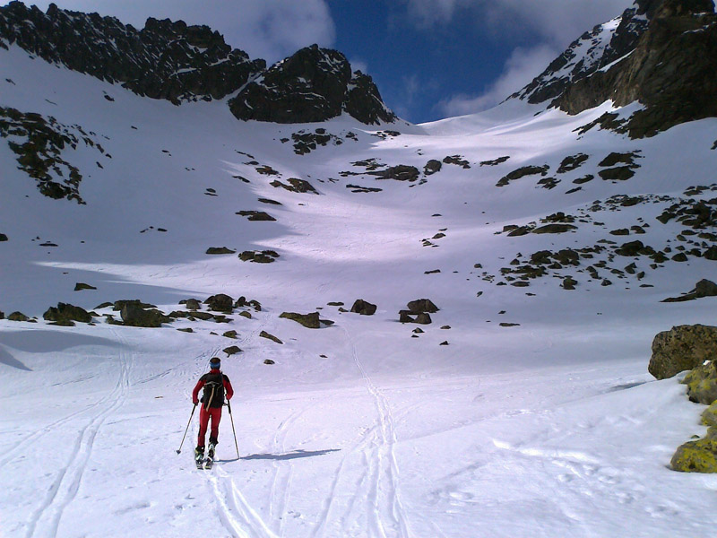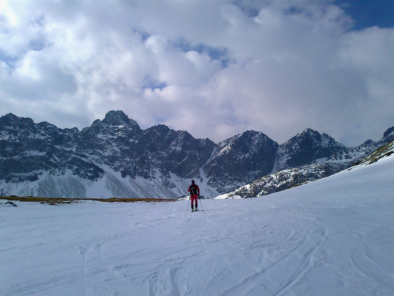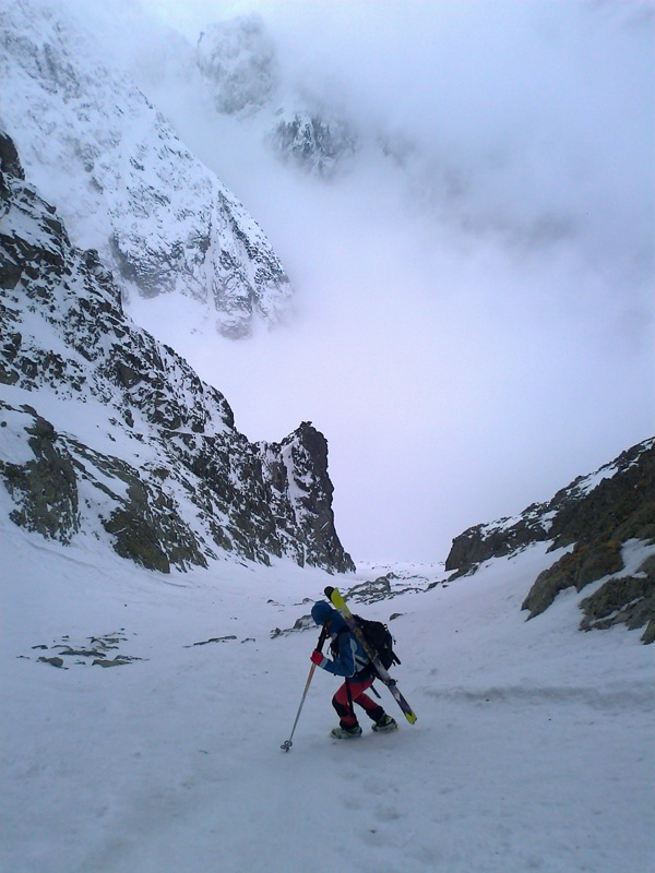 Nechávame to na ňu - na náhodu. Vyrážame smer Veľká Zmrzlá dolina. Kam, to stále nevieme. Je trochu zamračené, cez Belianky sa prevaľuje veľký mrak. Sneh pod nami je zmrznutý, dávame na lyže mačky a šliapeme hore Fľaškou. Nie je to až také zlé s tým počasím. Sem tam vykukne nádejný fľak modrej oblohy. Po víkendovej invázii turistov je dolina prázdna a tichá.