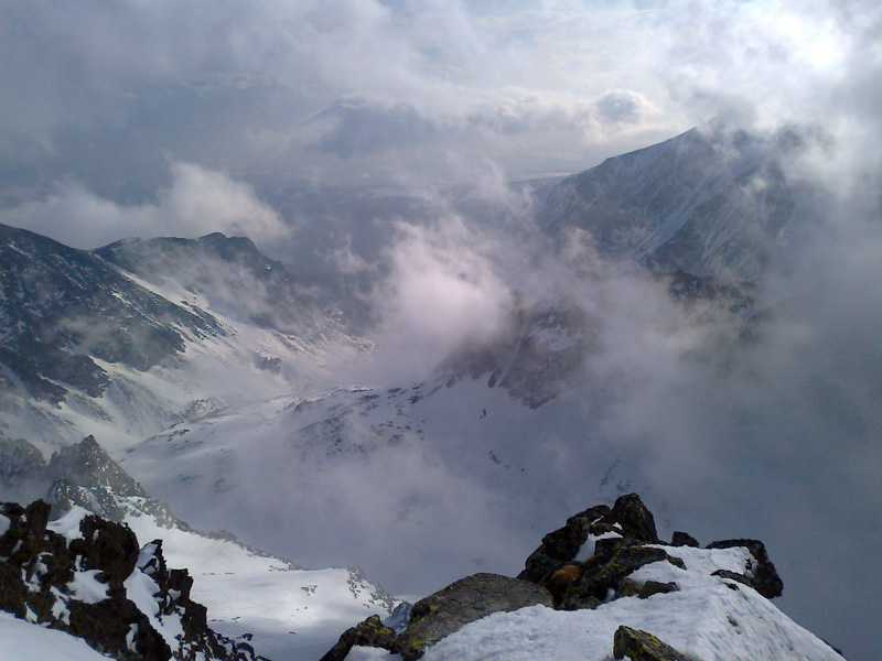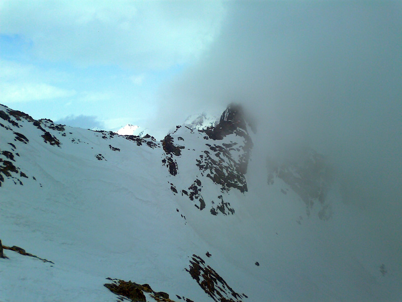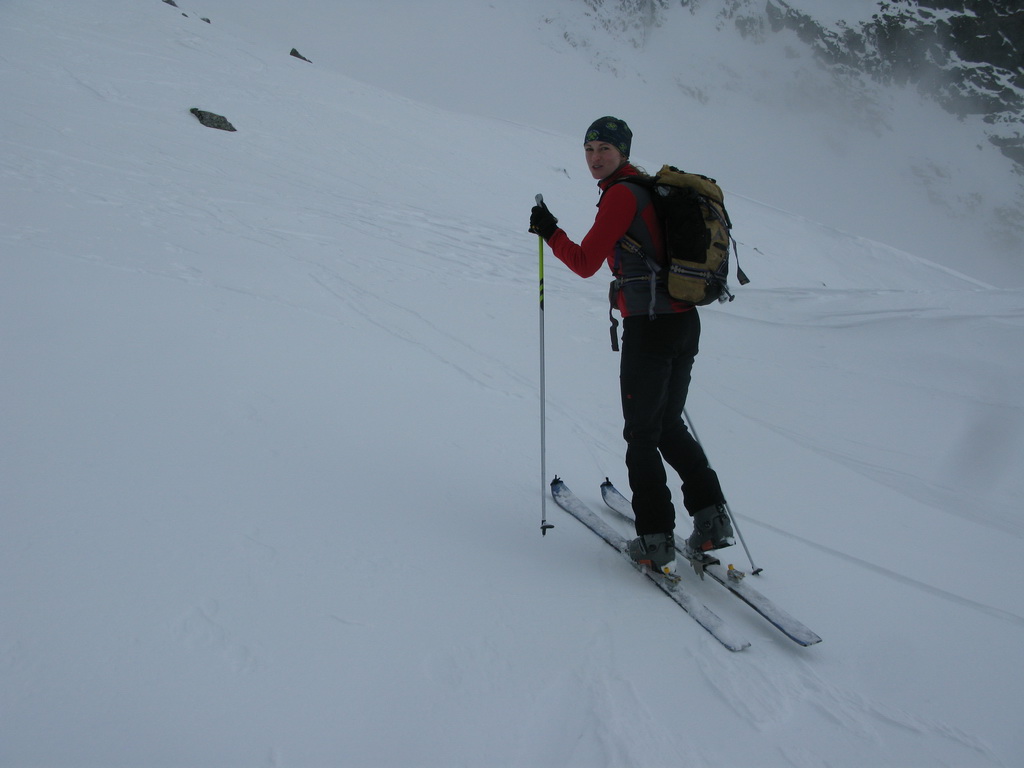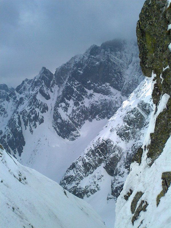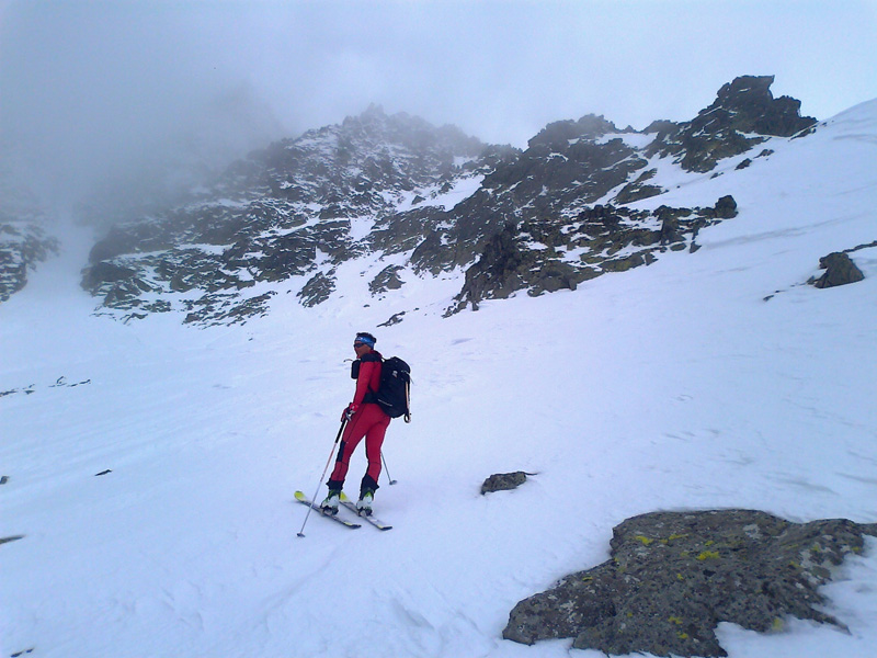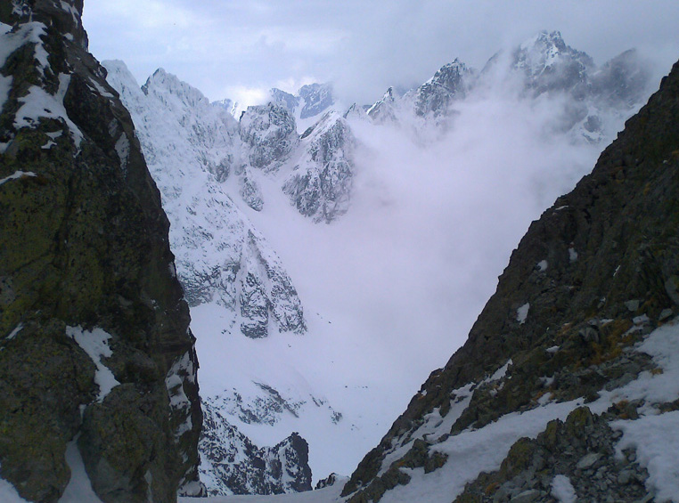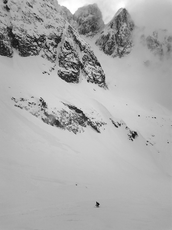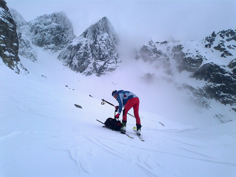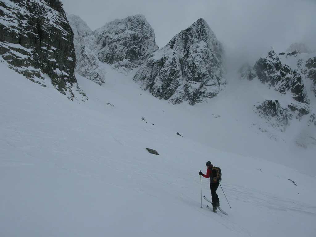 Opäť používame mačky. Pred nami panoráma Gerlachu, vysnežená Lavínová lávka. V doline sa drží hustá hmla, do ktorej budeme musieť zlyžovať a nájsť z nej tú správnu cestu do Litvorového sedla. Tesne pred tým, ako nás po pár oblúkoch zhltne hmla, zazriem dva kamzíky, ako na nás zvedavo pozerajú. Vďaka Maťovej skvelej orientácii a znalosti terénu sa vynoríme na tom správnom mieste. Niet divu, veď to tu pozná lepšie ako svoju izbu.