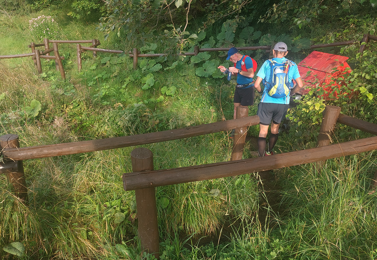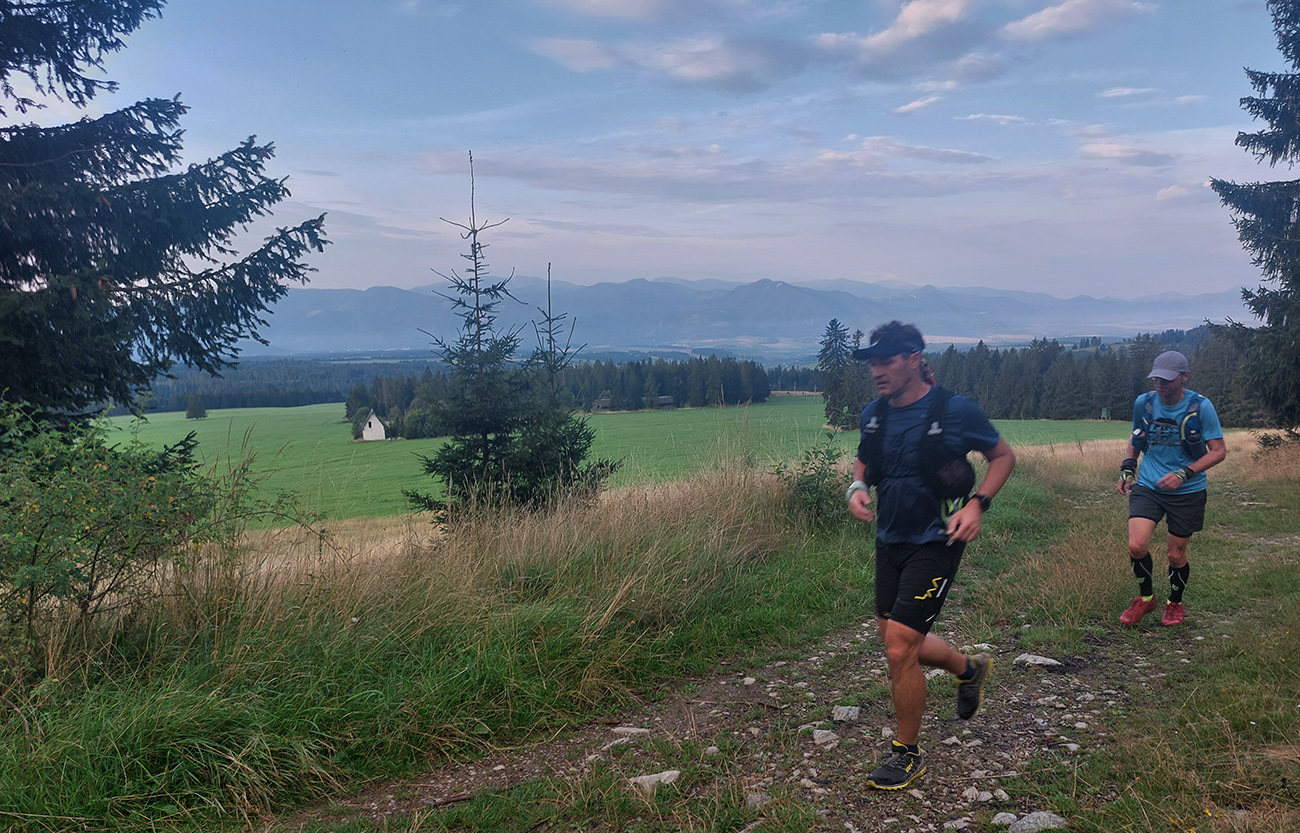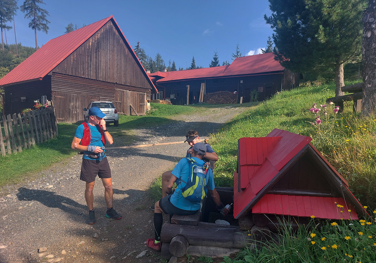 Svetlo rýchlo pribúdalo, aj výhľady dole na Liptov, nálada bola výborná, cestou pár studničiek na ovlaženie, tankovali sme hojne, bolo treba už teraz, aj hlavy odsoľovať. Stádo držalo pokope, zatiaľ vládal aj (vraj) najslabší kus, ktorý mal v pláne sa neskôr odpojiť, aby nezdržoval. Inak náhodou sa mal práve ten deň konať aj „komunitný tréning“ v rámci virtuálnej Šelmy ultra, tak sme boli zvedaví, či niekoho nestretneme pri bývalej Važeckej chate, ale po deviatej tam už bol len les plný áut.