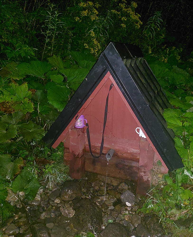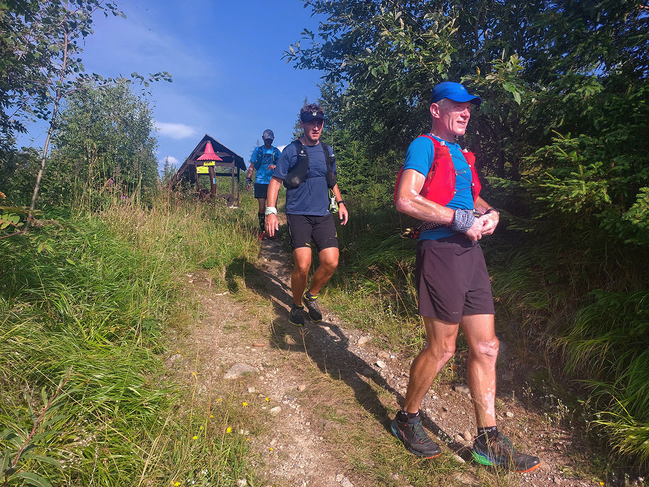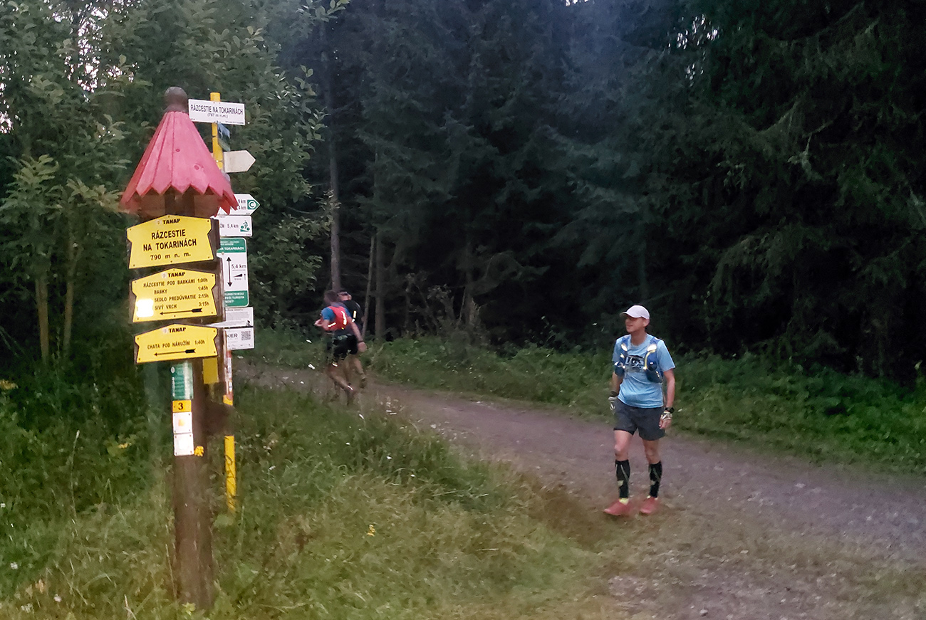 Svetlo rýchlo pribúdalo, aj výhľady dole na Liptov, nálada bola výborná, cestou pár studničiek na ovlaženie, tankovali sme hojne, bolo treba už teraz, aj hlavy odsoľovať. Stádo držalo pokope, zatiaľ vládal aj (vraj) najslabší kus, ktorý mal v pláne sa neskôr odpojiť, aby nezdržoval. Inak náhodou sa mal práve ten deň konať aj „komunitný tréning“ v rámci virtuálnej Šelmy ultra, tak sme boli zvedaví, či niekoho nestretneme pri bývalej Važeckej chate, ale po deviatej tam už bol len les plný áut.