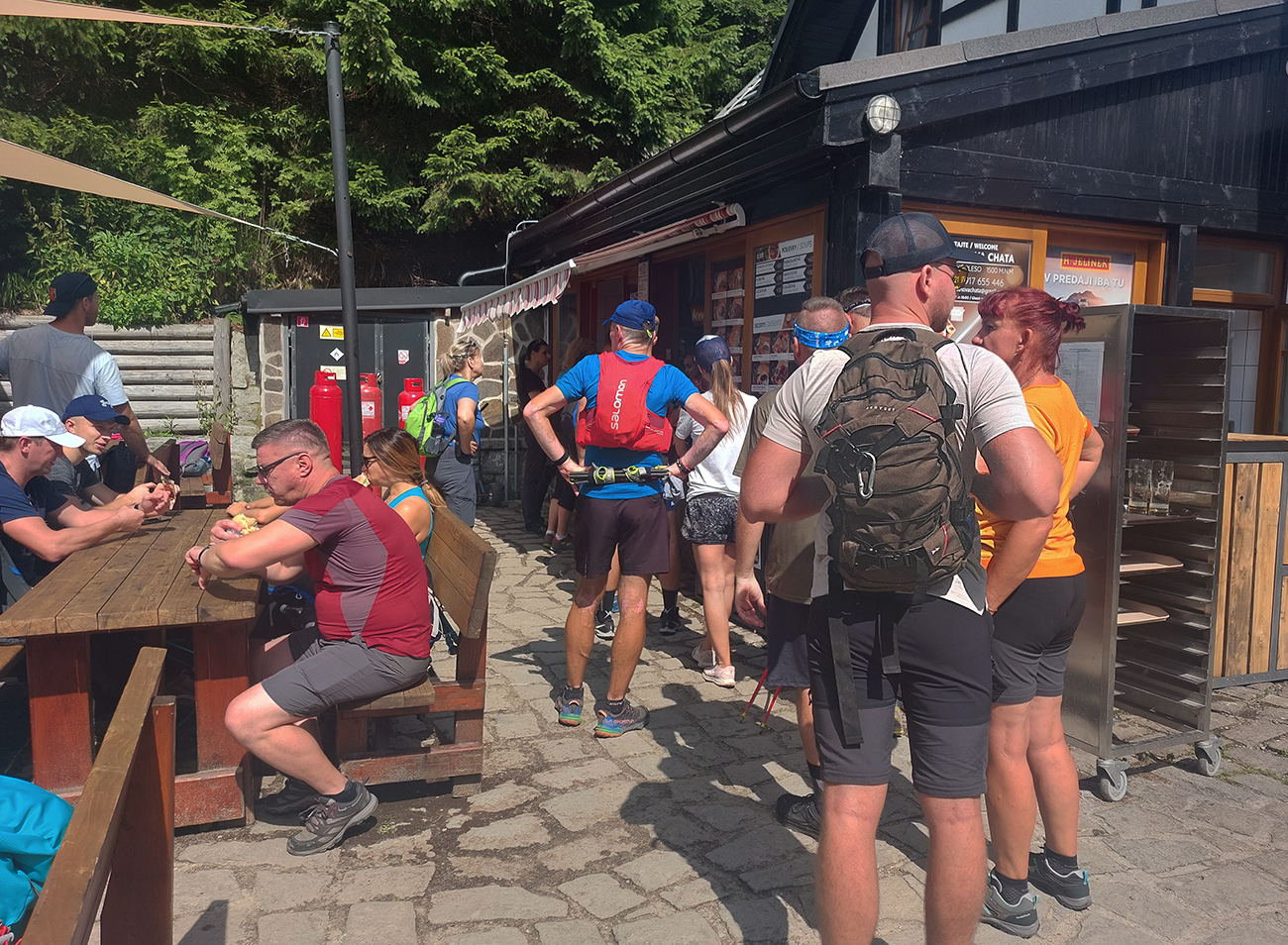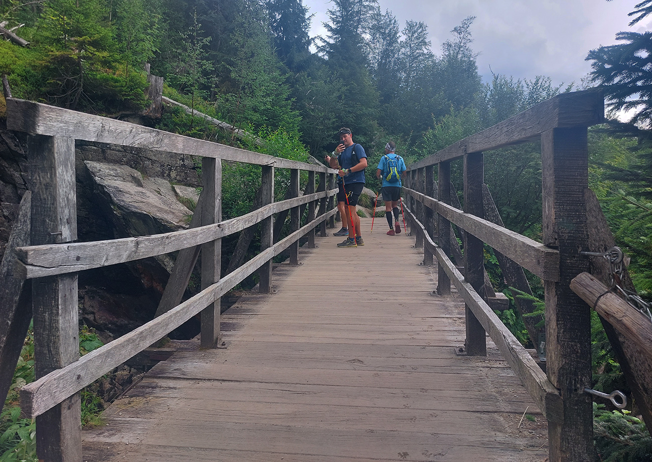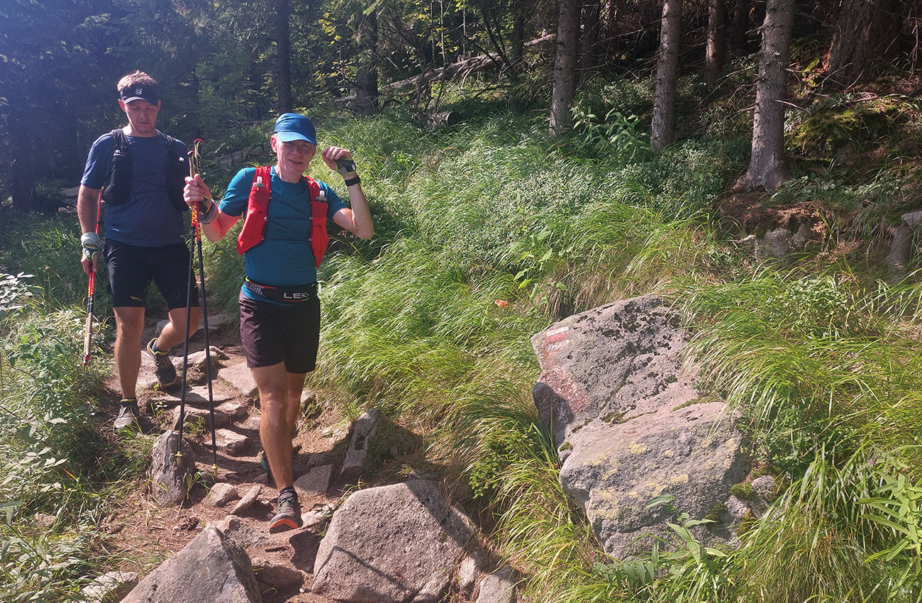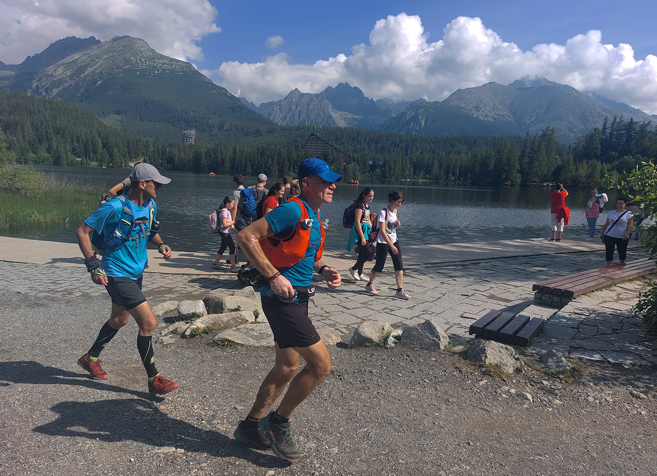 Jeden kus začal zrazu zaostávať - niet sa čo diviť v tom dlhom stúpaní cez mladý les s minimom tieňa, to dusno už začínalo vraždiť. Potom už našťastie lepšie, na tých rovinkách pred Štrbským plesom. Len sme čakali, kedy sa oproti nám začnú valiť davy. Prišlo to niekde okolo Jamského plesa a začala predieračka, uhýbačka. Na Štrbskom sme radšej ešte nestáli - dohoda padla, že prvá občerstvovačka bude na Popradskom, to už nie je ďaleko a rad na pivo vystojí ten, kto bude cez Trigan najrýchlejší. Prvú polovicu trasy sme teda zmákli pod šesť hodín, ale to vieme, že tu to nie je smerodajné. Sranda začala s prestupom z asfaltu na drsnú tatranskú žulu pod Triganom: balvany + sklony + davy, výborná kombinácia, zaručene spomaľujúca. Ale ako veľmi, to som ani v najhoršom sne nevidel. No zatiaľ to išlo.