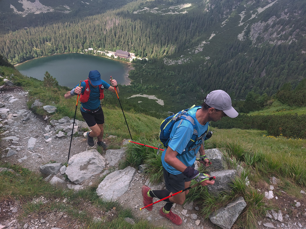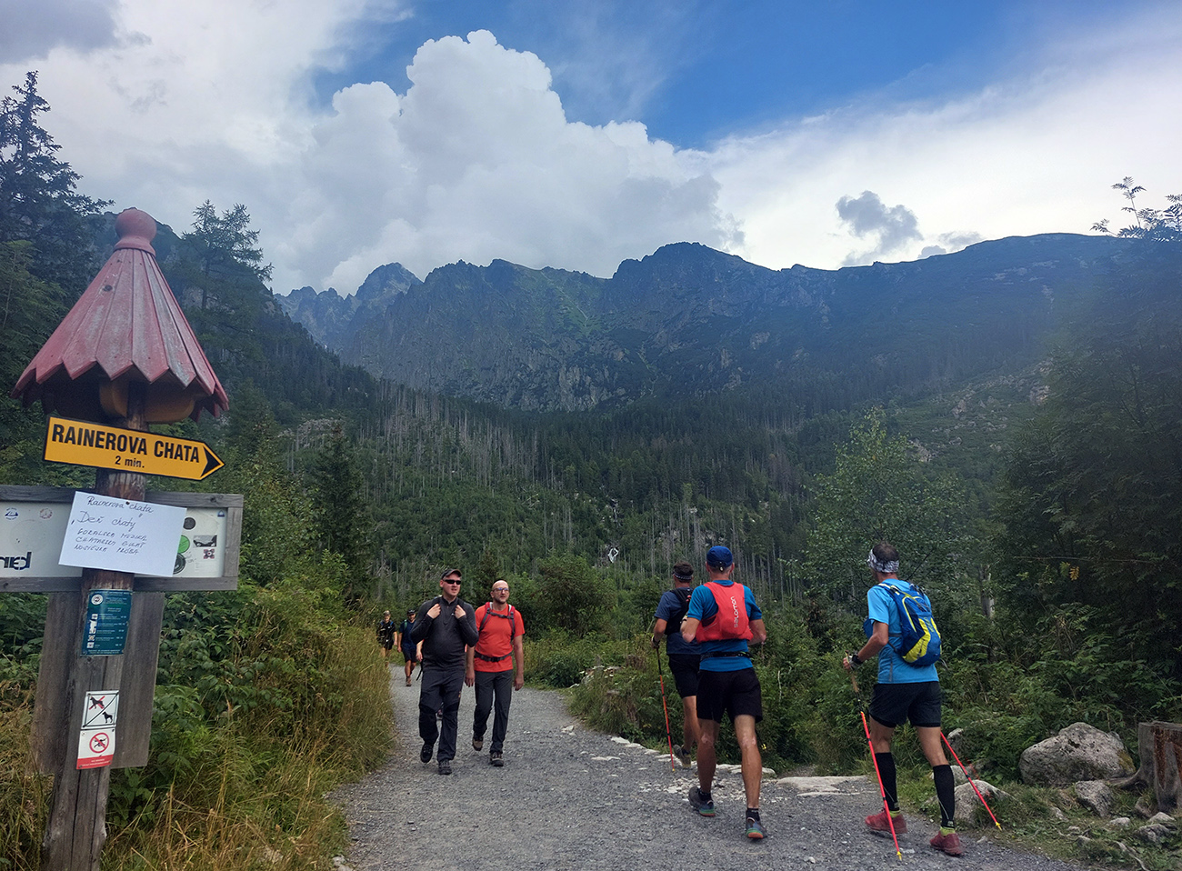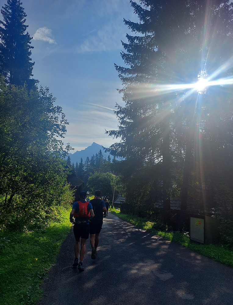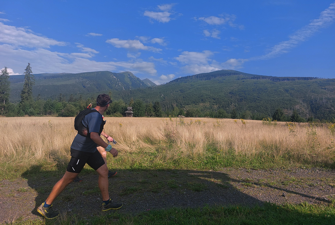 Jeden kus začal zrazu zaostávať - niet sa čo diviť v tom dlhom stúpaní cez mladý les s minimom tieňa, to dusno už začínalo vraždiť. Potom už našťastie lepšie, na tých rovinkách pred Štrbským plesom. Len sme čakali, kedy sa oproti nám začnú valiť davy. Prišlo to niekde okolo Jamského plesa a začala predieračka, uhýbačka. Na Štrbskom sme radšej ešte nestáli - dohoda padla, že prvá občerstvovačka bude na Popradskom, to už nie je ďaleko a rad na pivo vystojí ten, kto bude cez Trigan najrýchlejší. Prvú polovicu trasy sme teda zmákli pod šesť hodín, ale to vieme, že tu to nie je smerodajné. Sranda začala s prestupom z asfaltu na drsnú tatranskú žulu pod Triganom: balvany + sklony + davy, výborná kombinácia, zaručene spomaľujúca. Ale ako veľmi, to som ani v najhoršom sne nevidel. No zatiaľ to išlo.