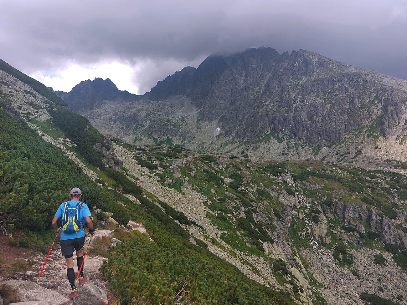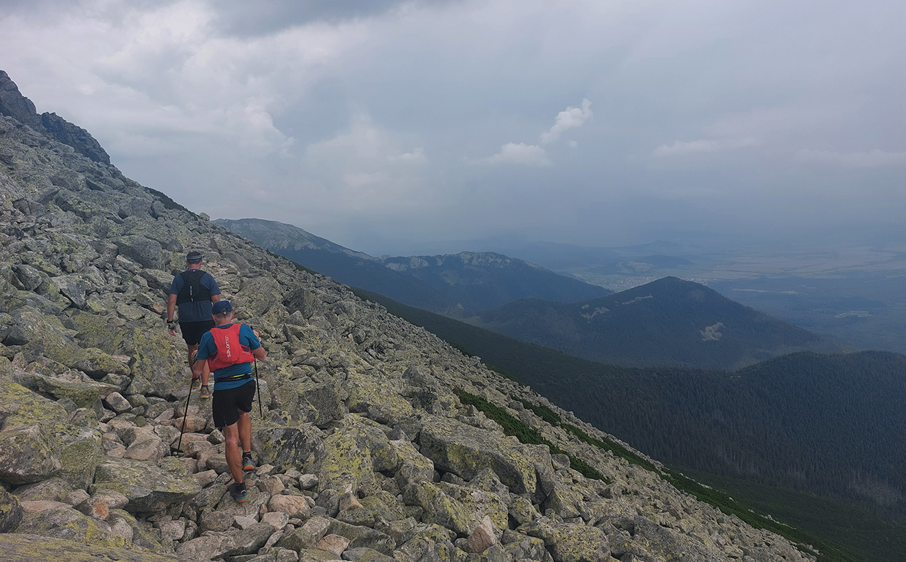 Ešte trochu do kopca, žeby zmena bola, a pokračovalo dlhé zoskakovanie po šutroch smer Hrebienok. S poklesom výšky znateľne rástla teplota a ustávali závany vetra – a keď nás nejaký závan z doliny trafil, to ako keby na nás samo peklo dýchlo. Našťastie sa stále viac zamračovalo. Až tak, že sa nám to prestávalo páčiť, ale zase presne podľa predpovede, tak výhovorky neprichádzali do úvahy.