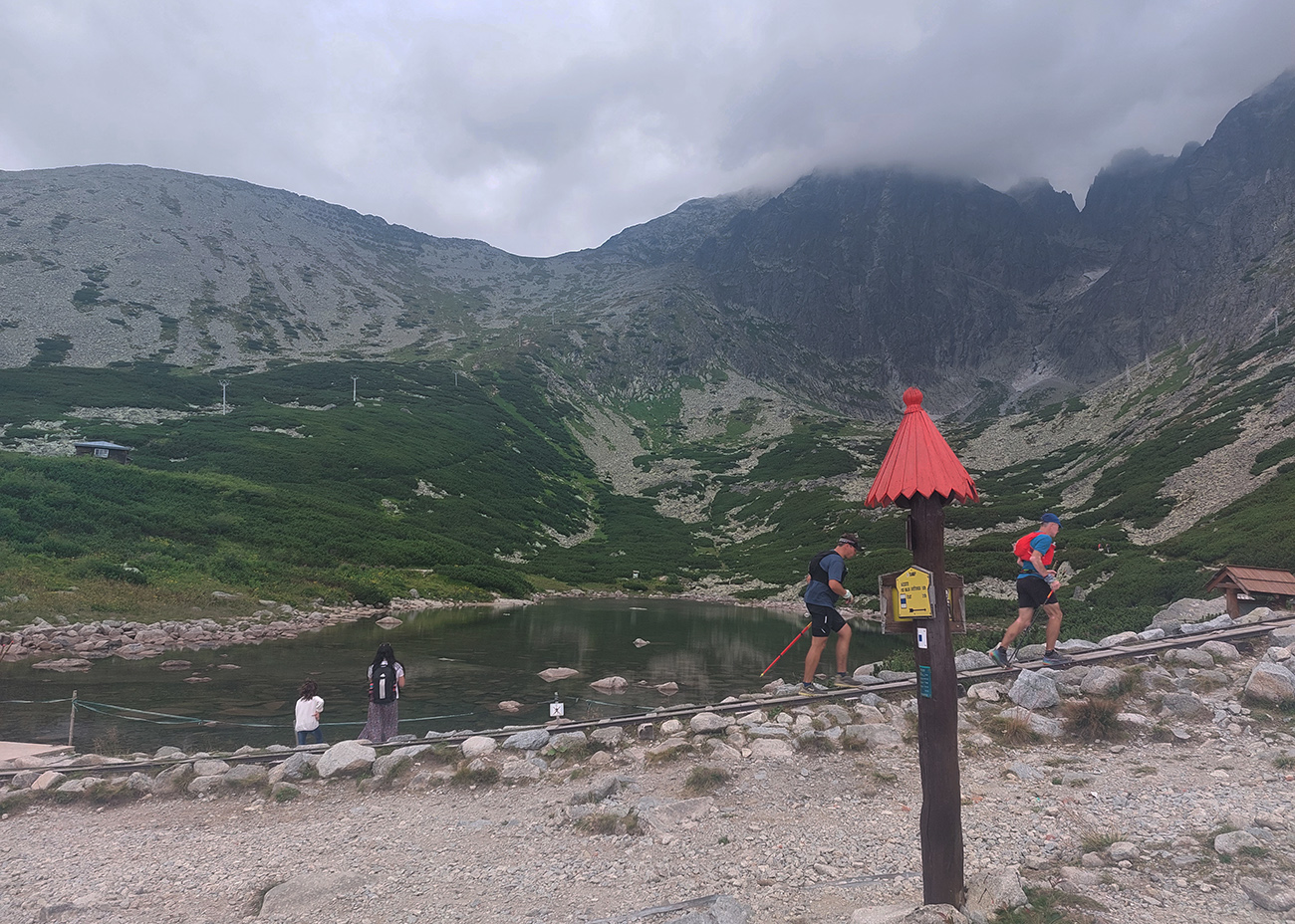 Mohutný pitný režim pri Popradskom plese – niekto z Majlátky, niekto z potoka. Lebo serpentíny na Ostrvu nie sú sranda, aj keď nejaké tie tiene sme tam už mali. Nad kopcami už sa totiž zbierali krásne kopy sivobielej šľahačky. Výhľady do Mengusovskej aj do Zalámanej však boli stále famózne. Potom to začalo byť ešte lepšie - v traverzoch Končistej a Grelachu nás začal ochladzovať aj vetrík od juhovýchodu, v Batizovskom plese sme sa poriadne vyrochnili a druhý bufet už bol neďaleko.