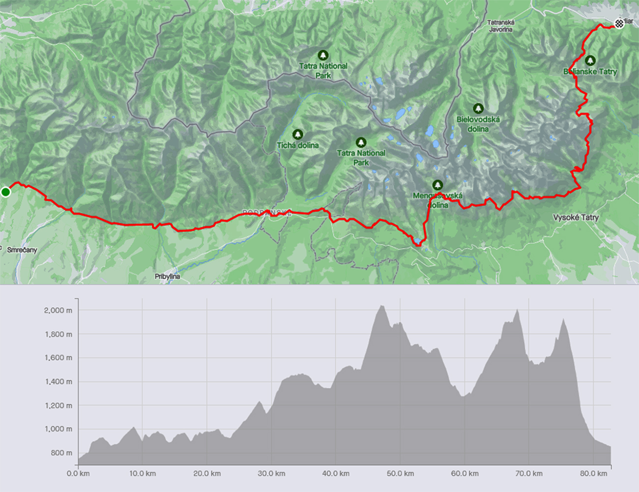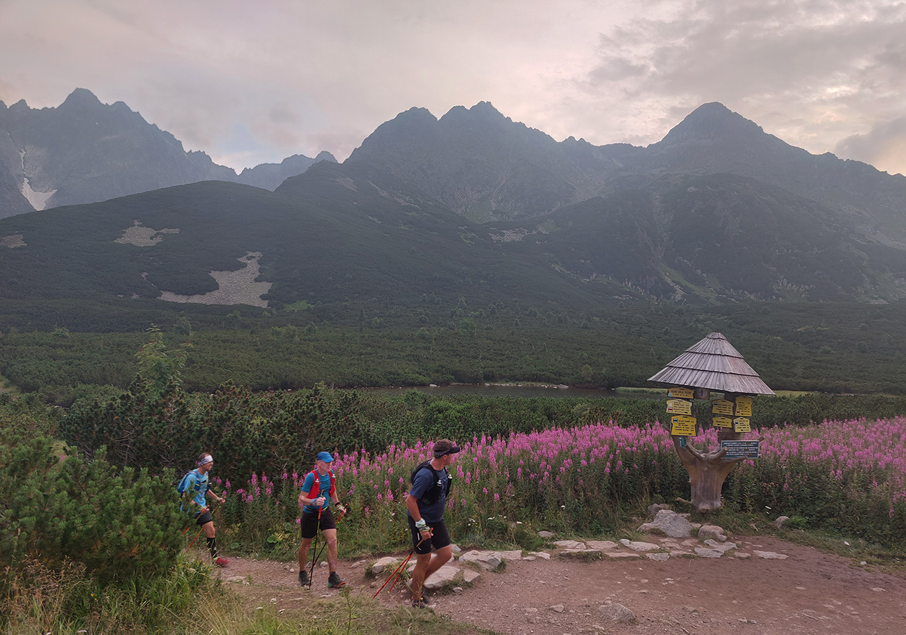 Známa červená línia po južných úbočiach Tatier, spod ústia Jaloveckej doliny do Ždiaru. Zhruba 83 km a +3500 m. Nájdu sa ale aj menšie čísla, z čias nedávnych, keď ešte Belianky neboli dostupné a TM končila pri Veľkom Bielom plese. Mal som ju „v zozname“ už dávno, jej východnú (hrboľatú) polovicu poznám dokonale z Tatranskej šelmy ultra a západnú (behavú) som si precupital vlani. Takže nadišiel čas to spojiť dokopy. Pridal sa Majo, potom Miro a deň pred sa ohlásil aj Jožo, takže sa toto vlastne mohlo volať aj „Traja ultráši a huspeninový pes v Tatrách“, lebo sa nazbierala rovnaká partia, ako už dva razy. Tých huspeninových psov bolo ale tentokrát v partii viac a výdatne tomu pomohlo počasie – horúce a dusné, také rovníkové. Našťastie ale aspoň nejaký vánok z juhovýchodu a tiene búrkových mračien popoludní. A ešte na väčšie šťastie tie búrky, ktoré nás elegantne obišli.