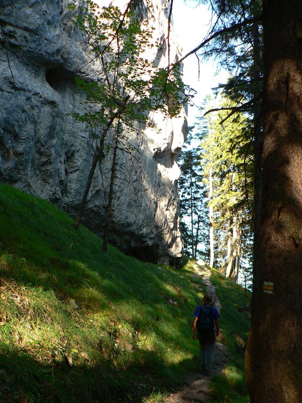 Oproti skalnatej špičke Ostrej je trávnatá plošina Tlstej ako futbalové ihrisko, aspoň sa tu počas pekných víkendov masa turistov roztratí. Cesta nazad k už spomínanému smerovníku v Konskom dole (po modrej) vedie odtiaľto popod aj ponad majestátne vápencové terasy s pohľadmi na bralá nad Konským dolom. Smerom do Gadera je to podobné, aj keď niekedy brutálnou strminou, kde je navyše za mokra dosť klzko vďaka blatu a obnaženým koreňom. Asi v polovici zostupu ale čaká odmena - mohutný skalný previs so známou jaskyňou Mažarná, ktorá je významnou archeologickou aj zoologickou lokalitou. Vchod široký, vstup zakázaný - škoda že tabuľka je tak šikovne umiestnená (a taká malá), že si ju málokto (prichádzajúc z nášho smeru) všimne. Ako my, len náhodou už po vyjdení z jaskyne. A mnohí zákaz isto ignorujú. Nad Mažarnou na suchých vápencových terasách je pár upravených miest na oddych a výhľady na sever do kotliny. Práve takéto terasy sú typickou črtou celého masívu Tlstej a na viacerých miestach ukrývajú nejeden botanický unikát. Úsek pod Mažarnou smerom do Vápennej doliny je už príjemnejší, okrem prvého strmého zostupu. Od napojenia na asfaltku v Gaderskej doline je to do dediny pohodlná polhodinka.