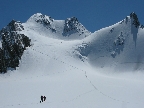 Monte Rosa 4634m - šieste miesto pre druhý najvyšší kopec Álp. Pre človeka odrasteného v slovenských horách je ľadovcový svet najvyšších štvortisícoviek priam šokujúco veľkolepý. Je to zároveň aj najjednoduchšia možnosť ako príjsť do styku s ozajstnými veľhorami. Východná stena Monte Rosy má prevýšenie vyše dvoch kilometrov a je najvyššou horskou stenou Európy. Skialpinisti sa budú však zaujímať viac o západnú stranu Monte Rosy. Tá je dostupná z Zermatu, východiskom je Monte Rosa hütte. Od chaty je to na vrchol 1870 výškových metrov. Vrchol nie je dostupný na lyžiach. Vrcholový hrebeň predstavuje exponované lezenie obtiažnosti 2+.